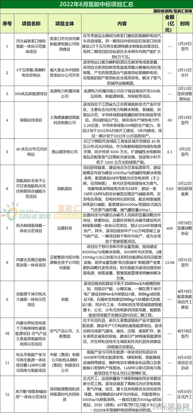 23項!超550億元投資!2022年綠氫項目匯總!自2022年以(yi)來,我國(guo)氫(qing)(qing)能產(chan)業(ye)發展如火如荼,尤其是風光儲氫(qing)(qing)一體化(hua)項目增多,綠氫(qing)(qing)項目更(geng)多進(jin)入人(ren)們(men)的視野(ye)。已經有23個綠氫(qing)(qing)相(xiang)關的項目進(jin)入簽約或開(kai)工階(jie)段(duan)。投資規模(mo)超(chao)過550億元。 年產百萬噸綠氫項目已簽約 8月20日下午(wu),“鏈(lian)”上(shang)鄂爾多斯粵港澳大灣區招商推(tui)介會(hui)在深圳市舉辦,會(hui)議(yi)期(qi)間舉行了(le)重大招商引(yin)資項(xiang)目簽約儀(yi)式,其中,烏審(shen)旗人民政府、國(guo)鴻氫(qing)能、青(qing)島城投新(xin)能源產業投資集團三方(fang)就烏審(shen)旗風光氫(qing)儲(chu)一體化項(xiang)目簽署合作框架(jia)協議(yi)。 烏審旗風(feng)(feng)光氫儲一體化項目(mu)規劃建設300兆瓦(wa)風(feng)(feng)電(dian)、100兆瓦(wa)光伏、以及年產1萬噸的電(dian)解制氫,項目(mu)總(zong)投資(zi)約(yue)30億元。 烏審旗(qi)位于內蒙古自治區最南端、鄂(e)爾多(duo)斯市(shi)西(xi)南部。今(jin)年(nian)(nian)6月(yue),鄂(e)爾多(duo)斯市(shi)發(fa)(fa)布(bu)了(le)《氫(qing)能產業發(fa)(fa)展規劃》,目標明確到2030年(nian)(nian),可再(zai)生氫(qing)規模達100萬(wan)噸/年(nian)(nian)以上,氫(qing)燃料電池車(che)輛達到2萬(wan)臺,布(bu)局300座以上加氫(qing)站。鄂(e)爾多(duo)斯正在著力將該市(shi)打造為(wei)“北方氫(qing)都(dou)”。 青島城(cheng)投(tou)新能(neng)源(yuan)產(chan)業投(tou)資(zi)(zi)(zi)集團是青島城(cheng)投(tou)集團下屬新能(neng)源(yuan)產(chan)業的投(tou)資(zi)(zi)(zi)運(yun)營主體,截(jie)至(zhi)2021年底(di),青島城(cheng)投(tou)累計在新能(neng)源(yuan)產(chan)業投(tou)資(zi)(zi)(zi)超(chao)200億元,已在全國(guo)18個省份投(tou)資(zi)(zi)(zi)運(yun)營60余個新能(neng)源(yuan)發電項目(mu),總裝機(ji)規模(mo)達300萬千瓦。 此次(ci)合作協(xie)議的(de)簽署,是國(guo)(guo)鴻(hong)氫(qing)能打(da)造共建共享(xiang)開放平臺生(sheng)態的(de)又一力證。青島(dao)城(cheng)投和鄂爾多斯市轉型發展基金均系(xi)國(guo)(guo)鴻(hong)氫(qing)能的(de)重要股東,公司與股東共同攜手,將持續為國(guo)(guo)家能源結(jie)構轉型及雙碳(tan)目標實現(xian)貢(gong)獻力量。 綠氫項目借了新能源發展的東風 氫能有助(zhu)于全(quan)球(qiu)經濟實現可持續脫碳的目標。目前我國氫氣制取(qu)以工業副產氫為主,但是可再(zai)生能源制取(qu)的綠(lv)氫項目也(ye)在陸續落實之中(zhong)。 風電(dian)光伏的快速發展與(yu)(yu)電(dian)網有限的消納(na)能力決定了超大(da)規(gui)模綠氫的時代必(bi)將到來,將為電(dian)解(jie)水制氫技術(shu)和設備供應商帶來巨大(da)的市(shi)場機遇。中國(guo)企(qi)業(ye)寶豐、中石化、中石油、中煤等也已布局(ju)萬(wan)噸級大(da)型綠氫項目,并耦合傳(chuan)統化工生產(chan)綠氨、綠色甲醇(chun)等;寶武、河(he)鋼、建龍等鋼鐵企(qi)業(ye)布局(ju)氫冶(ye)金示(shi)范項目;五大(da)示(shi)范城市(shi)群積極推進(jin)氫燃料電(dian)池熱(re)電(dian)聯供與(yu)(yu)氫能電(dian)站示(shi)范項目。 據國際能源網/氫(qing)能匯(h2-2005)不完全統計,自今年以來已經有23個綠氫(qing)項(xiang)(xiang)目(mu)。其中風(feng)光(guang)(guang)氫(qing)儲(chu)一(yi)體(ti)化和光(guang)(guang)伏+制氫(qing)項(xiang)(xiang)目(mu)尤其受到重視。風(feng)光(guang)(guang)儲(chu)氫(qing)一(yi)體(ti)化項(xiang)(xiang)目(mu)契合國家碳達峰、碳中和目(mu)標(biao)要求,是推(tui)動(dong)能源結構調整、加(jia)快節(jie)能減排的有效(xiao)途(tu)徑。 從項目地(di)點看(kan),內(nei)蒙古(gu)自治區(qu)、甘(gan)肅、新疆(jiang)等(deng)風(feng)電、光伏資源較(jiao)好的省區(qu)成(cheng)為項目布局的重點區(qu)域。因為風(feng)光儲(chu)氫一體化發展,可以最(zui)大限度降低綠氫成(cheng)本(ben),減少西北地(di)區(qu)風(feng)電光伏消(xiao)納壓力。 綜上(shang)所(suo)述,雙碳目標的實(shi)現需要氫能(neng)(neng)的參與,風電(dian)(dian)、光伏(fu)等波動性(xing)能(neng)(neng)源接(jie)入電(dian)(dian)網,會給(gei)電(dian)(dian)網安全穩定運行帶來壓力,用綠(lv)電(dian)(dian)制(zhi)氫,可(ke)以(yi)看做是一種(zhong)新(xin)的儲能(neng)(neng)方(fang)式,可(ke)以(yi)解決(jue)可(ke)再生能(neng)(neng)源發電(dian)(dian)波動性(xing)大的問題。 雖然(ran)綠電制氫(qing)目前成本比較高,但從長遠角度看(kan),這(zhe)種制氫(qing)方式更環保,隨著(zhu)新能(neng)源技(ji)術的進(jin)步,綠氫(qing)的生產成本也(ye)會(hui)逐步降低(di),屆時會(hui)有(you)更多(duo)的風光儲氫(qing)項目落(luo)地,為我國(guo)實現能(neng)源轉型(xing)出(chu)力。