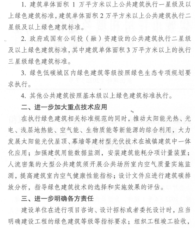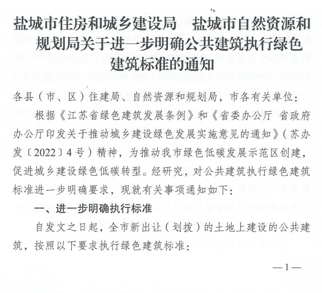9月6日,鹽城(cheng)市(shi)住房(fang)和(he)城(cheng)鄉建設局 鹽城(cheng)市(shi)自(zi)然資(zi)源和(he)規劃局發布進一步明(ming)確(que)公(gong)共建筑(zhu)執行綠(lv)色建筑(zhu)標準(zhun)的通(tong)知,通(tong)知指(zhi)出,自(zi)發文之日起,全市(shi)新出讓(劃撥(bo))的土(tu)地上建設的公(gong)共建筑(zhu),按照以下要求執行綠(lv)色建筑(zhu)標準(zhun): 1、建筑(zhu)(zhu)(zhu)(zhu)單(dan)體面積1萬平(ping)方米以上公共建筑(zhu)(zhu)(zhu)(zhu)執(zhi)行(xing)一星級及(ji)以上綠色(se)(se)建筑(zhu)(zhu)(zhu)(zhu)標準(zhun),建筑(zhu)(zhu)(zhu)(zhu)單(dan)體面積2萬平(ping)方米以上公共建筑(zhu)(zhu)(zhu)(zhu)執(zhi)行(xing)二(er)星級及(ji)以上綠色(se)(se)建筑(zhu)(zhu)(zhu)(zhu)標準(zhun)。 2、政府或(huo)國有公(gong)司投(融)資建設(she)的(de)(de)公(gong)共(gong)建筑(zhu)執(zhi)行(xing)二(er)星級(ji)及以(yi)上綠色(se)建筑(zhu)標準(zhun),其(qi)中建筑(zhu)單體(ti)面積(ji)3萬(wan)平方米(mi)以(yi)上的(de)(de)執(zhi)行(xing)三星級(ji)綠色(se)建筑(zhu)標準(zhun)。 3、綠(lv)色低碳城區內綠(lv)色建(jian)筑(zhu)等(deng)級(ji)按照綠(lv)色生態專(zhuan)項規(gui)劃要求(qiu)執行。 4、其他公(gong)共建筑按照基本級以上綠(lv)色(se)建筑標準執(zhi)行。 在執行綠色(se)建(jian)筑相(xiang)關標準規范的(de)同時,推動太(tai)陽(yang)能(neng)(neng)光熱、光電、淺層地熱能(neng)(neng)、空氣能(neng)(neng)、生(sheng)物質(zhi)能(neng)(neng)等(deng)新能(neng)(neng)源的(de)綜合利用,大力發展(zhan)太(tai)陽(yang)能(neng)(neng)光伏屋(wu)頂、幕墻等(deng)建(jian)材型光伏技術在城鎮建(jian)筑中一(yi)體化應用。 未(wei)達(da)到項目綠色(se)建(jian)筑(zhu)(zhu)等級標(biao)準的,不得出具施(shi)(shi)工圖審(shen)查合格證書。工程質量(liang)監督機構應(ying)當依據相關規范標(biao)準,對綠色(se)建(jian)筑(zhu)(zhu)施(shi)(shi)工質量(liang)進行監管。對未(wei)按(an)標(biao)準實施(shi)(shi)的項目,不予竣(jun)工備案。 原文如下: