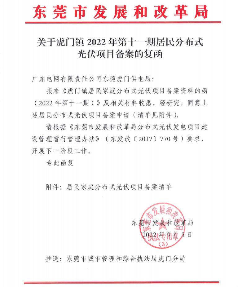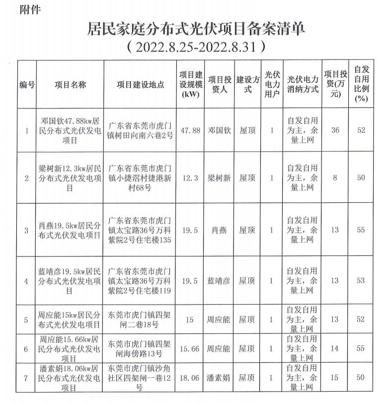 9月8日,廣東省東莞市人民政府公布虎門鎮2022年第十一期居民分布式光伏項目備案清單,共計7個戶用光伏項目,總規模147.9kW。