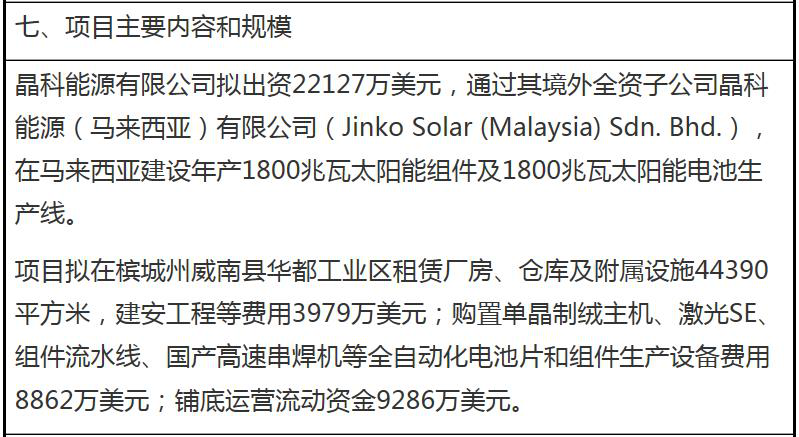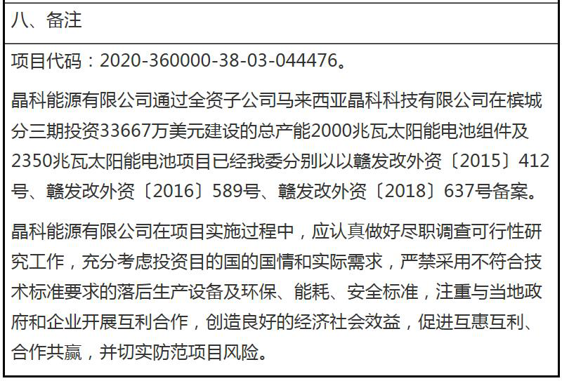 11月5日,江(jiang)西省發改委發布《關于同意晶科(ke)能源有限(xian)公司投(tou)資馬(ma)來西亞建(jian)設年產(chan)1800兆瓦太陽能電池(chi)組件及1800兆瓦太陽能電池(chi)生產(chan)線四期(qi)項目備案的通知(zhi)(zhi)》,該通知(zhi)(zhi)書有效期(qi)2年。 根據備(bei)案,晶科(ke)能源(yuan)(yuan)擬出資22127萬美元,通(tong)過其境外(wai)全資子公司晶科(ke)能源(yuan)(yuan)(馬來西亞)有限(xian)公司在(zai)馬來西亞檳城建設年(nian)產1.8GW光伏組件及1.8GW太陽能電池(chi)生產線。 具(ju)體如(ru)下: 江西(xi)省發展改革委關于同(tong)意晶(jing)科能(neng)源有限公(gong)司投資馬來(lai)西(xi)亞建設年產1800兆瓦太陽能(neng)電池組件及1800兆瓦太陽能(neng)電池生產線四期(qi)項目備案的通知 贛發改外資〔2020〕945號 上饒市發展(zhan)改(gai)革(ge)委: 報來(lai)《關(guan)于(yu)晶科能源(yuan)有限(xian)(xian)公(gong)司(si)在(zai)馬來(lai)西亞投資(zi)建設年產(chan)1.8吉瓦(wa)太(tai)陽(yang)能組件及1.8吉瓦(wa)太(tai)陽(yang)能電池(chi)(chi)生(sheng)(sheng)產(chan)線項目(mu)申請備案(an)的請示(shi)》(饒發(fa)改(gai)財(cai)外(wai)字〔2020〕29號(hao))收悉。根據《江西省企業境外(wai)投資(zi)管理辦法》(贛發(fa)改(gai)外(wai)資(zi)〔2018〕565號(hao)),對晶科能源(yuan)有限(xian)(xian)公(gong)司(si)投資(zi)馬來(lai)西亞建設年產(chan)1800兆瓦(wa)太(tai)陽(yang)能電池(chi)(chi)組件及1800兆瓦(wa)太(tai)陽(yang)能電池(chi)(chi)生(sheng)(sheng)產(chan)線四(si)期(qi)項目(mu)(具體情況見背頁)予以備案(an)。本通知(zhi)書有效期(qi)2年。 項目(mu)實施過程中,按(an)規定(ding)需要履(lv)行變更、延期等手續(xu)的,請(qing)及時向我(wo)(wo)(wo)委(wei)(wei)提出;發生(sheng)重大(da)(da)不(bu)利情(qing)況(kuang)的,請(qing)按(an)規定(ding)向我(wo)(wo)(wo)委(wei)(wei)提交(jiao)重大(da)(da)不(bu)利情(qing)況(kuang)報告(gao)(gao)表;不(bu)得(de)違反我(wo)(wo)(wo)國(guo)法律法規,不(bu)得(de)威脅或損害我(wo)(wo)(wo)國(guo)國(guo)家利益(yi)和(he)國(guo)家安全。請(qing)在(zai)項目(mu)完成(cheng)之日(ri)起20個工作日(ri)內提交(jiao)項目(mu)完成(cheng)情(qing)況(kuang)報告(gao)(gao)表。 如對本通知書(shu)持有異(yi)議,可以在收到本通知書(shu)之日起(qi)60日內(nei)(nei)向(xiang)我委申請(qing)行(xing)政復議,或者在6個月內(nei)(nei)向(xiang)人(ren)民法院提起(qi)行(xing)政訴訟。 2020年(nian)11月3日 上一篇: 華為與江西電建簽訂全面合作協議