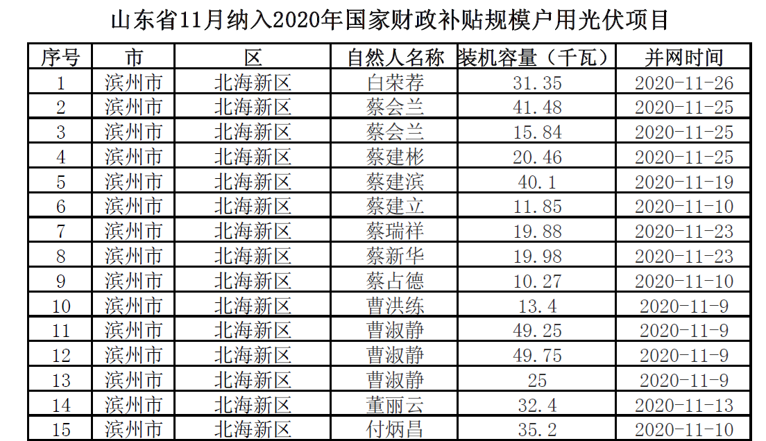 日前(qian),國網山東省電(dian)力公司發布公告《11月份山東省納入(ru)2020年國家財政補貼(tie)規模戶用光伏(fu)項目(mu)》,公告顯(xian)示11月(yue)份山東省納入(ru)2020年(nian)國(guo)家(jia)財(cai)政補貼規模(mo)戶用(yong)光(guang)伏(fu)項目(mu)裝機容(rong)量總計(ji)(ji)1.7GW,共(gong)計(ji)(ji)66951戶。1-11月(yue),累計(ji)(ji)高達(da)4.57GW。 以下為納入補(bu)貼部分項(xiang)目節(jie)選