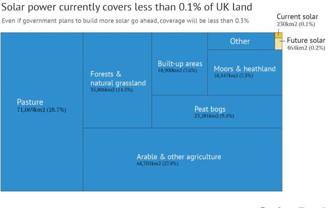 英國的太陽能發電裝機目前的總容量約為14吉瓦。根據貿易機構Solar Energy UK的分析,其中9.6吉瓦的容量為地面安裝的光伏電站。每兆瓦的電力需要大約6英畝的土地,這意味著目前的地面安裝太陽能覆蓋面積估計為230平方公里,這只占英國國土面積的不到0.1%。 相比之下,農業用地覆蓋了英國面積的56%,其中約70000平方公里用于放牧牛羊,約67000平方公里用于種植谷物和豆類。如上圖所示,現有的太陽能光伏(深黃色)比目前使用的土地比高爾夫球場(紅色)和機場(橙色)還少,后者分別占地1256平方公里和493平方公里。 今年4月,英國政府發布了一項新的能源安全戰略,計劃到2035年將太陽能發電量增加5倍的計劃,地面太陽能光伏電站裝機將再增加38吉瓦。隨著太陽能技術變得更加高效,所需面積低于現有技術。例如,雙面面板可以利用光伏面板兩側的陽光。 英國商業、能源和工業戰略部提出,未來的太陽能光伏發電將需要2到4英畝的土地來生產1兆瓦的電力。假設平均每1兆瓦需要3英畝,如果英國實現將太陽能發電量增加五倍的目標,到2035年英國地面光伏將覆蓋近700平方公里的土地,相當于英國陸地面積的0.3%。 地面光伏電站建在幾種類型的土地上。即使未來所有的地面安裝太陽能都建在農田上,土地使用變化對英國糧食生產的影響也很小。這可以用一個極端的例子來說明:如果滿足英國地面安裝太陽能光伏目標的所有700平方公里的土地都使用了原來用于種植小麥的土地,而英國平均一公頃土地每年生產大約8噸小麥。這意味著,理論上700平方公里可以生產56萬噸小麥。根據2021年的數據,即使在這個極端的例子中,這也只占英國小麥年產量的4%。 下一篇: 迪拜啟動900MW光伏招標!
