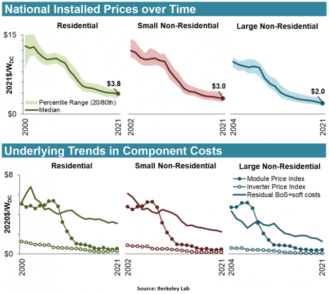 根據勞倫斯伯克利國家實驗室(LBL)日前發布的調查數據,在過去五年,美國大多數州的光伏系統安裝價格中位數同比下降,戶用光伏系統的價格每年下降高達0.2美元/W。非戶用光伏系統的價格每年下降0.1美元/W~0.3美元/W。 這份調查報告基于截止到2021年美國安裝的所有光伏系統的數據,以及2022年上半年的初步數據。 該報告還指出,美國的光伏+儲能項目數量大幅增加,2021年安裝的戶用光伏系統的10%和非戶用光伏系統的5%都配套安裝了電池儲能系統。 在過去的二十年,美國安裝的戶用光伏和非戶用光伏系統的規模有所增加,戶用光伏系統的裝機容量的中位數為7kW,大多數的裝機容量為4kW到10kW之間;而非戶用光伏系統裝機容量的中位數在2021年達到33kW。 報告聲稱,非戶用光伏系統的裝機容量也有所增加,盡管近年來光伏系統裝機容量增長趨于穩定,2021年的中位數為33kW,2021年20%的光伏系統裝機容量高于150kW,平均裝機容量為255 kW。 勞倫斯伯克利國家實驗室(LBL)表示,在這份報告調查的66個實體和30個州中,加州在2021年安裝3000個戶用光伏系統,從而主導美國戶用光伏市場。 在2021年的戶用光伏領域,94%是帶有模塊級電力電子(MLPE)產品的光伏系統,其中包括微型逆變器和直流優化器。81%的非戶用光伏系統采用模塊級電力電子(MLPE)產品。 美國光伏系統的安裝平均價格每年下降約0.4美元/W,但自從2013年以來,價格下降幅度逐漸收窄,此后美國各個細分光伏市場的平均價格下降幅度為0.1美元/W~0.2美元/W。 價格收窄主要是組件成本有所上漲,但也反映了不斷增長的客戶獲取成本,以及嵌入在系統剩余余額(BoS)和軟成本中的其他成本。 報告指出,持續的供應鏈限制繼續對價格施加壓力,但價格數據按實際美元計算的通貨膨脹調整部分吸收了一些壓力。2022年上半年戶用和非戶用光伏項目的名義價格中位數上漲。 光伏組件的效率 研究報告聲稱,光伏組件有效率也有所上升,其中戶用炮僚和非戶用光伏系統的組件效率中位數從2022年的13.6%提高到2021年的20.1%。效率提高歸因于單晶光伏組件在2021年占到89%~98%的市場份額,具體取決于細分市場。 使用單鈍化發射器后單元(PERC)技術也是提高光伏組件效率的因素之一。而在2021年安裝的大多數光伏系統的效率為19%至21%。 德克薩斯州在2021年2月遭遇冬季風暴的襲擊之后,戶用光伏+儲能項目的采用率有所上升,因為在CenterPoint公司的服務區域增加了三倍多(從大約300個增加到1000個),在Oncor公司的服務區域增加了六倍多(從200個增加到1300個)。 光伏+儲能項目 2021年,美國安裝的光伏+儲能項目數量快速增長,新建戶用光伏系統的10%和非戶用光伏系統的5%都配套安裝了電池儲能系統。夏威夷的戶用光伏+儲能系統的安裝率為93%,非戶用光伏+儲能系統的安裝率為59%。擁有數量最多的光伏+儲能系統的加利福尼亞州的戶用光伏+儲能系統的安裝率為11%,非戶用光伏+儲能系統的安裝率為5%。 2021年,戶用光伏系統配套安裝的電池儲能系統裝機容量也有所增加,這反映了對備用電源的需求不斷增長,在所有的戶用光伏+儲能系統中,42%配套安裝了裝機容量10kW以上的電池儲能系統。 獨立安裝光伏系統與光伏+儲能系統安裝價格的比較 在獨立安裝的光伏系統中,小型戶用光伏系統和非戶用光伏系統的安裝價格相差近2美元/W,大型非戶用光伏系統的安裝價格約為1.5美元/W。 在2021年安裝的配套安裝了電池儲能系統的戶用光伏系統中,儲能系統的平均安裝成本約為1,200美元/kWh,相當于戶用光伏系統的成本額外增加了1.9美元/W。相比之下,加州自發電激勵計劃(SGIP)資助的類似規模的戶用儲能系統的成本中位數為1,149美元/kWh。
