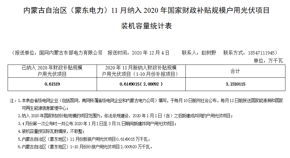 日前,國(guo)網內蒙古東(dong)(dong)部電力有限(xian)公司對(dui)2020年11月(yue)(yue)份戶(hu)(hu)用(yong)(yong)光(guang)伏(fu)(fu)發電項目進行了梳理(li),11月(yue)(yue)蒙東(dong)(dong)電網共計并網戶(hu)(hu)用(yong)(yong)光(guang)伏(fu)(fu)項目6.15MW,1-10月(yue)(yue)不報戶(hu)(hu)用(yong)(yong)項目20MW,累計戶(hu)(hu)用(yong)(yong)光(guang)伏(fu)(fu)裝(zhuang)機32.31MW。