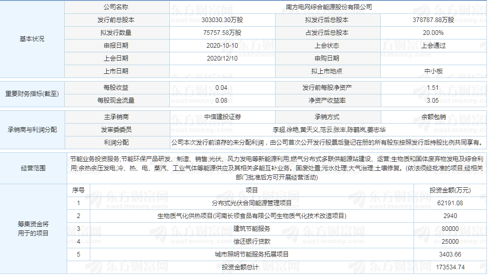 據證監會12月(yue)10日消息,南方電網綜合(he)能(neng)源股份有限公(gong)司(si)首發過會。 南網能源(yuan)擬(ni)于(yu)深交所中(zhong)小板(ban)上(shang)市(shi),計劃公(gong)開發行(xing)股(gu)份不(bu)超過(guo)7.58億股(gu),擬(ni)募集資金15.66億元,分別用于(yu)建筑(zhu)節能服務(wu)拓展項目、分布式光伏合同能(neng)源管理項(xiang)目、生(sheng)物質(zhi)氣化(hua)(hua)供熱項(xiang)目(河(he)南(nan)長領食品有限公司生(sheng)物質(zhi)氣化(hua)(hua)技(ji)術改造項(xiang)目)、城(cheng)市照明節能(neng)服(fu)務拓展(zhan)項(xiang)目、償還銀行(xing)貸款。 據(ju)了解,南方電網綜(zong)合能(neng)(neng)(neng)(neng)源(yuan)股份有限公(gong)司(si)主要(yao)從事節能(neng)(neng)(neng)(neng)服務,為客(ke)(ke)(ke)戶(hu)(hu)能(neng)(neng)(neng)(neng)源(yuan)使用(yong)提供診斷、設計、改(gai)造、綜(zong)合能(neng)(neng)(neng)(neng)源(yuan)項(xiang)目投資及運(yun)營維護等一站式綜(zong)合節能(neng)(neng)(neng)(neng)服務。公(gong)司(si)根據(ju)客(ke)(ke)(ke)戶(hu)(hu)所在(zai)行業特(te)性、外部環(huan)(huan)境資源(yuan)稟賦情況(kuang)、客(ke)(ke)(ke)戶(hu)(hu)自(zi)身經(jing)營特(te)點和(he)節能(neng)(neng)(neng)(neng)減排需(xu)求(qiu),通過整合先(xian)進節能(neng)(neng)(neng)(neng)環(huan)(huan)保技(ji)術(shu),充分(fen)利(li)用(yong)高效(xiao)節能(neng)(neng)(neng)(neng)環(huan)(huan)保設備,轉變客(ke)(ke)(ke)戶(hu)(hu)用(yong)能(neng)(neng)(neng)(neng)來(lai)源(yuan)、用(yong)能(neng)(neng)(neng)(neng)方式,在(zai)滿足客(ke)(ke)(ke)戶(hu)(hu)對各類能(neng)(neng)(neng)(neng)源(yuan)(電、熱、冷、蒸(zheng)汽(qi)、壓(ya)縮氣(qi)體等)需(xu)求(qiu)的(de)同時,降低客(ke)(ke)(ke)戶(hu)(hu)用(yong)能(neng)(neng)(neng)(neng)投資風險(xian),提升(sheng)客(ke)(ke)(ke)戶(hu)(hu)能(neng)(neng)(neng)(neng)源(yuan)使用(yong)效(xiao)率、減少能(neng)(neng)(neng)(neng)源(yuan)費(fei)用(yong)和(he)碳排放,從而(er)實現(xian)良好的(de)經(jing)濟效(xiao)益和(he)社會效(xiao)益。 公司構建了(le)覆蓋節(jie)(jie)(jie)能(neng)(neng)(neng)設(she)計、改造、服務(wu)(wu)等綜合(he)節(jie)(jie)(jie)能(neng)(neng)(neng)服務(wu)(wu)體系,打造了(le)服務(wu)(wu)經濟社會發(fa)展的(de)(de)綠(lv)色平臺,建成了(le)一大批在全國(guo)有影響力(li)的(de)(de)大型節(jie)(jie)(jie)能(neng)(neng)(neng)減排(pai)示范項目,為(wei)客(ke)戶提供一攬子的(de)(de)綜合(he)能(neng)(neng)(neng)源利用(yong)服務(wu)(wu),是全國(guo)領先(xian)的(de)(de)工業節(jie)(jie)(jie)能(neng)(neng)(neng)、建筑(zhu)節(jie)(jie)(jie)能(neng)(neng)(neng)、城市照明(ming)節(jie)(jie)(jie)能(neng)(neng)(neng)投(tou)資運營(ying)服務(wu)(wu)商。公司擁(yong)有中國(guo)節(jie)(jie)(jie)能(neng)(neng)(neng)協會節(jie)(jie)(jie)能(neng)(neng)(neng)服務(wu)(wu)產業委(wei)員會頒發(fa)的(de)(de)公共設(she)施(shi)節(jie)(jie)(jie)能(neng)(neng)(neng)領域5A級證書、工業節(jie)(jie)(jie)能(neng)(neng)(neng)領域5A級證書、建筑(zhu)節(jie)(jie)(jie)能(neng)(neng)(neng)領域5A級證書,是國(guo)家發(fa)改委(wei)備案(an)、國(guo)家工信部推薦的(de)(de)節(jie)(jie)(jie)能(neng)(neng)(neng)服務(wu)(wu)公司。 (圖截取自東方財富網) 公司名稱:南方電網綜(zong)合能(neng)源股(gu)份有(you)限公司 統一社會信用代碼:914400005666840936 法定代表(biao)人:秦(qin)華(hua) 有限公司(si)成立(li)日期(qi):2010 年 12 月 29 日 股份(fen)公司設立日期(qi):2019 年 9 月 24 日 注冊資本:303,030.3030 萬元 住所:廣東(dong)省廣州開發(fa)區香山路(lu) 2 號(hao)、科翔路(lu) 11 號(hao)(自編 1 棟(dong) 1-01 房) 經營范圍:節(jie)能業務(wu)投資服務(wu);節(jie)能環(huan)保產(chan)品研發(fa)(fa)、制造(zao)、銷售;光伏、風力發(fa)(fa)電(dian)(dian)等新能源利(li)(li)用;燃氣(qi)分布式多聯供能源站建設、運營;生(sheng)物質(zhi)和固(gu)體廢棄(qi)物發(fa)(fa)電(dian)(dian)及(ji)綜(zong)合利(li)(li)用;余(yu)熱(re)余(yu)壓發(fa)(fa)電(dian)(dian);冷、熱(re)、電(dian)(dian)、蒸汽、工業氣(qi)體等能源供應及(ji)其相關(guan)多能互補業務(wu)。固(gu)廢處置;污水處理;大氣(qi)治理;土(tu)壤修復(fu)。(依(yi)法(fa)須(xu)經批準的項目,經相關(guan)部門批準后方(fang)可開(kai)展經營活動) 所屬行業(ye):根(gen)據中(zhong)國(guo)證監會發(fa)布的(de)《上市公(gong)司(si)行業(ye)分(fen)類(lei)(lei)指引》(2012 年(nian)修訂)以及國(guo)家統(tong)計局發(fa)布的(de)《國(guo)民經濟行業(ye)分(fen)類(lei)(lei)》(GB/T4754-2017),公(gong)司(si)從屬行業(ye)屬于“科學研究和(he)技(ji)術(shu)服(fu)務(wu)業(ye)”門類(lei)(lei)(M)中(zhong)的(de)“科技(ji)推廣(guang)和(he)應(ying)用(yong)服(fu)務(wu)業(ye)”大類(lei)(lei)(M75)中(zhong)的(de)“節能技(ji)術(shu)推廣(guang)服(fu)務(wu)”。