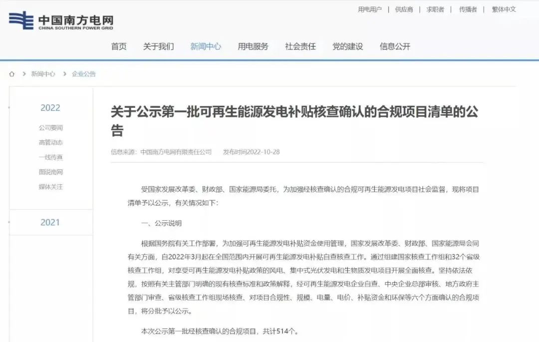 10月28日,根據信用中國發布,受國家發改委、財政部、國家能源局委托,為加強經核查確認的合規可再生能源發電項目社會監督,現將公示第一批經核查確認的項目,共計7334個。 根據公示內容,自2022年3月起在全國范圍內開展可再生能源發電補貼自查核查工作。通過組建國家核查工作組和32個省級核查工作組,對享受可再生能源發電補貼政策的風電、集中式光伏發電和生物質發電項目開展全面核查。堅持依法依規,按照相關主管部門明確的現有核查標準和政策解釋,經可再生能源發電企業自查、中央企業總部審核、地方政府主管部門審查、省級核查工作組現場核查,對項目合規性、規模、電量、電價、補貼資金和環保等六個方面確認的合規項目。 原文見下: 關于公示第一批可再生能源發電補貼核查確認的合規項目清單的公告 一、公示說明 根據國務院有關工作部署,為加強可再生能源發電補貼資金使用管理,國家發展改革委、財政部、國家能源局會同有關方面,自2022年3月起在全國范圍內開展可再生能源發電補貼自查核查工作。通過組建國家核查工作組和32個省級核查工作組,對享受可再生能源發電補貼政策的風電、集中式光伏發電和生物質發電項目開展全面核查。堅持依法依規,按照相關主管部門明確的現有核查標準和政策解釋,經可再生能源發電企業自查、中央企業總部審核、地方政府主管部門審查、省級核查工作組現場核查,對項目合規性、規模、電量、電價、補貼資金和環保等六個方面確認的合規項目,將分批予以公示。 本次公示第一批經核查確認的合規項目,共計7344個。 二、公示期限 2022年10月28日至2022年11月7日。 三、舉報投訴方式 如對公示項目有異議,請在公示期限內進行舉報投訴,為提高舉報投訴信息記錄效率及準確性,建議優先選擇“在線舉報投訴”方式進行反饋,并提供真實姓名、身份證號、聯系方式及相關證明材料,逾期不再受理。公示期滿后,舉報投訴信息將統一移交相關部門研究處理。國家電網公司、南方電網公司將根據相關部門工作進展公布合規項目清單。 國家電網區域: 在線舉報投訴鏈接://sgnec.sgcc.com.cn/atlas/greenObject 舉報投訴郵箱:kzsny@sgdt.sgcc.com.cn 南方電網區域: 在線舉報投訴鏈接://218.19.148.199:1122/ 舉報投訴郵箱:kzsny@csg.cn 附件:1.國家電網區域第一批經核查確認的合規項目(含地方電網項目) 2.南方電網區域第一批經核查確認的合規項目(含地方電網項目)
