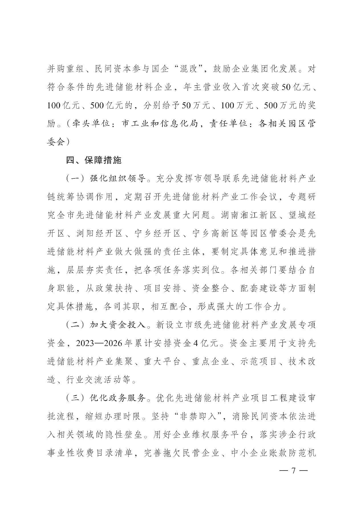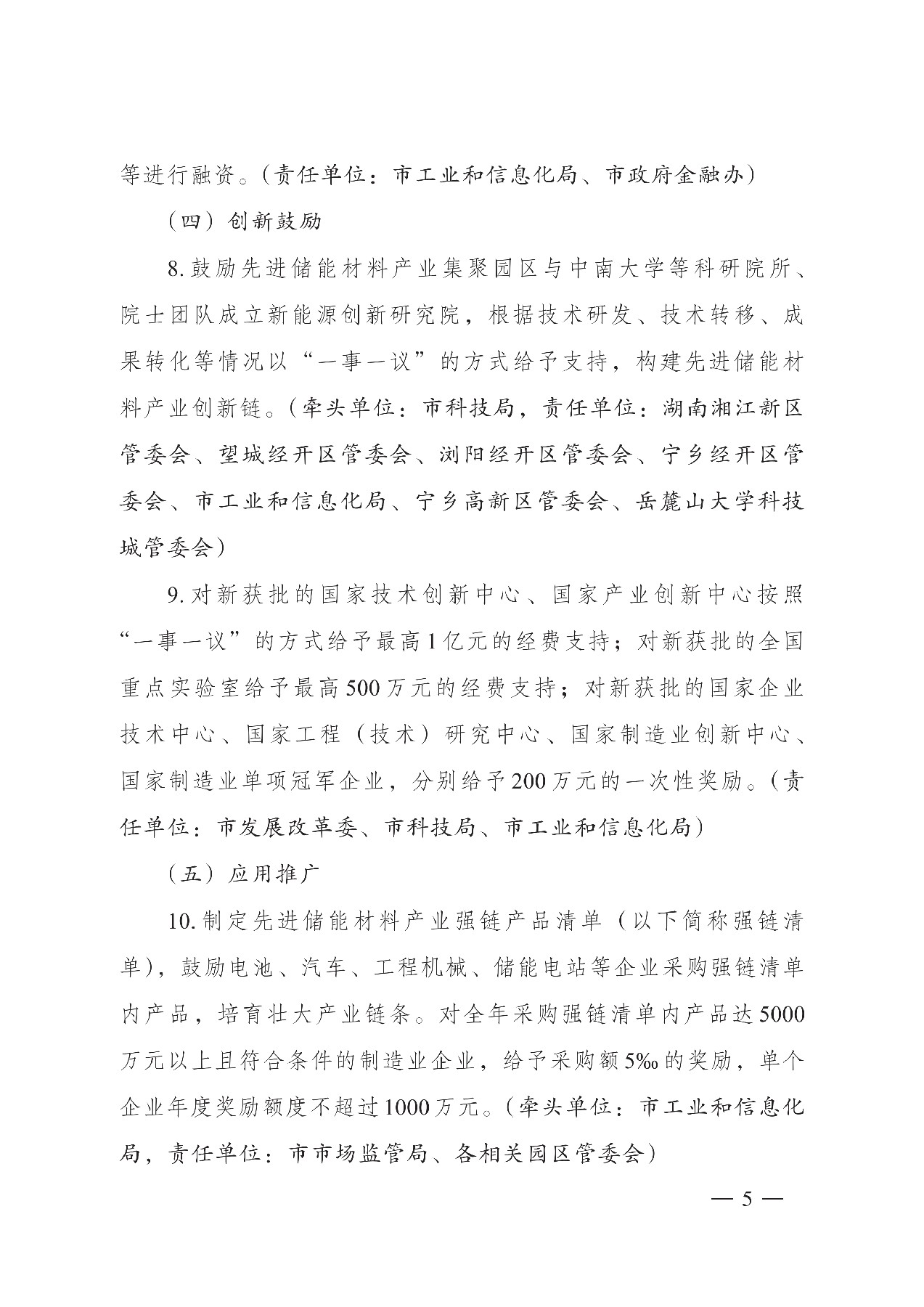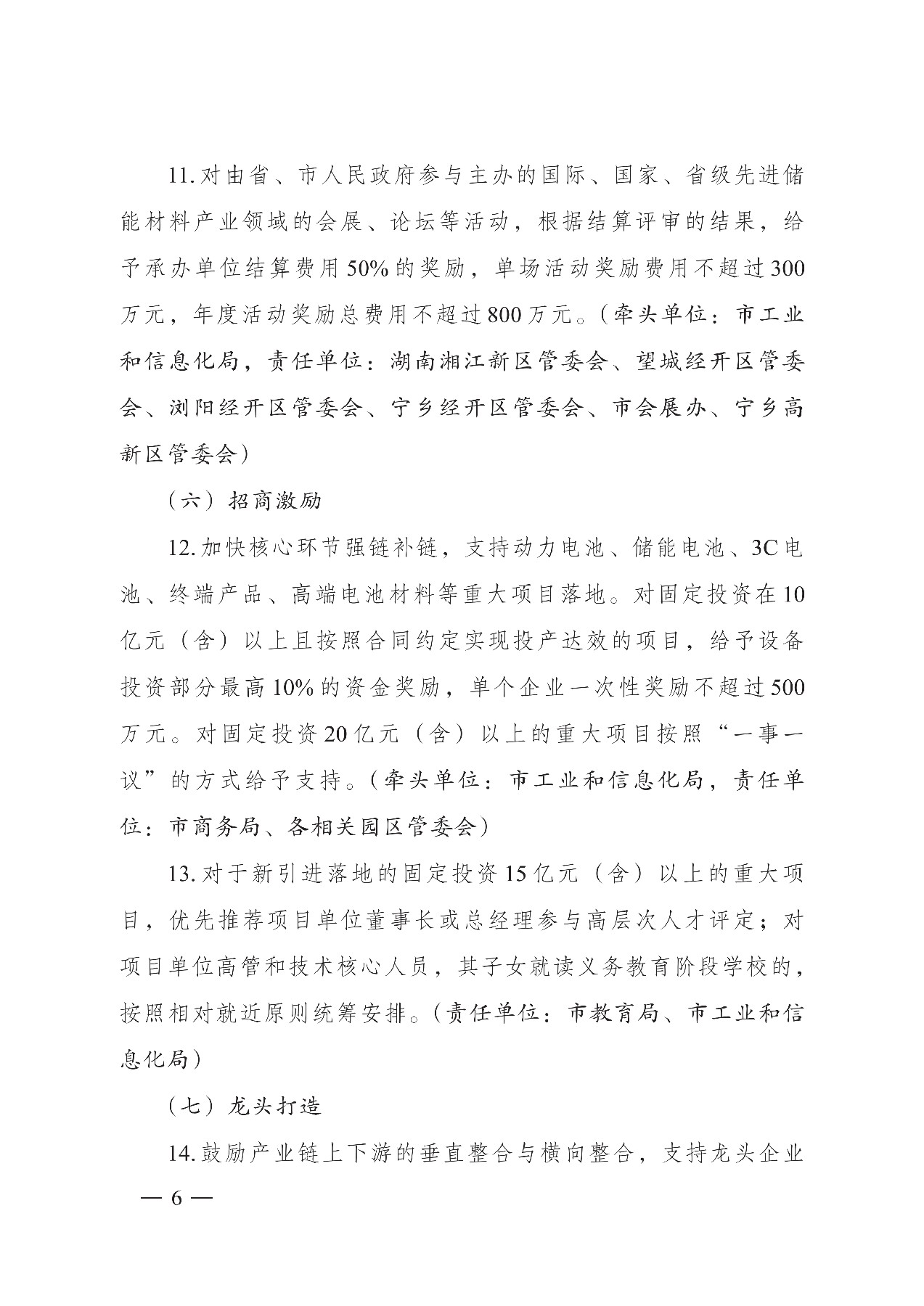 湖南長沙:補貼資金4億元!支持先進儲能材料產業做大做強!11月7日,長沙市人(ren)民政府(fu)辦公廳(ting)發(fa)布關于支持先進產業做(zuo)大(da)做(zuo)強的實施意(yi)見。 意見中(zhong)指出,新設立市級先進儲(chu)能(neng)材(cai)料(liao)產(chan)業(ye)發展專項資金(jin),2023-2026年累計安排資金(jin)4億元。將在用電支持、供(gong)地、金(jin)融(rong)服務、創新鼓勵、應用推廣(guang)、招(zhao)商(shang)激勵、龍頭打造(zao)七個方面,對先進儲(chu)能(neng)材(cai)料(liao)產(chan)業(ye)提供(gong)政(zheng)策支持。 根(gen)據企(qi)業(ye)產(chan)值規模(mo)、行業(ye)地(di)位、產(chan)業(ye)鏈所處(chu)位置、自(zi)建(jian)等因(yin)素科(ke)學確(que)(que)定(ding)重點企(qi)業(ye)名單,優先(xian)保障產(chan)業(ye)鏈關鍵環節企(qi)業(ye)用電(dian)需求(qiu),確(que)(que)保產(chan)業(ye)鏈供應鏈安全穩定(ding)。 根據營(ying)業(ye)收入情況,對符合條件的(de)規模(mo)以(yi)上先進(jin)儲能(neng)材料企(qi)業(ye),按上年(nian)度(du)用(yong)電(dian)(dian)增量每千瓦時給(gei)予0.15元獎勵(li);對新引進(jin)且完成固定資產投(tou)資1億元(含(han))以(yi)上的(de)先進(jin)儲能(neng)材料企(qi)業(ye)按自投(tou)產之日起(qi)滿1年(nian)實際用(yong)電(dian)(dian)量的(de)30%進(jin)行(xing)計(ji)算,每千瓦時給(gei)予0.15元獎勵(li)。單個企(qi)業(ye)年(nian)度(du)獎勵(li)額(e)度(du)不超過1000萬元。 支(zhi)持企(qi)業利用儲(chu)能電(dian)站降低(di)用電(dian)成本,按儲(chu)能電(dian)站的實際放電(dian)量給予儲(chu)能電(dian)站運營(ying)主體0.3元/千瓦時的獎勵,單個企(qi)業年度(du)獎勵額度(du)不超(chao)過(guo)300萬元。 制定先進儲(chu)(chu)能材料產(chan)業(ye)強鏈(lian)(lian)產(chan)品(pin)(pin)(pin)清(qing)單(dan),鼓(gu)勵(li)電池(chi)、汽(qi)車、工程機械(xie)、儲(chu)(chu)能電站等(deng)企業(ye)采購強鏈(lian)(lian)清(qing)單(dan)內產(chan)品(pin)(pin)(pin),培育壯大產(chan)業(ye)鏈(lian)(lian)條。對全年(nian)(nian)采購強鏈(lian)(lian)清(qing)單(dan)內產(chan)品(pin)(pin)(pin)達 5000 萬元(yuan)以(yi)上且符合條件(jian)的制造業(ye)企業(ye),給予采購額(e)5%的獎勵(li),單(dan)個(ge)企業(ye)年(nian)(nian)度獎勵(li)額(e)度不超過(guo)1000萬元(yuan)。 加快核(he)心環節強(qiang)鏈(lian)補鏈(lian),支持動力電(dian)(dian)池、儲能(neng)電(dian)(dian)池、3C電(dian)(dian)池、終端產(chan)品、高(gao)端等重大項(xiang)(xiang)目(mu)落地。對固定(ding)投(tou)(tou)(tou)資(zi)在10億元 (含)以上且按(an)照合同約定(ding)實現投(tou)(tou)(tou)產(chan)達效的項(xiang)(xiang)目(mu),給(gei)予設備投(tou)(tou)(tou)資(zi)部(bu)分最(zui)高(gao)10%的資(zi)金獎勵(li),單個企(qi)業一次(ci)性獎勵(li)不超過 500萬元。 鼓勵(li)(li)產業(ye)鏈(lian)上(shang)下游的垂直整合與橫向整合,支持(chi)龍頭企(qi)業(ye)并購重(zhong)組、民間資本(ben)參與國(guo)企(qi)“混改”,鼓勵(li)(li)企(qi)業(ye)集(ji)團化(hua)發展。對符合條件的先進儲能材料企(qi)業(ye),年主(zhu)營(ying)業(ye)收入首次突破50億(yi)元(yuan)、100億(yi)元(yuan)、500億(yi)元(yuan)的,分別給予50萬(wan)元(yuan)、100萬(wan)元(yuan)、500萬(wan)元(yuan)的獎(jiang)勵(li)(li)。 原文如下: