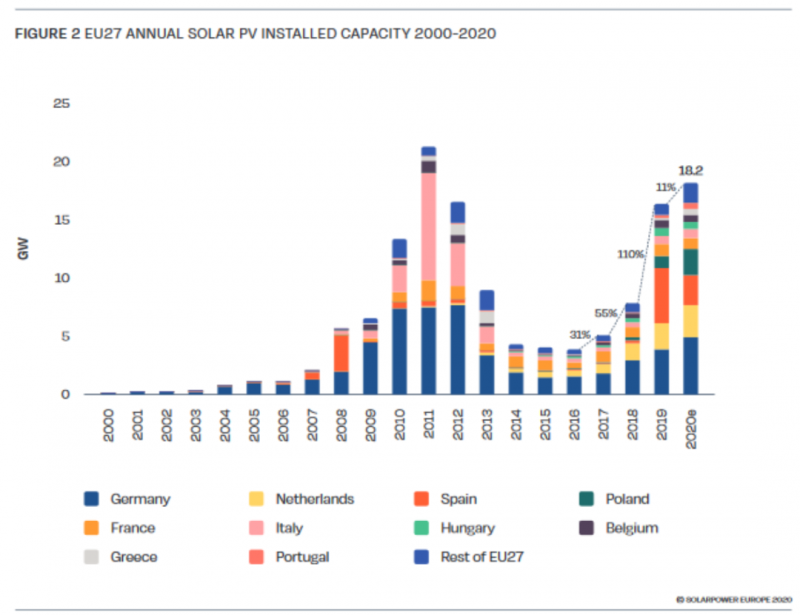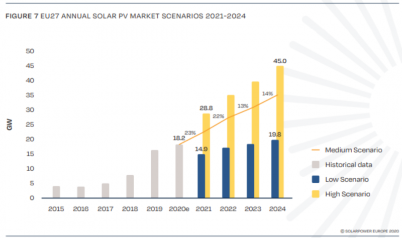 歷時7年,中(zhong)歐(ou)投(tou)資(zi)(zi)(zi)協定(ding)談判(pan)完(wan)美收官。2020年12月30日,中(zhong)歐(ou)領導人共同宣布如期完(wan)成中(zhong)歐(ou)投(tou)資(zi)(zi)(zi)協定(ding)談判(pan)。該談判(pan)旨在(zai)取代中(zhong)國和(he)歐(ou)盟成員國現有(you)的雙邊投(tou)資(zi)(zi)(zi)條約,構建(jian)統(tong)一的中(zhong)歐(ou)雙邊投(tou)資(zi)(zi)(zi)制度。 中(zhong)(zhong)歐(ou)(ou)是當(dang)今世界兩大(da)重要經濟體。2019年,歐(ou)(ou)盟為我國(guo)第一大(da)出口伙伴(ban)、第二(er)大(da)進口伙伴(ban)。該協定的簽署將(jiang)進一步擴大(da)雙(shuang)邊市場開放,推進貿(mao)易(yi)投(tou)資自由化,并帶動相(xiang)關行業的出口貿(mao)易(yi)。在(zai)此次歐(ou)(ou)洲(zhou)開放領(ling)域中(zhong)(zhong),中(zhong)(zhong)歐(ou)(ou)投(tou)資協定將(jiang)鎖定現(xian)有的中(zhong)(zhong)國(guo)對歐(ou)(ou)投(tou)資市場準入權,其中(zhong)(zhong)確保(bao)開放歐(ou)(ou)洲(zhou)能源等領(ling)域,這將(jiang)為中(zhong)(zhong)國(guo)光伏出口歐(ou)(ou)洲(zhou)市場帶來更大(da)的機(ji)遇。 據SolarPower Europe發布的最新歐盟光伏市場展望報告中顯示,盡管COVID-19疫情給歐洲帶來了巨大影響,但是光伏發電在2020年顯示出強大的韌性,歐盟成員國新增光伏裝機容量為18.2 GW,比上一年增長了11%,是自2011年以來增長最快的一年。歐盟累計裝機容量達到了137.2GW,增長了15%。 Solar Power Europe預(yu)測,接(jie)下來(lai)的四(si)年(nian)歐洲光伏(fu)市(shi)場需求將(jiang)更加強勁(jing)。預(yu)計(ji)(ji)2021年(nian)需求將(jiang)增(zeng)長23%,裝機容量將(jiang)達到(dao)(dao)22.4 GW,這將(jiang)打破2011年(nian)創下的長達十年(nian)之久的21.3 GW的記錄。市(shi)場增(zeng)長在2022年(nian)不會放緩,屆時每年(nian)新增(zeng)裝機容量預(yu)計(ji)(ji)將(jiang)達到(dao)(dao)27.4GW。雖然(ran)增(zeng)長率在2023年(nian)和(he)2024年(nian)將(jiang)略微下降(jiang)到(dao)(dao)13%和(he)14%,但預(yu)計(ji)(ji)這兩年(nian)的太(tai)陽能(neng)部署將(jiang)超過30GW的水平,2023年(nian)為30.8GW,2024年(nian)為35.1GW。