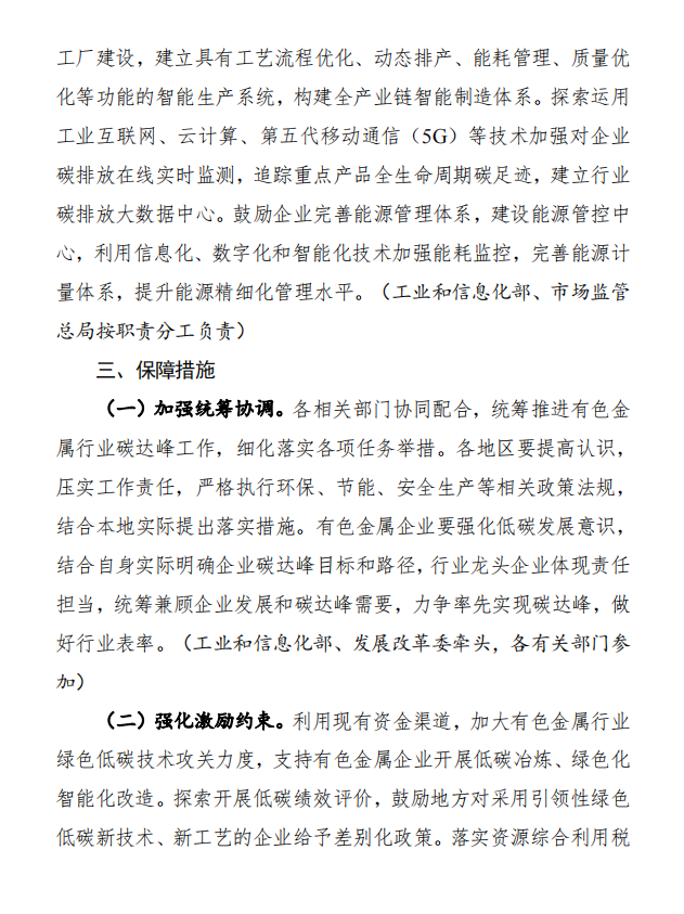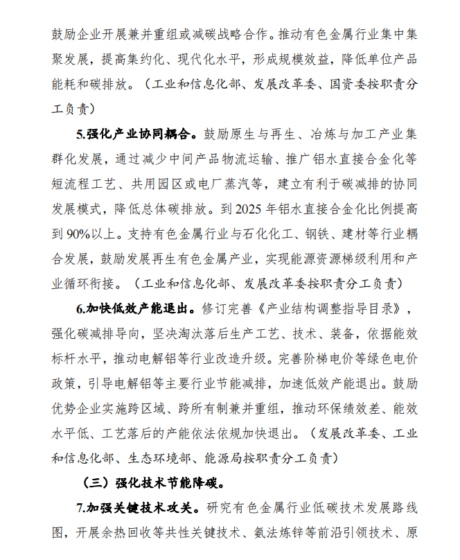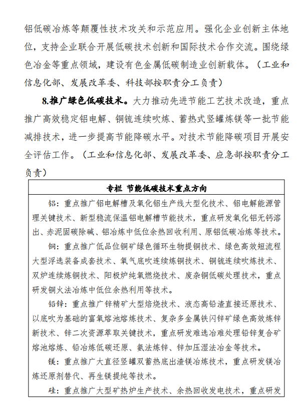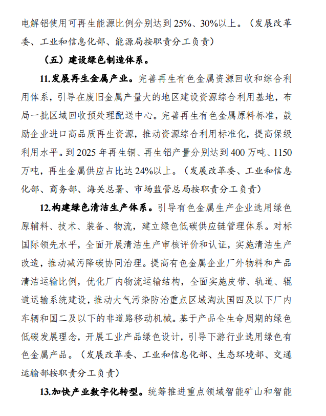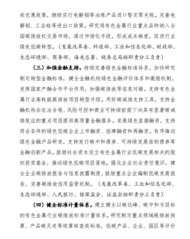 11月15日,工業和信息化部、國家發展和改革委員會和生態環境部發布《關于印發有色金屬行業碳達峰實施方案的通知》,(以下簡稱通知)通知指出,控制化石能源消費。推進有色金屬行業燃煤窯爐以電代煤,提升用能電氣化水平。在氣源有保障、氣價可承受的條件下有序推進以氣代煤。推動落后自備燃煤機組淘汰關停或采用清潔燃料替代。嚴禁在國家政策允許的領域以外新(擴)建燃煤自備電廠,推動電解鋁行業從使用自備電向網電轉化。支持企業參與光伏、風電等可再生能源和氫能、儲能系統開發建設。加強企業節能管理,嚴格落實國家強制性節能標準,持續開展工業節能監察,規范企業用能行為。 提高可再生能源使用比例,鼓勵企業在資源環境可承載的前提下向可再生能源富集地區有序轉移,逐步減少使用火電的電解鋁產能。利用電解鋁、工業硅等有色金屬生產用電量大、負荷穩定等特點,支持企業參與以消納可再生能源為主的微電網建設,支持具備條件的園區開展新能源電力專線供電,提高消納能力。鼓勵和引導有色金屬企業通過綠色電力交易、購買綠色電力證書等方式積極消納可再生能源,確保可再生能源電力消納責任權重高于本區域最低消納責任權重。力爭2025年、2030年電解鋁使用可再生能源比例分別達到25%、30%以上。 以下為原文: