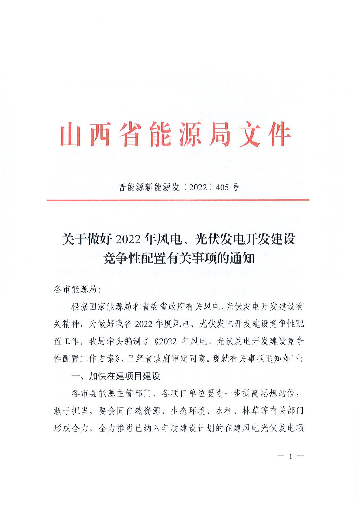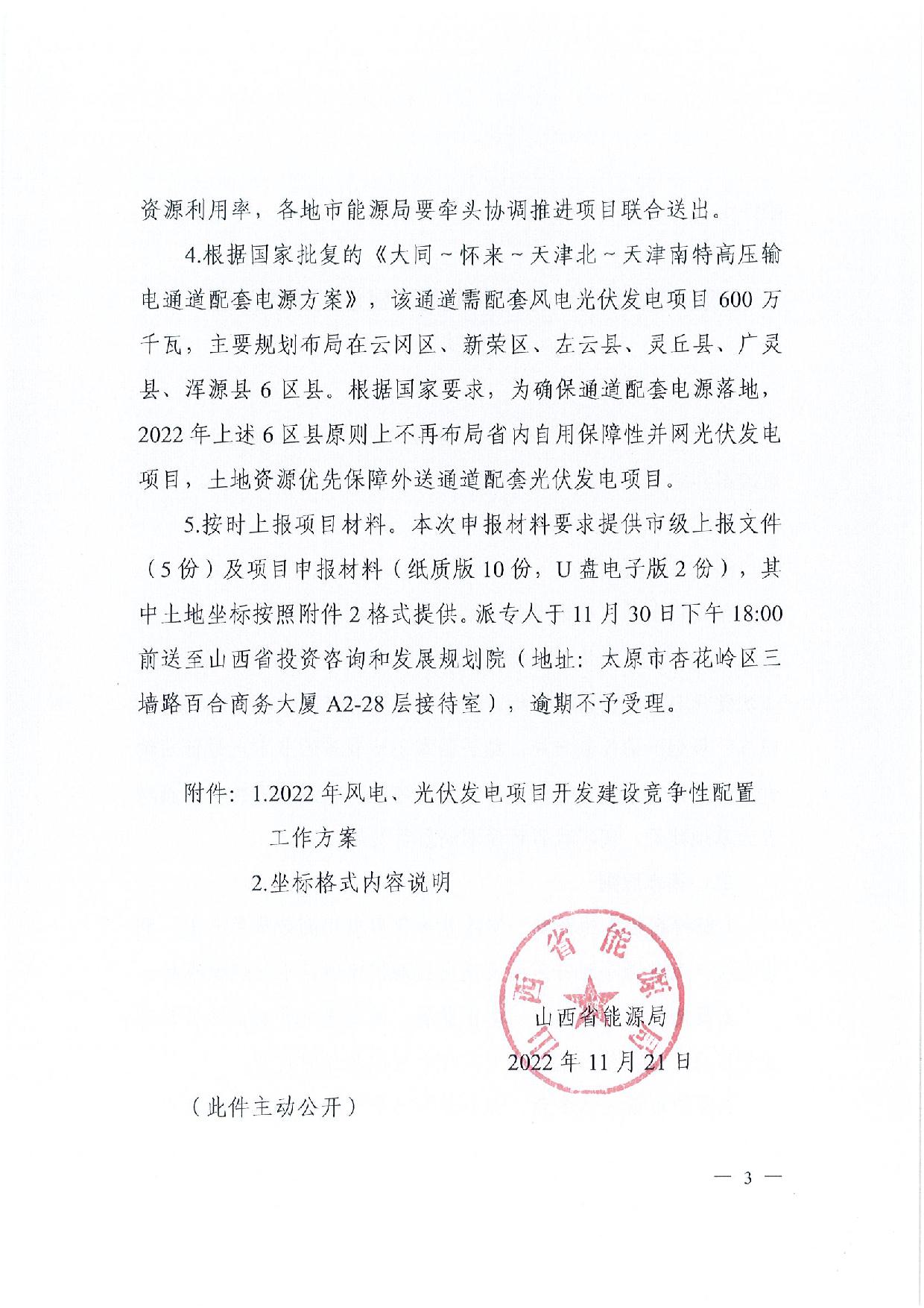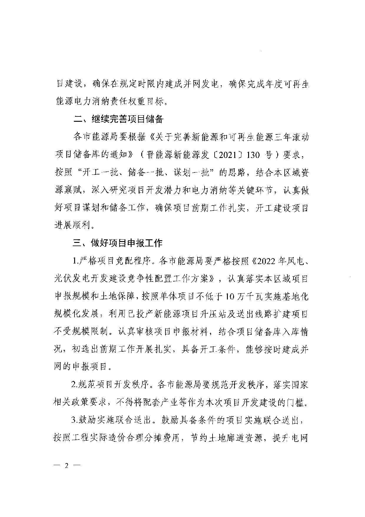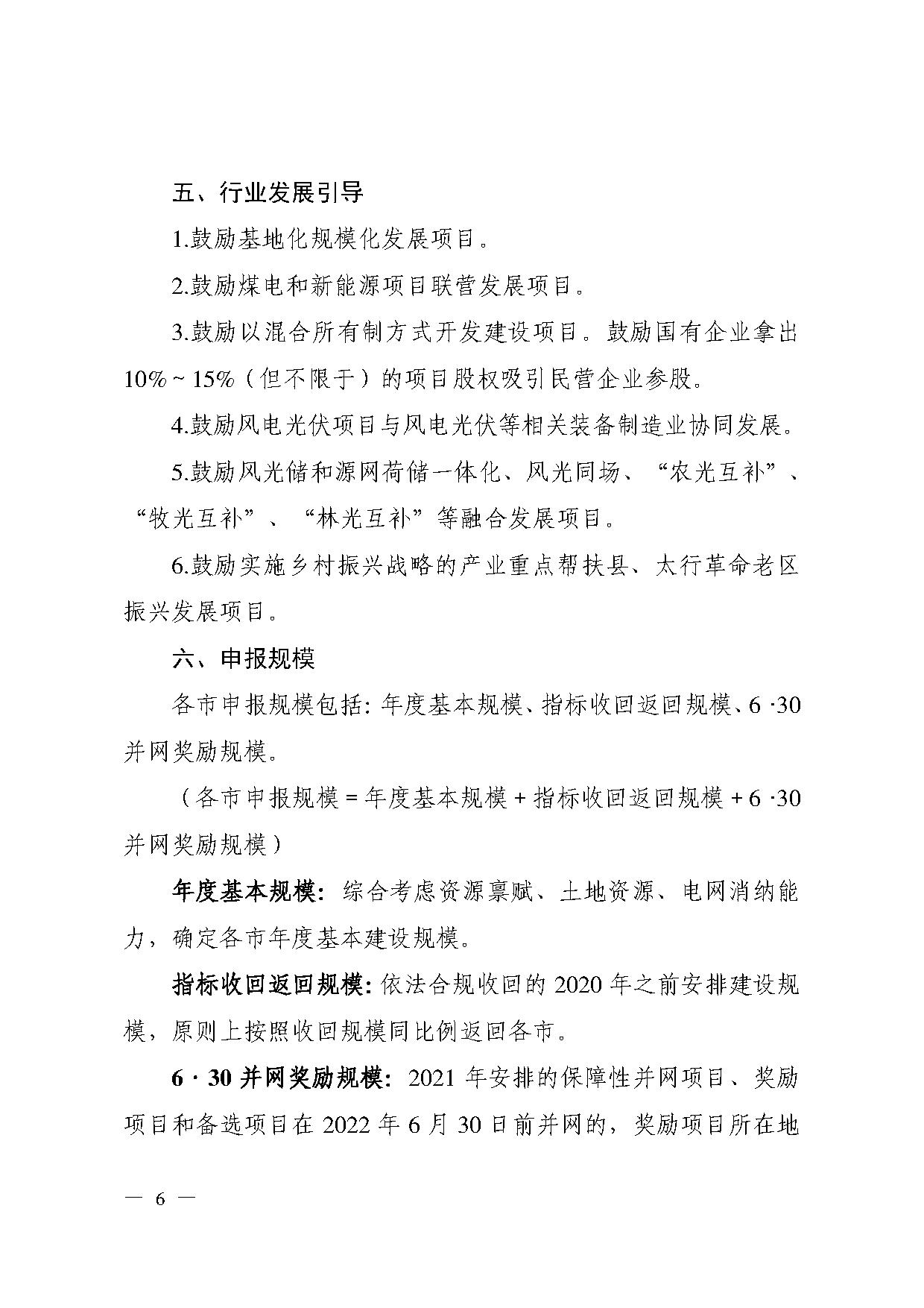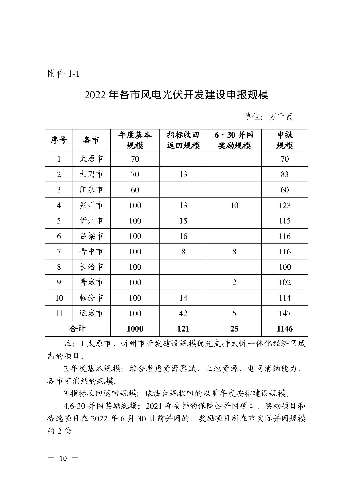 11月(yue)21日(ri),山西省能(neng)源局印(yin)發《關(guan)于做好2022年風(feng)電、光(guang)(guang)伏(fu)發電(dian)開發建(jian)設競爭先配置有(you)關事項的通知》,通知提(ti)到,為確(que)保完(wan)成省十二次黨代會確(que)定目(mu)(mu)標任(ren)務,結合風電(dian)、光(guang)(guang)伏(fu)發電(dian)項目(mu)(mu)儲備工作,綜合考慮全省全社會用電(dian)量、外送電(dian)量、電(dian)網(wang)消納能(neng)力、可再生能(neng)源消納責任(ren)權(quan)重目(mu)(mu)標等因(yin)素,安(an)排風電(dian)、 光(guang)(guang)伏(fu)保障(zhang)性并(bing)網(wang)年度規模(mo) 1000 萬(wan)千瓦,獎勵(li)規模(mo) 146 萬(wan)千瓦。 各(ge)(ge)(ge)市(shi)申報規(gui)(gui)(gui)(gui)(gui)模(mo)(mo)(mo)(mo)包括:年(nian)度(du)基本(ben)(ben)(ben)規(gui)(gui)(gui)(gui)(gui)模(mo)(mo)(mo)(mo)、指(zhi)標(biao)收(shou)(shou)(shou)回(hui)返(fan)回(hui)規(gui)(gui)(gui)(gui)(gui)模(mo)(mo)(mo)(mo)、6·30 并網獎(jiang)勵(li)(li)(li)規(gui)(gui)(gui)(gui)(gui)模(mo)(mo)(mo)(mo)。 (各(ge)(ge)(ge)市(shi)申報規(gui)(gui)(gui)(gui)(gui)模(mo)(mo)(mo)(mo)=年(nian)度(du)基本(ben)(ben)(ben)規(gui)(gui)(gui)(gui)(gui)模(mo)(mo)(mo)(mo)+指(zhi)標(biao)收(shou)(shou)(shou)回(hui)返(fan)回(hui)規(gui)(gui)(gui)(gui)(gui)模(mo)(mo)(mo)(mo)+6·30 并網獎(jiang)勵(li)(li)(li)規(gui)(gui)(gui)(gui)(gui)模(mo)(mo)(mo)(mo)) 年(nian)度(du)基本(ben)(ben)(ben)規(gui)(gui)(gui)(gui)(gui)模(mo)(mo)(mo)(mo):綜合(he)考慮資源(yuan)稟賦、土地資源(yuan)、電網消納能 力(li),確定(ding)各(ge)(ge)(ge)市(shi)年(nian)度(du)基本(ben)(ben)(ben)建(jian)(jian)(jian)設(she)規(gui)(gui)(gui)(gui)(gui)模(mo)(mo)(mo)(mo)。 指(zhi)標(biao)收(shou)(shou)(shou)回(hui)返(fan)回(hui)規(gui)(gui)(gui)(gui)(gui)模(mo)(mo)(mo)(mo):依(yi)法合(he)規(gui)(gui)(gui)(gui)(gui)收(shou)(shou)(shou)回(hui)的(de)(de) 2020 年(nian)之前安排(pai)(pai)建(jian)(jian)(jian)設(she)規(gui)(gui)(gui)(gui)(gui) 模(mo)(mo)(mo)(mo),原則上按照(zhao)收(shou)(shou)(shou)回(hui)規(gui)(gui)(gui)(gui)(gui)模(mo)(mo)(mo)(mo)同比例返(fan)回(hui)各(ge)(ge)(ge)市(shi)。 6·30 并網獎(jiang)勵(li)(li)(li)規(gui)(gui)(gui)(gui)(gui)模(mo)(mo)(mo)(mo):2021 年(nian)安排(pai)(pai)的(de)(de)保障性(xing)并網項目、獎(jiang)勵(li)(li)(li) 項目和(he)備選(xuan)項目在 2022 年(nian) 6 月(yue) 30 日前并網的(de)(de),獎(jiang)勵(li)(li)(li)項目所在地市(shi)一定(ding)規(gui)(gui)(gui)(gui)(gui)模(mo)(mo)(mo)(mo)建(jian)(jian)(jian)設(she)計劃,原則上該(gai)規(gui)(gui)(gui)(gui)(gui)模(mo)(mo)(mo)(mo)用于鼓勵(li)(li)(li)項目前期工(gong)作扎實, 建(jian)(jian)(jian)設(she)進度(du)快的(de)(de)企(qi)業集團。 年(nian)度(du)基本(ben)(ben)(ben)規(gui)(gui)(gui)(gui)(gui)模(mo)(mo)(mo)(mo)通(tong)過競(jing)爭(zheng)性(xing)配置確定(ding)項目;指(zhi)標(biao)收(shou)(shou)(shou)回(hui)返(fan)回(hui)規(gui)(gui)(gui)(gui)(gui)模(mo)(mo)(mo)(mo)、 6·30 并網獎(jiang)勵(li)(li)(li)規(gui)(gui)(gui)(gui)(gui)模(mo)(mo)(mo)(mo)由各(ge)(ge)(ge)市(shi)能源(yuan)局(ju)自行確定(ding)建(jian)(jian)(jian)設(she)主體同步上報。 2022 年(nian)各市(shi)風電光伏開發建設申報規模 原(yuan)文(wen)見下: