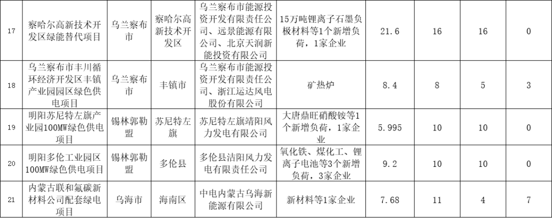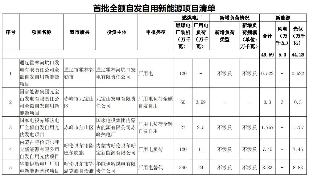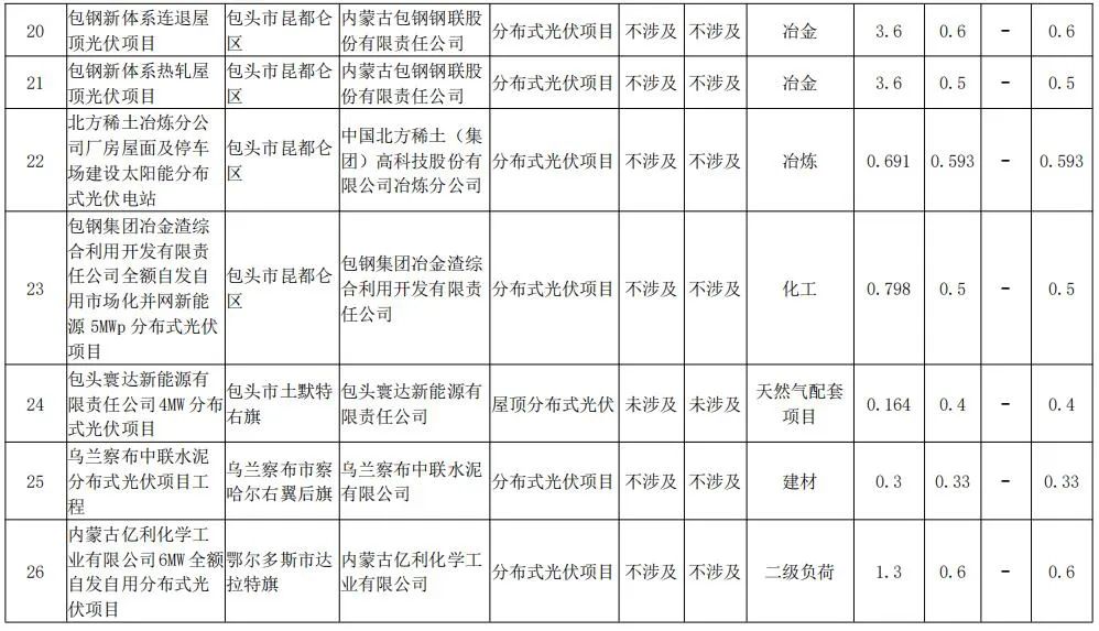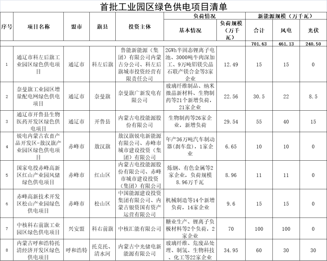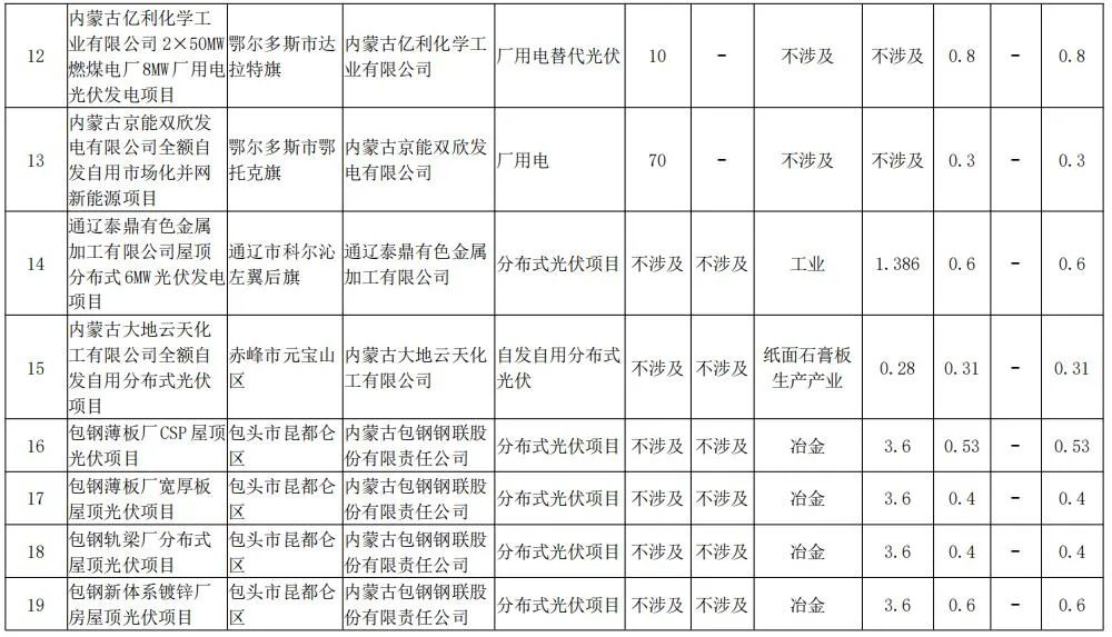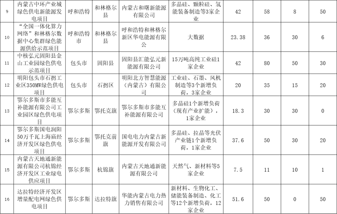 近日,內蒙古自治區能源局印發《首批全額自發自用新能源項目清單》和《首批工業園區綠色供電項目清單》,首批全額自發自用新能源項目總規模49.59萬千瓦,其中,光伏44.29萬千瓦、風電5.3萬千瓦;首批工業園區綠色供電項目總規模708.63萬千瓦,其中,光伏264.5萬千瓦、風電444.13萬千瓦。 項目詳情如下: 內蒙古自治區首批全額自發自用新能源項目清單 內蒙古自治區首批工業園區綠色供電項目清單