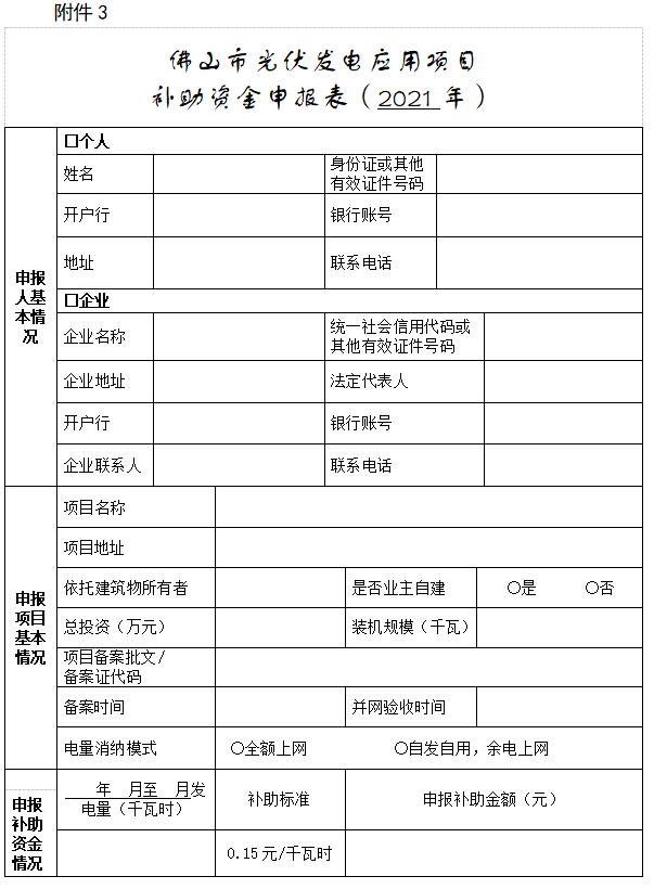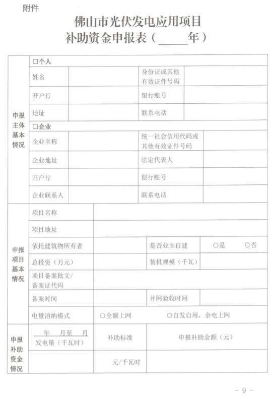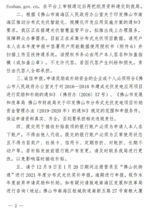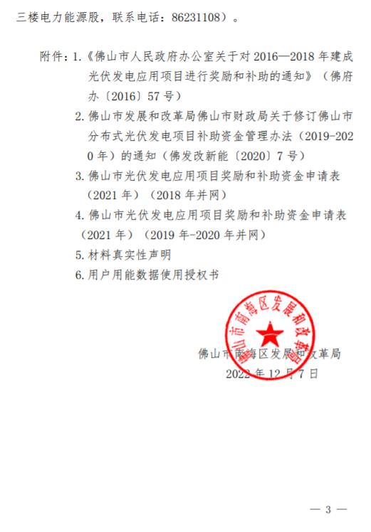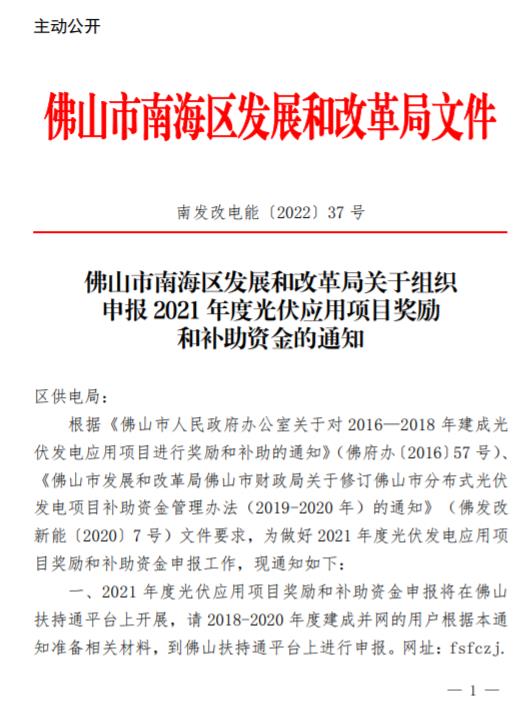 12月8日,廣東省佛山市南海區發改局發布《關于組織申報2021年度光伏應用項目獎勵和補助資金的通知》,2021年度光伏應用項目獎勵和補助資金申報將在佛山扶持通平臺上開展,請2018-2020年度建成并網的用戶根據本通知準備相關材料,到佛山扶持通平臺上進行申報。 詳情如下: