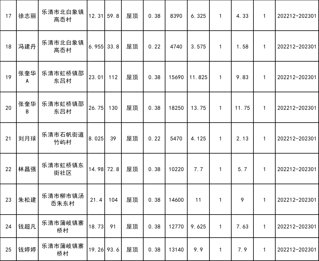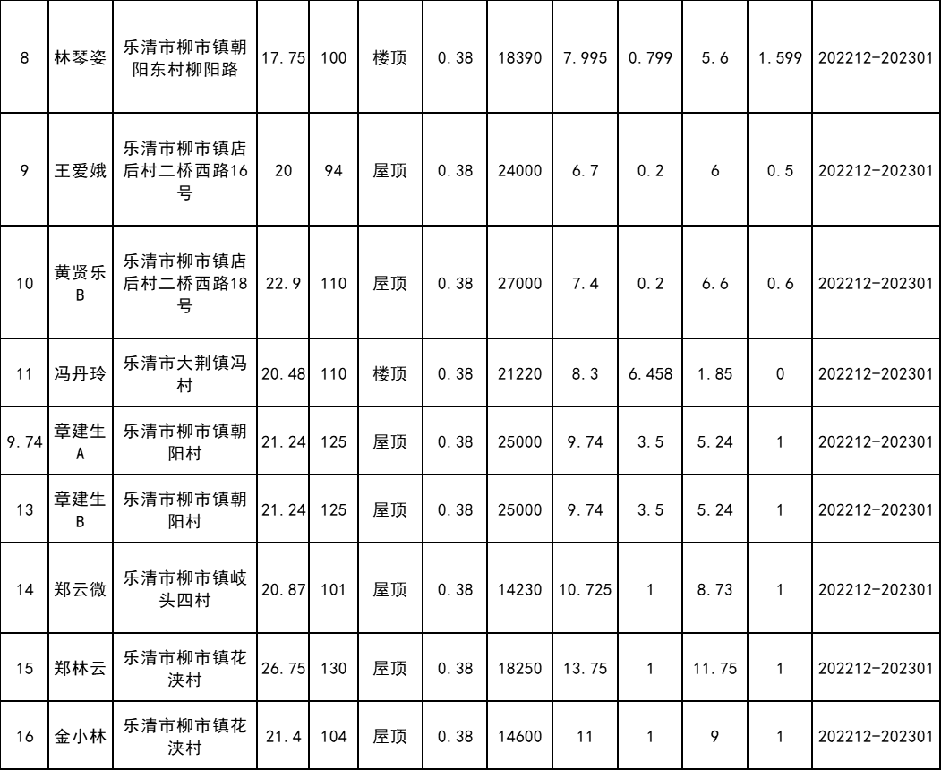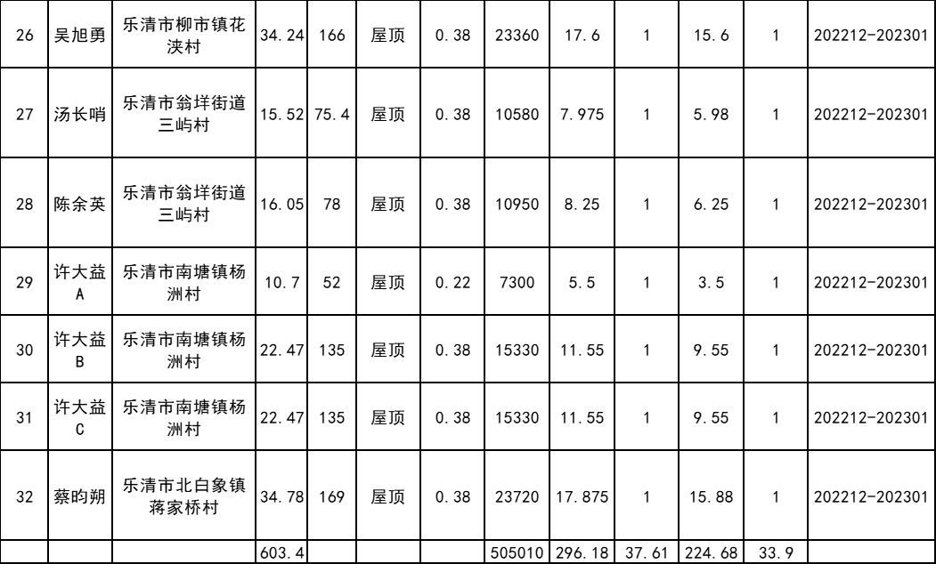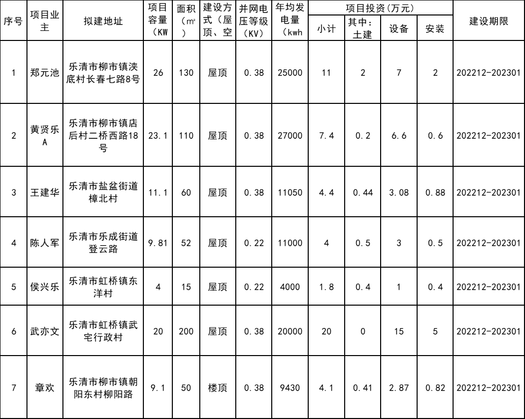 12月22日,樂清市人民政府發布關于樂清市2022年第十七批居民家庭屋頂分布式光伏發電項目備案的通知,通知指出,本批次共有居民家庭屋頂分布式光伏發電項目32個,總裝機容量603.35kWp,年平均發電量505010kWh。截至目前,浙江樂清市一共公示了十六批戶用光伏項目備案情況,共有670個項目,總計裝機規模12.14MW,詳情如下: 國網浙江樂清市供電公司: 貴公司報送的樂清市居民家庭屋頂分布式光伏發電項目備案申請材料已收悉,根據《浙江省光伏發電項目管理暫行辦法》(浙發改能源〔2014〕450號)《樂清市人民政府關于扶持分布式光伏發電的若干意見》(樂政發〔2014〕29號),現予以集中備案,并就備案有關事項通知如下: 一、本批次共有居民家庭屋頂分布式光伏發電項目32個,總裝機容量603.35kWp,年平均發電量505010kWh。項目情況詳見附表。 二、本備案通知書有效期一年,自備案之日起計;有效期內未開工建設的,貴公司應在備案通知書有效期滿30日前向我局申請延期。逾期不報,備案通知書自動失效。 三、已備案項目發生變更的,應辦理相應的變更手續。 四、居民家庭屋頂分布式光伏發電項目屬自然人項目,我局委托貴公司組織驗收。 五、本備案通知書不可作為項目所依托的建筑物符合城鄉、土地等相關規劃的認定依據。 附件:樂清市2022年第十七批居民家庭屋頂分布式光伏發電項目表 樂清市發展和改革局 2022年12月19日 附件 樂清市2022年第十七批居民家庭屋頂分布式光伏發電項目表