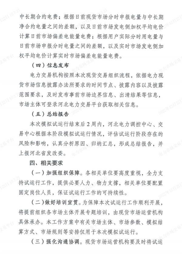 12月21日河北電力交易中心轉發河北省發展和改革委員會《關于印發河北南部電網電力現貨市場模擬試運行工作方案的通知》的通知(交易通知〔2022〕24號)。通知指出,本次模擬試運行時間為12月24-26日。詳情如下: 河北電力交易中心關于轉發河北省發展和改革委員會《關于印發河北南部電網電力現貨市場模擬試運行工作方案的通知》的通知(交易通知〔2022〕24號) 各有關市場主體: 為了做好河北南部電網電力現貨市場模擬運行,河北省發展和改革委員會印發了《關于印發河北南部電網電力現貨市場模擬試運行工作方案的通知》,現將文件轉發給你們,請遵照執行。 附件:關于印發河北南部電網電力現貨市場模擬試運行工作方案的通知 河北電力交易中心有限公司 2022年12月21日