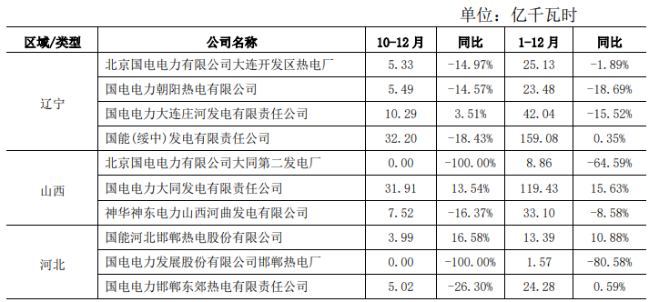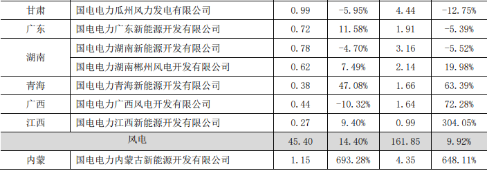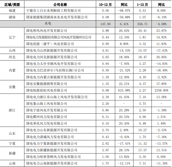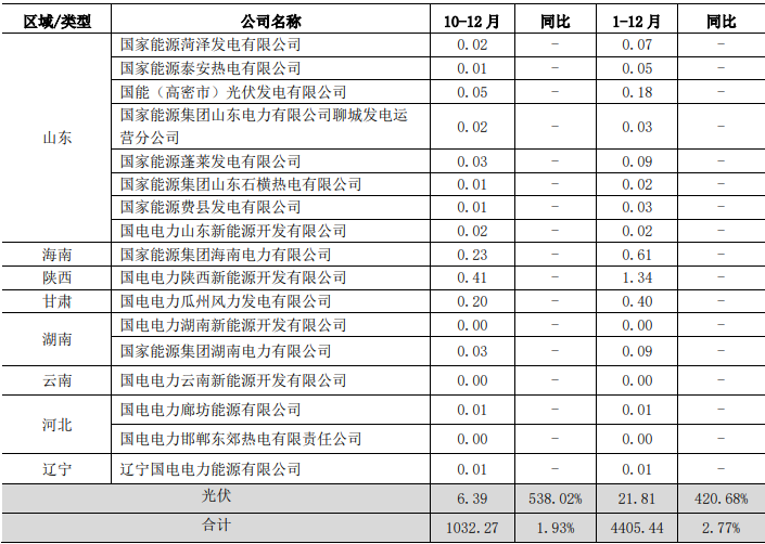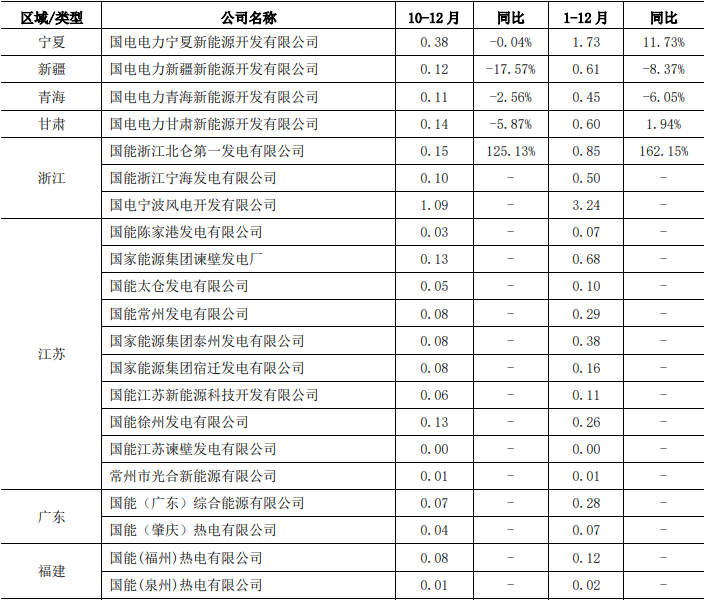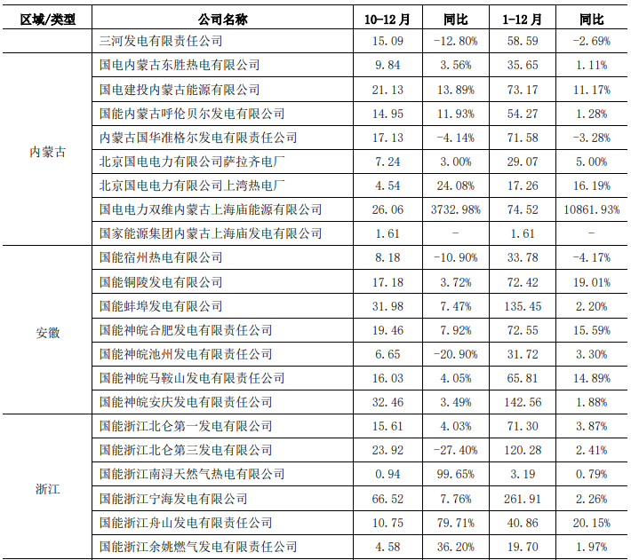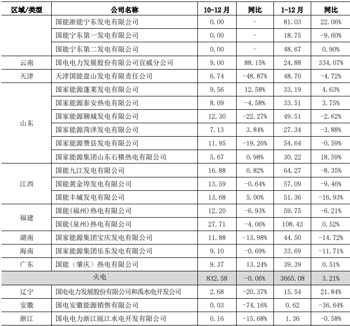 1月14日,國電電力發布2022年發電量情況公告,公告顯示,經初步統計,2022年全年公司合并報表口徑完成發電量4633.53億千瓦時,上網電量4405.44億千瓦時,按照可比口徑較上年同期分別增長2.81%和2.77%;參與市場化交易電量占上網電量的 93.16%;平均上網電價438.88元/千千瓦時。 2022年10-12月,公司合并報表口徑完成發電量1083.24億千瓦時,上網電量1032.27億千瓦時,按照可比口徑較上年同期分別增長1.83%和1.93%;市場化交易電量占上網電量的 96.85%;平均上網電價450.29元/千千瓦時。 注:1.上述數據為公司內部統計數據,可能與相關期間定期報告披露數據存在一定差異。 2.尾數差由四舍五入原因造成。 3.公司向國家能源集團寧夏公司轉讓寧夏區域相關股權及資產于 2022年9月30日完成交割,自2022年10月1日起,相關股權及資產裝機容量、發電量、電價不再統計。 公司發電量增長的主要原因是裝機容量同比增加。 裝機方面來看,截至2022年12月31日,公司合并報表口徑控股裝機容量9729.47萬千瓦,其中:火電7183.50萬千瓦,水電1496.49萬千瓦,風電745.93萬千瓦,光伏303.55萬千瓦。2022年,公司新能源控股裝機容量增加305.83萬千瓦。
