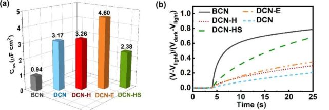 g-C3N4/上轉換納米晶的界面調控助力太陽光制氫近(jin)幾十年以來,化石燃(ran)料的(de)過度燃(ran)燒帶來的(de)能源危機和(he)環境污染(ran)問題日益嚴重(zhong),發展清(qing)潔能源迫在眉睫。利用光(guang)響應材料將(jiang)太陽(yang)能轉(zhuan)化為(wei)化學(xue)能,比如太陽(yang)能制(zhi)氫(qing)能受到研究者的(de)廣泛關注。然而(er),這一應用受制(zhi)于(yu)太陽(yang)光(guang)中(zhong)可見光(guang)、紅外光(guang)吸(xi)收(shou)不足與光(guang)載流子失活的(de)制(zhi)約,對(dui)此,設(she)計同時具備寬光(guang)譜響應和(he)優異電荷(he)傳(chuan)輸界面的(de)高(gao)效催(cui)化劑尤為(wei)重(zhong)要(yao)。 近日,悉尼(ni)科技大(da)學(xue)汪國秀教授、蘇大(da)為博士(shi)聯合(he)中科院過程(cheng)工程(cheng)研(yan)究所王丹研(yan)究員在《國家科學(xue)進展》中,提出了(le)界面調控的寬光譜響應催(cui)化劑的設計思路。高曉(xiao)春博士(shi)(悉尼(ni)科技大(da)學(xue)、魯(lu)東大(da)學(xue))與(yu)楊乃亮研(yan)究員(中科院過程(cheng)工程(cheng)研(yan)究所)為論文(wen)共同第一作者。 作(zuo)者首先(xian)1)將(jiang)雜原子S和C空位調控至三維氮化(hua)碳g-C3N4六方柱中(zhong),實(shi)(shi)現了對缺陷態(tai)g-C3N4 (DCN)的精準調控;隨后2)將(jiang)NaYF4: Yb3+, Tm3+ (NYF)納(na)米晶(jing)負載在DCN中(zhong),實(shi)(shi)現了具備寬光譜響應的NYF@DCN功(gong)能催化(hua)劑的設計,可大幅提(ti)升太陽光制氫(qing)能力。 圖1. 寬光譜響應NYF@DCN制備策略與結(jie)構(gou)表征 a) NYF@DCN合成示意圖(tu)(tu);b) DCN前(qian)驅(qu)體;c-d)DCN的(de)(de)(de)SEM/TEM圖(tu)(tu)像(xiang);e) NYF的(de)(de)(de)TEM圖(tu)(tu)像(xiang);f, g) NYF@DCN的(de)(de)(de)TEM圖(tu)(tu)像(xiang);h) NYF@DCN的(de)(de)(de)mapping圖(tu)(tu)像(xiang) 界面精準調控,優化DCN缺陷態 作者發現,限制前驅(qu)體(ti)生長(chang)的(de)(de)乙(yi)二醇和(he)熱聚合過程中(zhong)的(de)(de)熔融硫對(dui)DCN的(de)(de)缺陷態(tai)的(de)(de)形(xing)成有重大影(ying)響。二者的(de)(de)使(shi)用可同時促(cu)進S摻雜(za)和(he)C空位的(de)(de)產生,誘(you)導產生的(de)(de)缺陷態(tai)不僅(jin)顯(xian)著(zhu)增強DCN的(de)(de)光吸收能力,而且適度束縛暫存(cun)其中(zhong)的(de)(de)電(dian)子,可進一步(bu)促(cu)進光生電(dian)子在(zai)DCN/溶液界面的(de)(de)分離(li)效(xiao)率。 圖(tu)2. 界面精(jing)準調(diao)控DCN缺(que)陷(xian)態 a)表面態(tai)電容 Css數(shu)據;b)開路電位衰減曲線的比較(jiao) 拓展的NYF@DCN太陽光捕獲能力 相(xiang)較(jiao)于(yu)(yu)本體g-C3N4與DCN, 寬光(guang)(guang)(guang)譜(pu)響應NYF@DCN催化劑具備明顯增強(qiang)的太陽(yang)光(guang)(guang)(guang)吸收能(neng)力,這主要歸結于(yu)(yu)兩點(dian):1) DCN 中缺陷能(neng)級的引入(ru)縮小了光(guang)(guang)(guang)激(ji)發能(neng)量,將可見光(guang)(guang)(guang)的吸收延伸到 590 nm,其在550 nm依然展現12.55 μA cm-2的光(guang)(guang)(guang)電流(liu); 2) 上轉化光(guang)(guang)(guang)致發光(guang)(guang)(guang)光(guang)(guang)(guang)譜(pu)顯示,NYF納米(mi)晶將紅(hong)外(wai)光(guang)(guang)(guang)上轉化為能(neng)量較(jiao)高的紫(zi)外(wai)光(guang)(guang)(guang),再次激(ji)發DCN產生更多(duo)的光(guang)(guang)(guang)載流(liu)子,使得(de)NYF@DCN在紅(hong)外(wai)光(guang)(guang)(guang)的激(ji)發下,展現出8.01 μA cm-2的光(guang)(guang)(guang)電流(liu)。因此(ci),借助于(yu)(yu)NYF@DCN增強(qiang)的光(guang)(guang)(guang)捕獲能(neng)力, 其太能(neng)光(guang)(guang)(guang)制(zhi)氫性能(neng)將得(de)到有效提升。 圖3. 拓(tuo)展的可見(jian)光、紅外光吸收 a) 可(ke)見(jian)光(guang)下瞬(shun)態光(guang)電(dian)流(liu)響應; b)上轉化光(guang)致(zhi)發(fa)光(guang)光(guang)譜;c) 紅外光(guang)下瞬(shun)態光(guang)電(dian)流(liu)響應 增強的NYF@DCN界面電荷轉移 交叉極化(hua)魔角旋轉固(gu)態核磁(CP-MAS ssNMR)實驗(yan)和理論(lun)計算表(biao)明,相較于本體(ti)g-C3N4,缺(que)陷態優(you)化(hua)的(de)DCN與NYF在(zai)界面存在(zai)著更強的(de)Y-N相互(hu)作用力(li)與界面電荷極化(hua)現象,更加(jia)有助于二(er)者界面緊密、高效契合。得益于此,NYF納米晶可通過光子(zi)激發(PT)和激發態能量轉移(ET)向DCN間接或者直接地轉移更多(duo)的(de)光生載流(liu)子(zi),使得寬光譜響應NYF@DCN催化(hua)劑(ji)展現出(chu)優(you)于本體(ti)材(cai)料19.3倍的(de)太陽光制氫速(su)率(2799 μmol h-1 g-1)。 圖4. 增強的界面電荷轉移 a) DCN和NYF-35@DCN的CP-MAS 15N NMR譜圖(tu)(tu);b) NYF@DCN與 (c) NYF@BCN電荷(he)差分圖(tu)(tu);d) NYF@DCN界(jie)面電荷(he)傳輸示意圖(tu)(tu) 上一篇: 江西氫能產業中長期規劃出爐