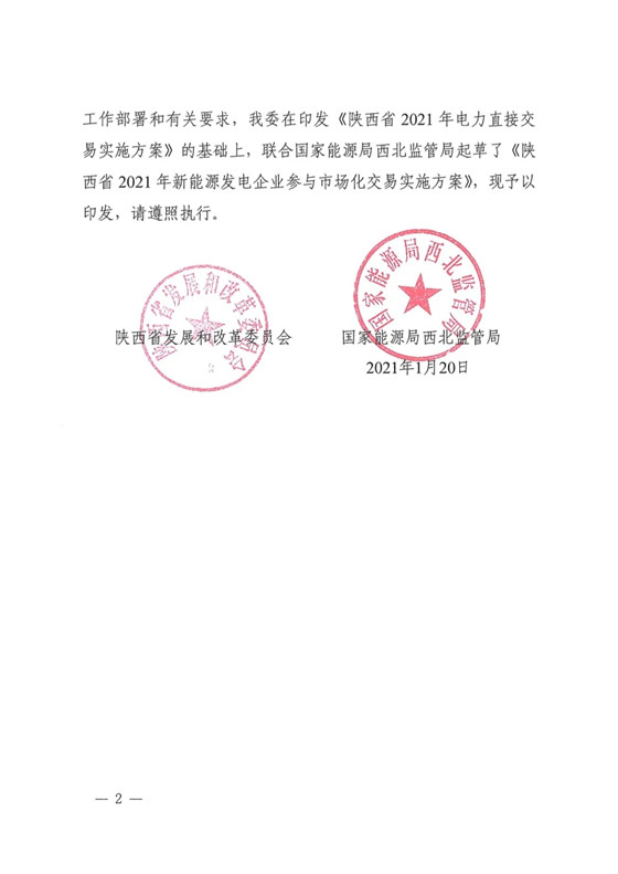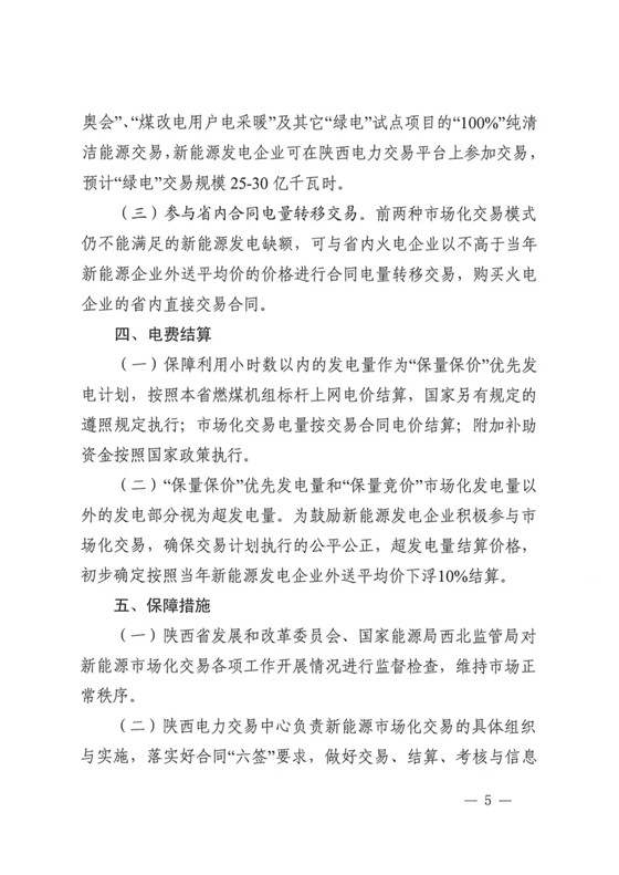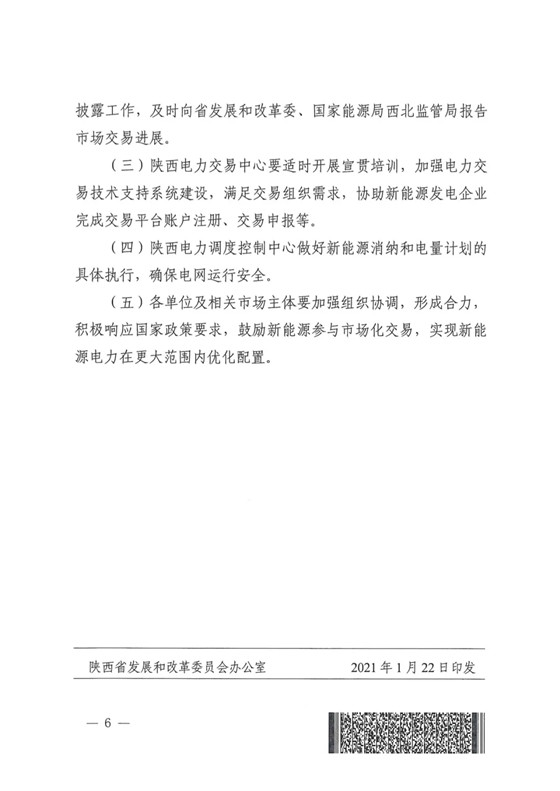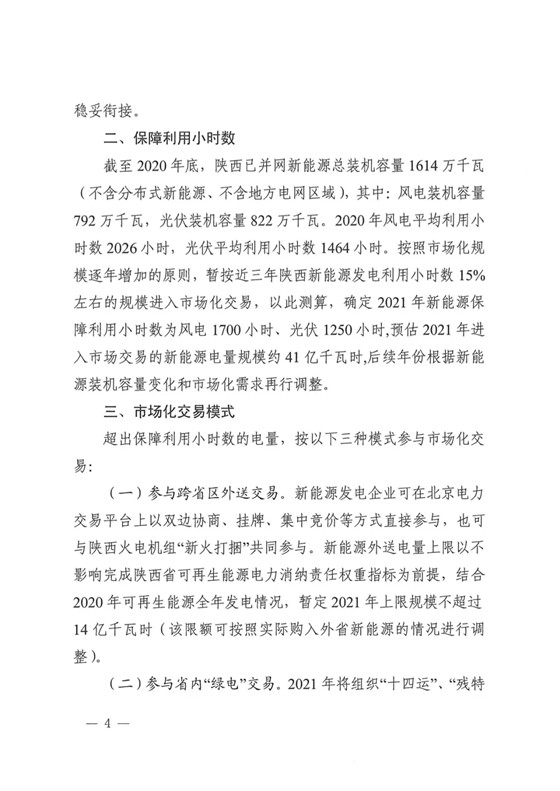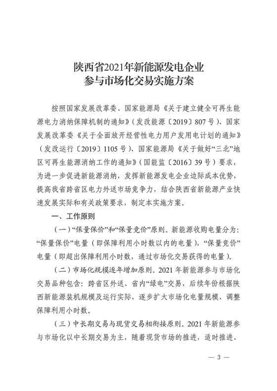 1月20日,陜西(xi)發(fa)(fa)改(gai)委(wei)、國家能(neng)(neng)源局西(xi)北監管局印發(fa)(fa)《陜西(xi)省2021年(nian)新(xin)(xin)能(neng)(neng)源發(fa)(fa)電(dian)(dian)企業(ye)參(can)與市(shi)(shi)場化交易(yi)實施方案》,要求新(xin)(xin)能(neng)(neng)源企業(ye)按照近三(san)年(nian)平(ping)均發(fa)(fa)電(dian)(dian)小時(shi)數(shu)(shu)的(de)15%參(can)與市(shi)(shi)場交易(yi)(保(bao)(bao)量(liang)(liang)競價(jia)部分),而“保(bao)(bao)量(liang)(liang)保(bao)(bao)價(jia)”部分即光伏、風電(dian)(dian)保(bao)(bao)障(zhang)利用小時(shi)數(shu)(shu)分別降至1250小時(shi)、1700小時(shi);上述兩部分之外的(de)電(dian)(dian)量(liang)(liang)視為超發(fa)(fa)電(dian)(dian)量(liang)(liang),即在保(bao)(bao)障(zhang)小時(shi)數(shu)(shu)以及市(shi)(shi)場交易(yi)電(dian)(dian)量(liang)(liang)之外的(de)發(fa)(fa)電(dian)(dian)量(liang)(liang)部分,按當年(nian)新(xin)(xin)能(neng)(neng)源發(fa)(fa)電(dian)(dian)企業(ye)外送平(ping)均價(jia)格的(de)10%進行(xing)下浮,再由電(dian)(dian)網進行(xing)收購。 全文如下(xia):