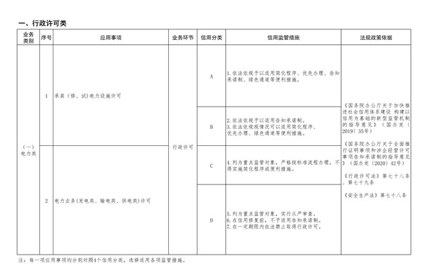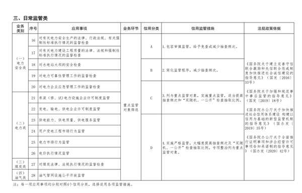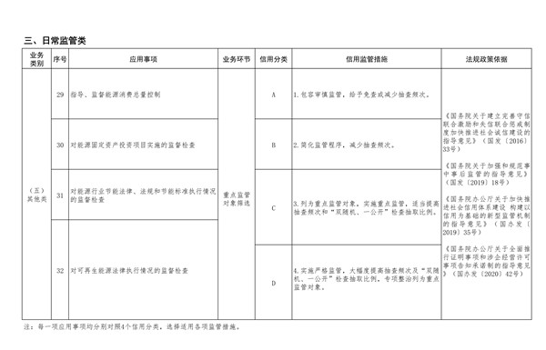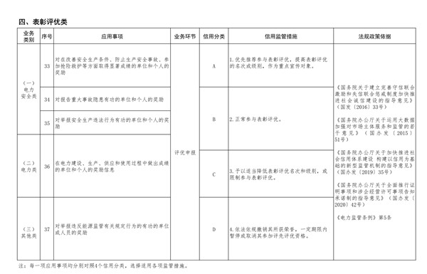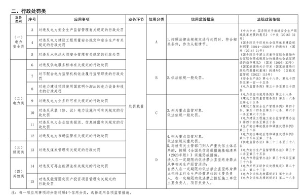 2月21日,國家能源局發布《關于印發<能源行業信用信息應用清單(2023年版)>的通知》。 《能源行業信用信息應用清單(2023年版)說明》指出,能源行業信用信息應用清單由業務類別、應用事項、業務環節、信用分類、信用監管措施和法規政策依據共6方面內容組成。 本清單的應用事項,按照行政許可、行政處罰、日常監管、表彰評優和其他共5類業務,根據對能源行業市場主體的信用分類,可采取具體信用監管措施共計36項。 原文如下: 關于印發《能源行業信用信息應用清單(2023年版)》的通知 國能發資質規〔2023〕16號 各派出機構: 為進一步強化能源行業市場主體信用信息應用,推進實施守信激勵和失信懲戒,做好信用分級分類監管,按照《國務院辦公廳關于進一步完善失信約束制度 構建誠信建設長效機制的指導意見》(國辦發〔2020〕49號)、《國家發展改革委 人民銀行關于印發<全國公共信用信息基礎目錄(2022年版)>和<全國失信懲戒措施基礎清單(2022年版)>的通知》(發改財金規〔2022〕1917號)等文件要求,我局編制了《能源行業信用信息應用清單(2023年版)》,現予印發實施。 國家能源局 2023年2月9日