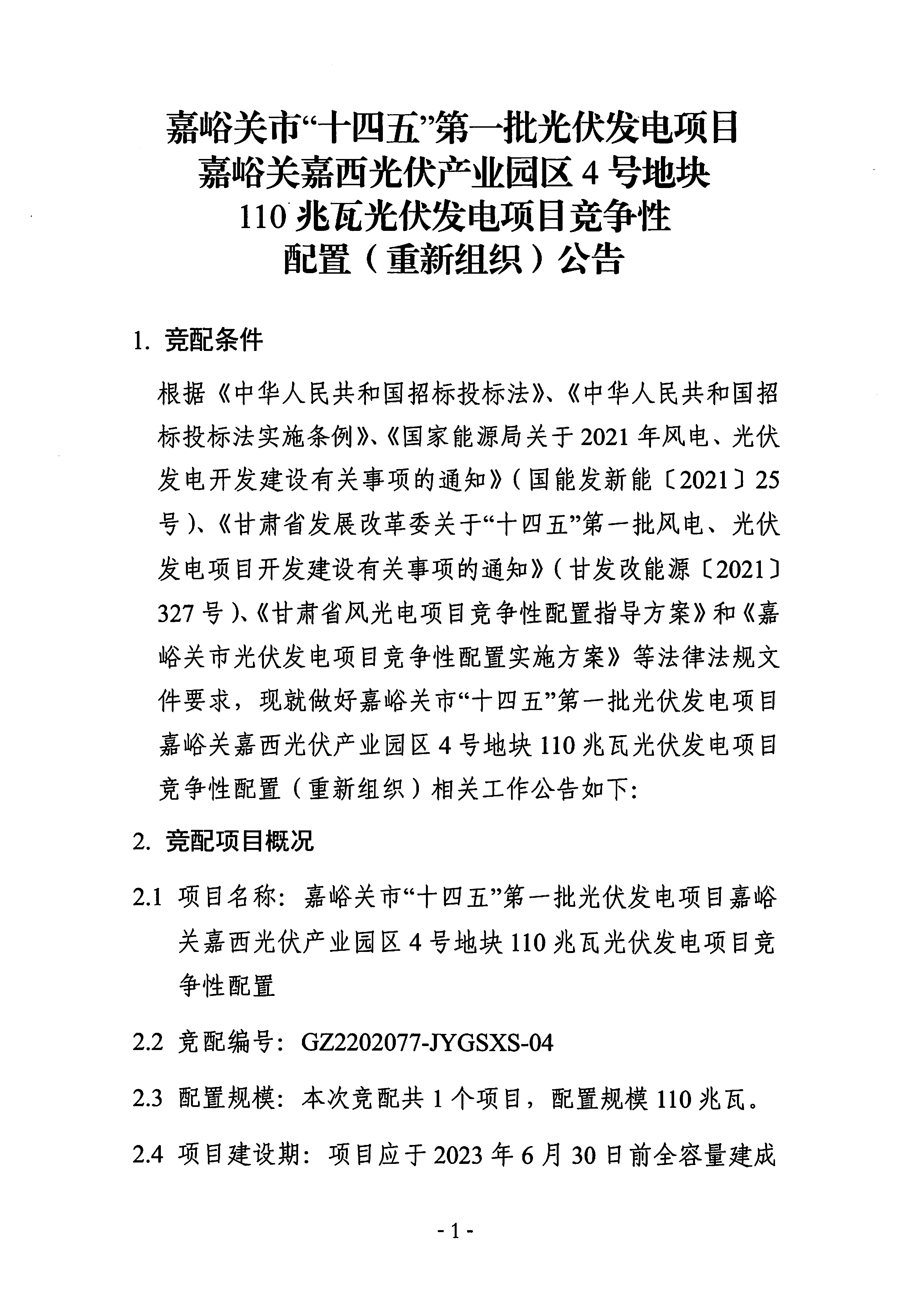 配置儲能22MW/44MWh!甘肅嘉峪關光伏發電項目竟配公告發布2月20日(ri),甘肅省嘉峪(yu)(yu)關市(shi)人民政府發布《嘉峪(yu)(yu)關市(shi)“十四五”第一批光(guang)伏發電項(xiang)目嘉峪(yu)(yu)關嘉西光(guang)伏產業園區4號(hao)地(di)塊(kuai)110兆瓦光(guang)伏發電項(xiang)目競爭性配置(zhi)(重新(xin)組織)公告》。 公告顯示(shi),本次竟配共1個項(xiang)目(mu),配置規模110MW,申(shen)報項(xiang)目(mu)儲能系統要求不(bu)低于(yu)項目規(gui)模的20%,儲能放電(dian)時(shi)長不(bu)小于(yu)2小時(shi),則項目至少配置儲能22MW/44MWh。項目要求申(shen)報電(dian)價(jia)不(bu)得(de)高于(yu)基準電(dian)價(jia)0.3078元/千瓦時(shi);項目應于(yu)2023年6月30日(ri)前(qian)全容量建成并網。 原文如下: