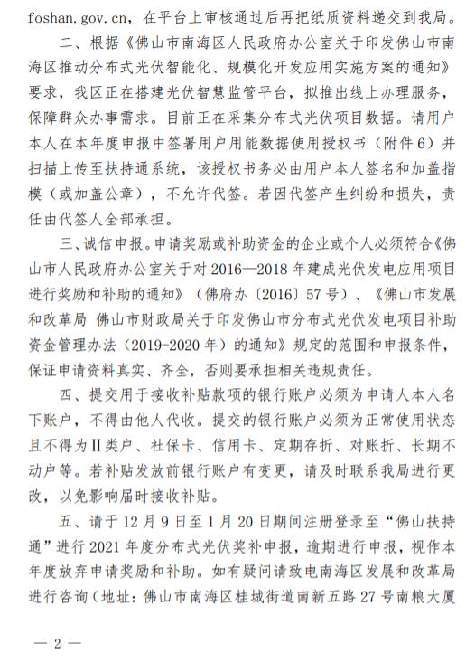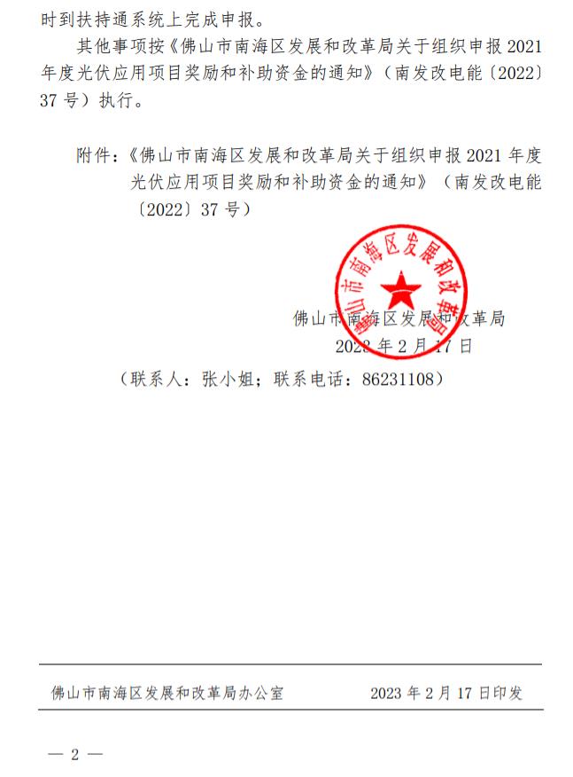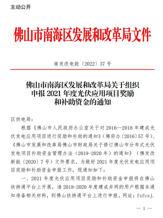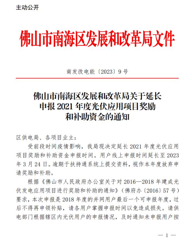 2月23日,廣東省佛山市南海區發改局發布《關于延長申報2021年度光伏應用項目獎勵和補助資金的通知》,受前段時間疫情影響,該局決定延長2021年度光伏應用項目獎勵和補助資金申報時間。用戶線上申報時間延長至2023年3月24日。逾期于扶持通系統上提交資料,視作本年度放棄申請獎勵和補助。 通知如下:
