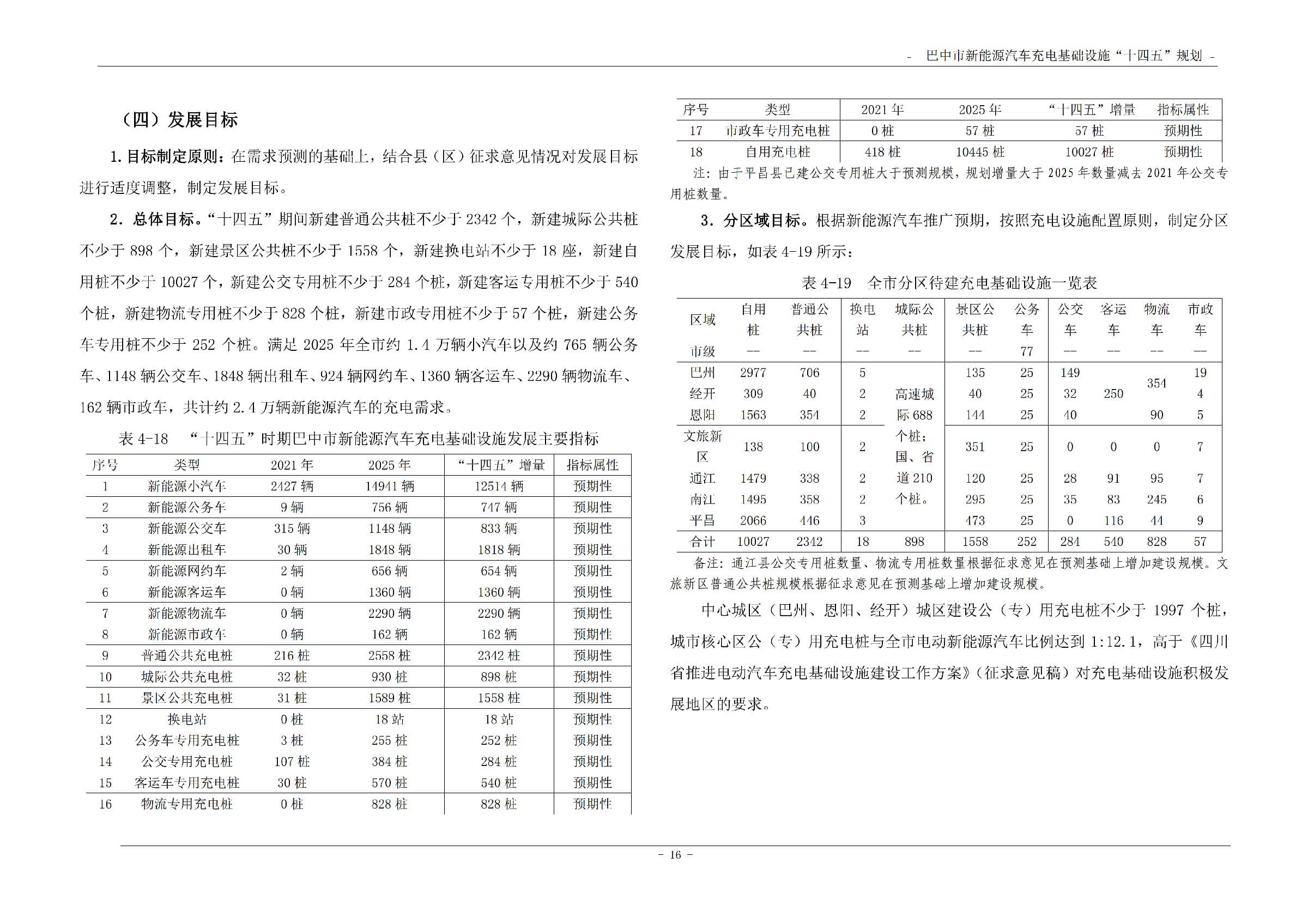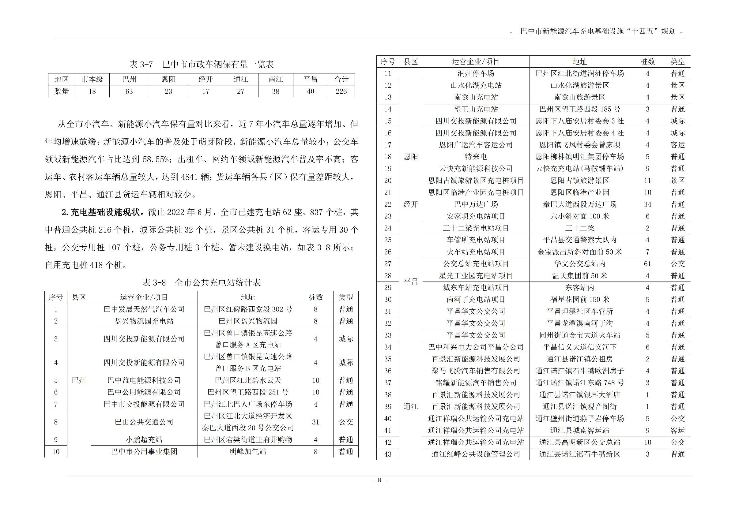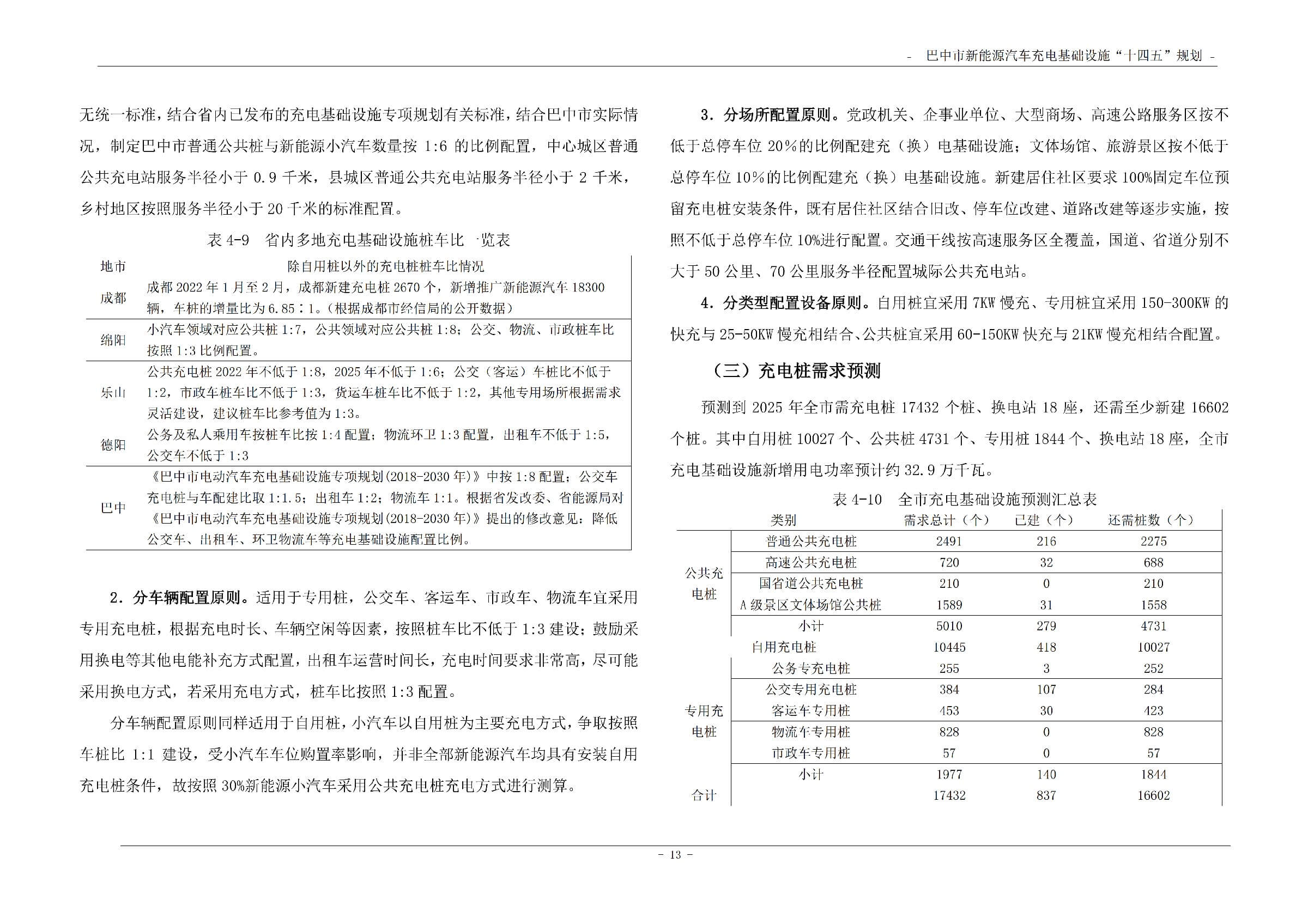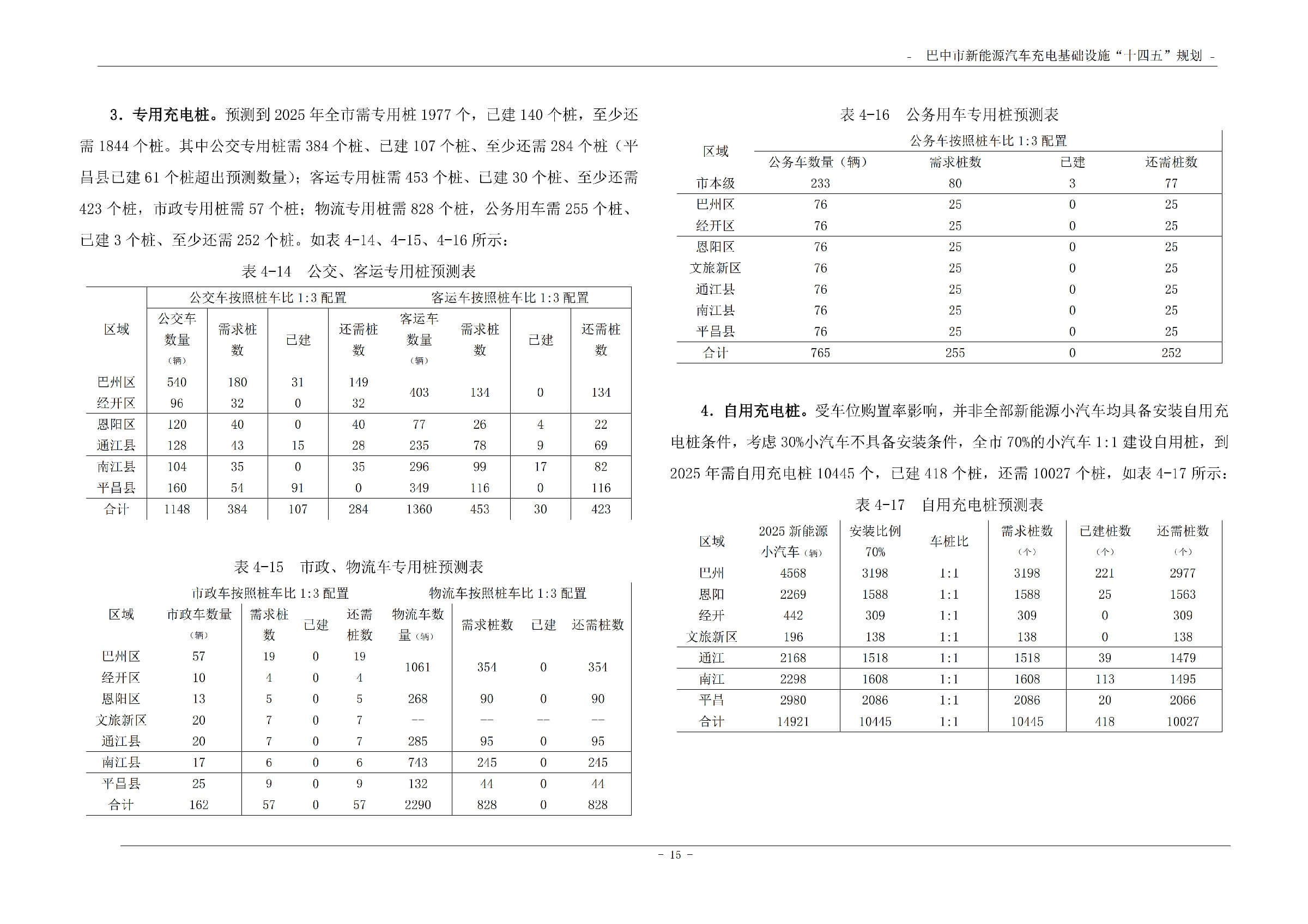 總投資約5.47億元!四川巴中市規劃全市充電基礎設施建設3月23日,四川省巴中市發改委發布《巴中市新能源汽車充電基礎設施“十四五”規劃》,根據對不同類型充電樁的投資估算,“十四五”期間全市新能源汽車充電基礎設施總投資54759.1萬元。 《規劃》中提到,計劃至2025年,建設不少于2342個普通公共充電樁,投資約14052萬元;規劃至2025年,全市換電站達到18個站、新增18個換電站,投資預計4100萬元;國、省道規劃新增21個城際公共充電站,全市公路養護站每站規劃建設1個樁,國、省道規劃新增210個樁;共計新增898個樁,投資約10776萬元。 到2025年全市新增公交車專用充電樁不少于284個樁,投資約1988萬元。至2025年,全市建設不少于540個客運車專用樁,投資約3780萬元。至2025年全市建設不少于828個物流專用充電樁,投資約5796萬元。至2025年全市共建設8座市政專用充電站,不少于57個樁,優先與市政車輛停車場所合建。投資約399萬元。到2025年全市建設不少于252個公務用車專用樁(單樁),投資約1512萬元。 至2025年全市新增自用樁不少于10027個樁,已建小區可申請免收增容基本服務費、使用維修基金、申請舊改項目等措施推動建設;新建小區100%固定車位預留充電樁安裝條件;縣(區)可提高自用樁建設比例。全市自用充電樁投資約3008.1萬元。 原文如下:
