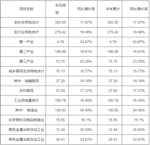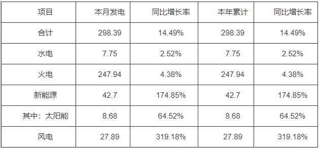 2021年1月,全省全社會用電量350.55億千瓦時,同比增加17.87%;累計用電量350.55億千瓦時,同比增加17.87%。全省發電量298.39億千瓦時,同比增加14.49%,累計發電量298.39億千瓦時,同比增加14.49%。新能源發電量42.7億千瓦時,其中太陽能發電量8.68億千瓦時,同比增長64.52%。 一、電力生產情況 (一)發電量情況。1月份當月,全省發電量298.39億千瓦時,同比增加14.49%。其中水電7.75億千瓦時,同比增加2.52%;火電247.94億千瓦時,同比增加4.38%;新能源42.7億千瓦時,同比增長174.85%。 表1 2021年1月河南發電量情況統計表 單位:億千瓦時、% (二)發電機組利用小時情況。截止1月底,全省機組平均利用小時數293小時,同比增加16小時。其中水電機組平均利用小時數為190小時,同比增加5小時;火電358小時,同比增加22小時;新能源為149小時,同比增加69小時。統調火電機組平均利用小時數為365小時,同比增加21小時。 (三)發電裝機情況。截止1月底,全省裝機容量10194.04萬千瓦,同比增加裝機777.25萬千瓦。其中水電裝機407.71萬千瓦,占比4%,火電裝機6918.14萬千瓦,占比67.86%,新能源裝機2868.19萬千瓦,占比28.14%。 二、電力消費情況 (一)全社會用電量情況。全省全社會用電量350.55億千瓦時,同比增加17.87%;累計用電量350.55億千瓦時,同比增加17.87%。 (二)分行業用電量情況。1月份,第一產業完成用電量4.79億千瓦時,同比增加24.87%;第二產業完成用電量196.88億千瓦時,同比增加16.61%;第三產業完成用電量73.75億千瓦時,同比增加23.25%;全省城鄉居民生活用電75.13億千瓦時,同比增加15.77%。工業用電量190.78億千瓦時,同比增加16.45%,其中,制造業用電量130.93億千瓦時,同比增加34.49%。 1月份,有色金屬行業用電量35.41億千瓦時,同比增加33.81%。黑色金屬行業用電量12.49億千瓦時,同比增加35.83%。化學原料及制品制造行業用電量15.55億千瓦時,同比增加16.1%。 表2 2021年1月全社會用電量分行業統計表 單位:億千瓦時、%