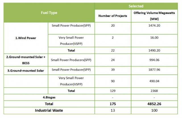 4月5日,泰國能源監管委員會(Energy Regulatory Commission,簡稱“ERC”)公布了2022-2030年上網電價(FiT)計劃下可再生能源采購中標項目名單。 據統計,共有175個項目通過最終審議,采購電力總量為4,852.26MW。詳情請見下表: 此次采購中共有22個風電項目中標,總發電量為1490.2MW。其中有20個小型發電商(SPP), 例如Gunkul風電公司(約有200MW項目中標)。此外,還有2家超小型發電商(VSPP)項目入選,共計16MW。 光儲電站方面,共有24家小型發電項目(SPP)中標,總發電量為944.06MW。 光伏大型地面電站方面,采購總量為2368MW。其中有39家小型發電項目(SPP)共計1877.96MW,以及90家超小型發電項目(VSPP)共計490.04MW通過ERC采購審核。除了Gunkul集團的項目外,Absolute Clean Energy Company (ACE), Thai Solar Energy Company (TSE)等公司的項目也都入選。 工業廢料發電方面,共有13個項目通過審核,共計100MW。 “電力局將致函選定的發電申請人,確認并接受在 2023 年 4 月 19 日之前簽署購電協議的條件。”Komkrit補充道。 能源新聞中心(Energy News Center)記者稱,此輪綠色購電項目總量為4852.26MW,低于設定的目標5203MW,原因是沒有企業提交生物沼氣電站項目的申請。 與此同時,ERC 正在制定“公用事業綠色電價”(Utility Green Tariff, 或者UGT)。這項政策將決定想要使用清潔能源來達到碳中和的工廠和企業的電價。 目前關于《公用事業綠色電價規則(草案)》的公開聽證會已經結束,下一步將移交給能源監管委員會 (ERC) 審核,預計于2023年第三季度公布。為了吸引更多投資,ERC 正在加快審核綠色電價進度,不少想要使用綠電的企業正在尋找新建的可再生發電項目,簽署長期綠電供應合同。 ERC稱,這些項目最早將于2024年開始投入商業運營(COD)。從發電企業處購買的電力將使可再生能源在泰國發電占比從去年的10%左右增加到50%,達到9,996 MW。 上一篇: 印度2026年光伏產能或達110GW