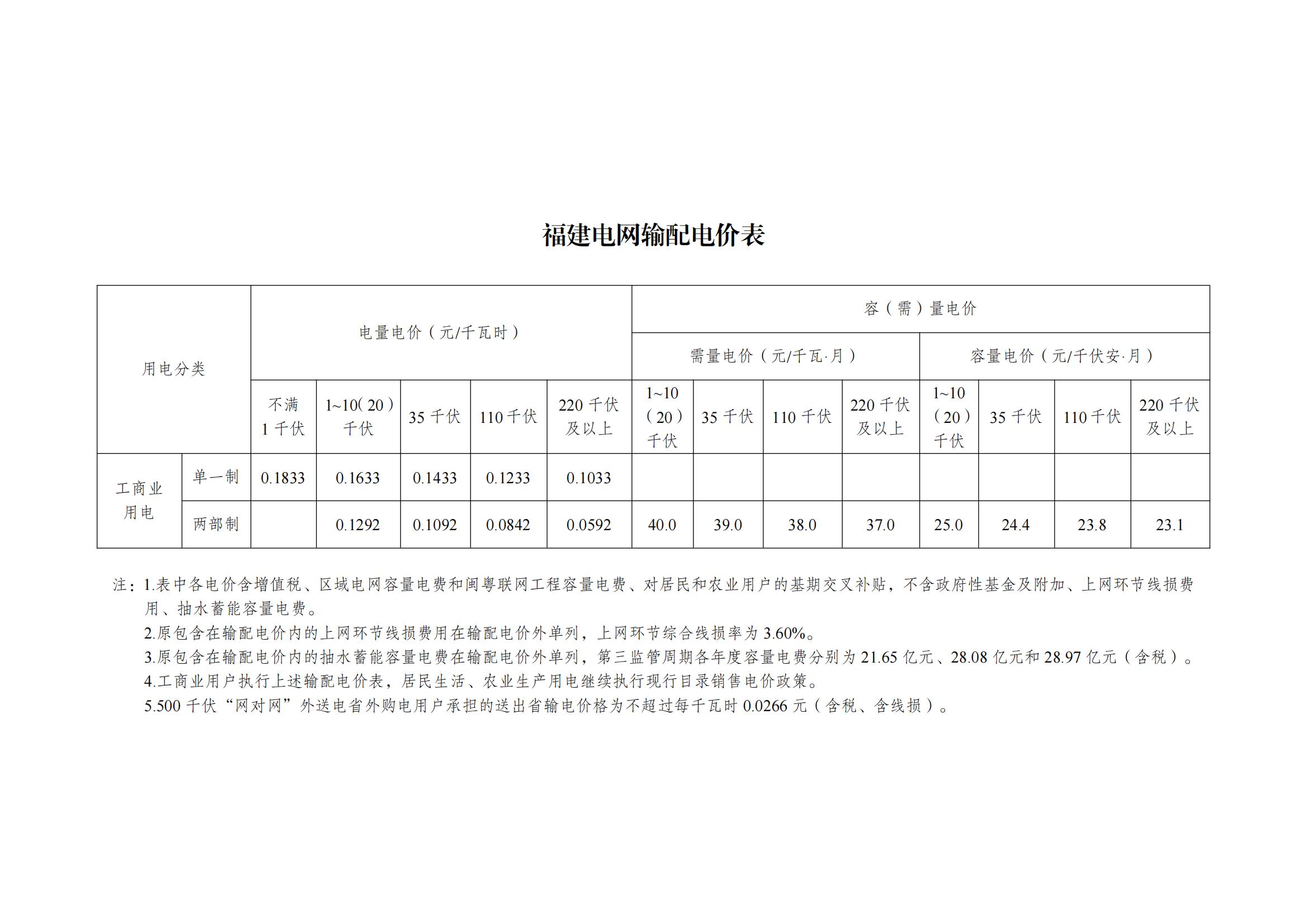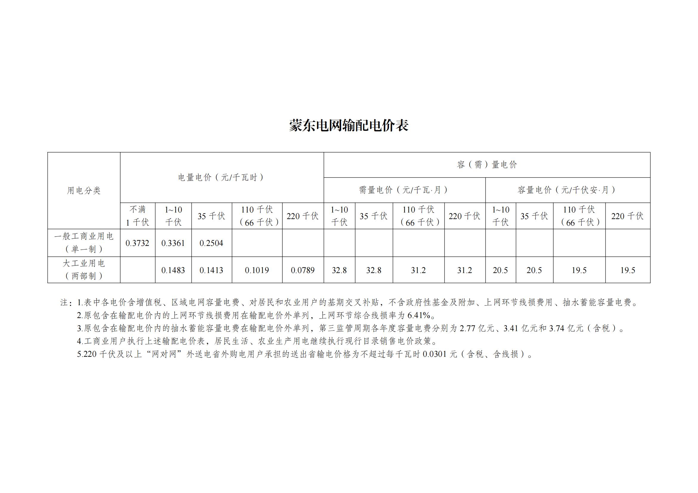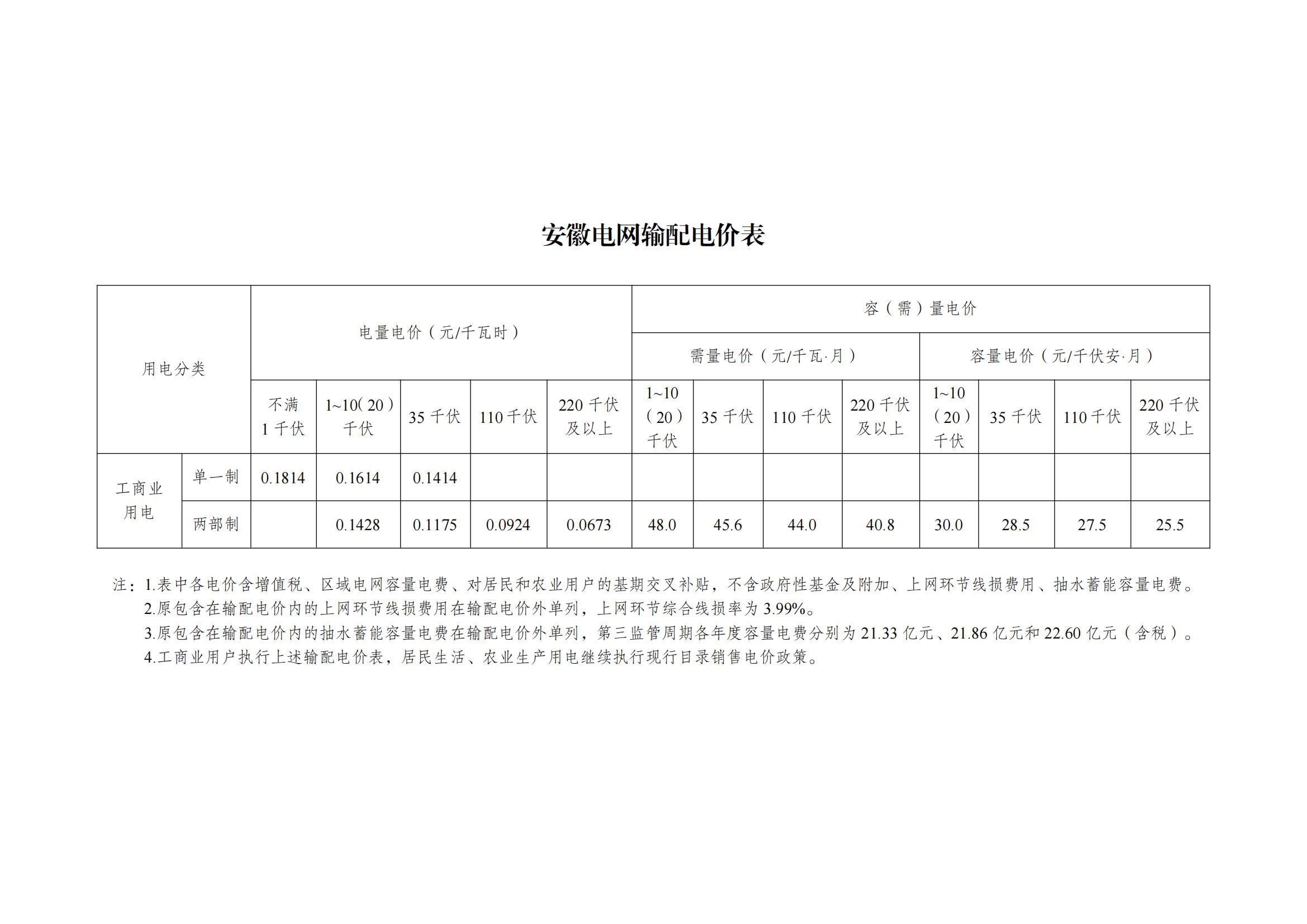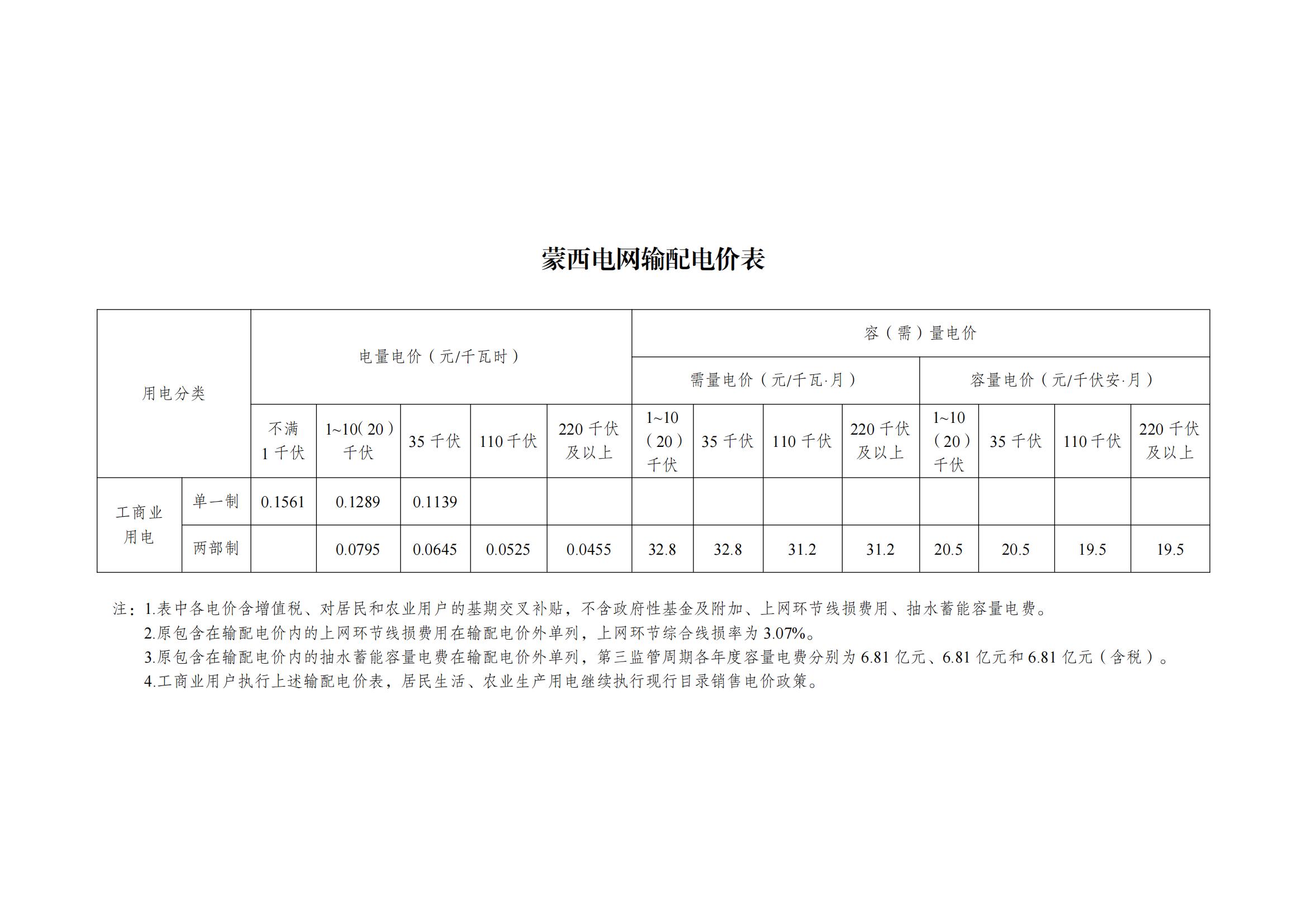 5月15日,國家發改委發布《關于第三監管周期省級電網輸配電價及有關事項的通知》(以下簡稱《通知》)。 《通知》指出,執行工商業(或大工業、一般工商業)用電價格的用戶,用電容量在100千伏安及以下的,執行單一制電價;100千伏安至315千伏安之間的,可選擇執行單一制或兩部制電價;315千伏安及以上的,執行兩部制電價,現執行單一制電價的用戶可選擇執行單一制電價或兩部制電價。選擇執行需量電價計費方式的兩部制用戶,每月每千伏安用電量達到260千瓦時及以上的,當月需量電價按本通知核定標準90%執行。每月每千伏安用電量為用戶所屬全部計量點當月總用電量除以合同變壓器容量。 原文如下: 國家發展改革委關于第三監管周期省級電網輸配電價及有關事項的通知 發改價格〔2023〕526號 各省、自治區、直轄市發展改革委,國家電網有限公司、中國南方電網有限責任公司、內蒙古電力(集團)有限責任公司: 為進一步深化輸配電價改革,更好保障電力安全穩定供應,推動電力行業高質量發展,現就第三監管周期省級電網輸配電價及有關事項通知如下: 一、按照《國家發展改革委 國家能源局關于印發<輸配電定價成本監審辦法>的通知》(發改價格規〔2019〕897號)、《國家發展改革委關于印發<省級電網輸配電價定價辦法>的通知》(發改價格規〔2020〕101號)及有關規定,核定第三監管周期各省級電網輸配電價,具體見附件。 二、用戶用電價格逐步歸并為居民生活、農業生產及工商業用電(除執行居民生活和農業生產用電價格以外的用電)三類;尚未實現工商業同價的地方,用戶用電價格可分為居民生活、農業生產、大工業、一般工商業用電(除執行居民生活、農業生產和大工業用電價格以外的用電)四類。 三、執行工商業(或大工業、一般工商業)用電價格的用戶(以下簡稱工商業用戶),用電容量在100千伏安及以下的,執行單一制電價;100千伏安至315千伏安之間的,可選擇執行單一制或兩部制電價;315千伏安及以上的,執行兩部制電價,現執行單一制電價的用戶可選擇執行單一制電價或兩部制電價。選擇執行需量電價計費方式的兩部制用戶,每月每千伏安用電量達到260千瓦時及以上的,當月需量電價按本通知核定標準90%執行。每月每千伏安用電量為用戶所屬全部計量點當月總用電量除以合同變壓器容量。 四、工商業用戶用電價格由上網電價、上網環節線損費用、輸配電價、系統運行費用、政府性基金及附加組成。 系統運行費用包括輔助服務費用、抽水蓄能容量電費等。 上網環節線損費用按實際購電上網電價和綜合線損率計算。電力市場暫不支持用戶直接采購線損電量的地方,繼續由電網企業代理采購線損電量,代理采購損益按月向全體工商業用戶分攤或分享。 五、居民生活、農業生產用電繼續執行現行目錄銷售電價政策。 六、省級價格主管部門要精心組織、周密安排,確保輸配電價平穩執行,做好與電網企業代理購電制度等的協同,密切監測輸配電價執行情況,發現問題及時報告我委(價格司)。電網企業要按照相關要求,嚴格執行本通知核定的輸配電價,統籌推進電網均衡發展;對各電壓等級的資產、費用、收入、輸配售電量、負荷、用戶報裝容量、線損率、投資計劃完成進度等與輸配電價相關的基礎數據進行統計歸集,每年5月底前報我委(價格司)和省級價格主管部門。 本通知自2023年6月1日起執行,現行政策相關規定與本通知不符的,以本通知規定為準。 點擊查看附件:省級電網輸配電價表 國家發展改革委 2023年5月9日