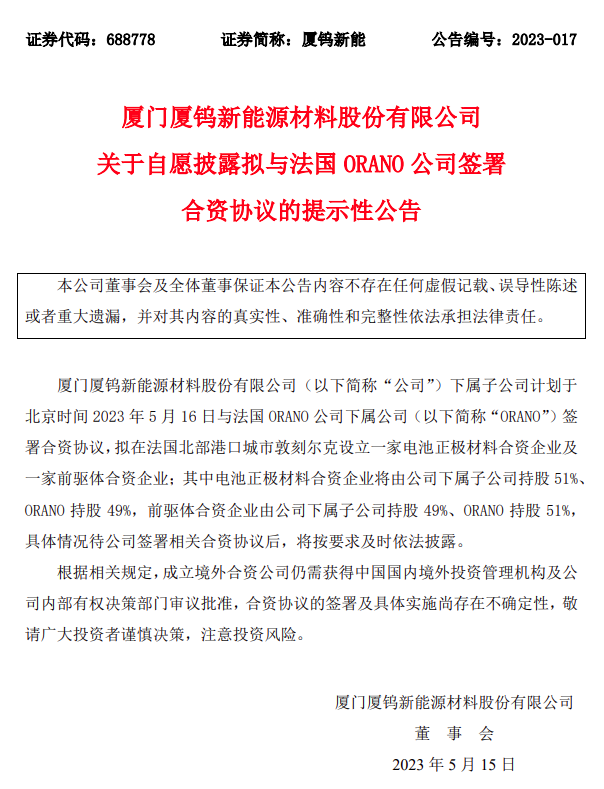 投資15億歐元!馬克龍官宣中法合資電池企業法國總統馬克龍5月12日表示,中國廈門廈鎢新能源材料股份有限公司計劃與法國歐安諾公司在法國北部港口城市敦刻爾克設立一家電池領域的合資企業,預期投資額為15億歐元,該合資企業將創造1700個就業機會。 馬克龍提到:“(廈鎢新能和歐安諾的合資企業)將使我們能夠確保在鋰電池生產價值鏈中的上游位置。” 在宣布這一消息的幾個小時前,臺灣輝能科技股份有限公司正式確定在敦刻爾克建設電動汽車電池生產廠。 據了解,廈鎢新能專門從事鋰電池材料生產,特別是動力電池。 馬克龍指出,廈鎢新能與歐安諾的合資企業是對輝能科技工廠的“補充”,因為該企業將處于電動汽車電池生產的“上游”。 5月15日,廈鎢新能發布合資協議提示性公告。廈門廈鎢新能源材料股份有限公司是廈門鎢業股份有限公司旗下控股子公司