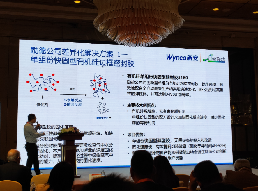 新安集團子公司浙江勵德硅材料有限公司 涂(tu)磊 新安集團子公司浙江勵德硅(gui)材(cai)料有(you)限(xian)公司涂磊就(jiu)題目“有(you)機硅(gui)創新產(chan)品助力光伏組件的高(gao)效生(sheng)產(chan)”作(zuo)了以下報告。 涂先(xian)生首先(xian)對公(gong)司產(chan)(chan)業(ye)及規模(mo)進(jin)行了介(jie)紹。勵(li)德有機硅(gui)(gui)(gui)(gui)(gui)致力于(yu)(yu)從金(jin)屬(shu)硅(gui)(gui)(gui)(gui)(gui)冶煉、硅(gui)(gui)(gui)(gui)(gui)粉加工(gong)及單體合成(cheng)(cheng),再(zai)到(dao)硅(gui)(gui)(gui)(gui)(gui)橡膠(jiao)、硅(gui)(gui)(gui)(gui)(gui)樹脂、硅(gui)(gui)(gui)(gui)(gui)烷偶聯劑系(xi)列產(chan)(chan)品的(de)生產(chan)(chan),實現了材(cai)料(liao)上下(xia)游一體化(hua)發展,以41個系(xi)列近3000種(zhong)產(chan)(chan)品服務于(yu)(yu)全球6500家(jia)客戶(hu),立志成(cheng)(cheng)為硅(gui)(gui)(gui)(gui)(gui)基(ji)新材(cai)料(liao)解決方案(an)的(de)全球領先(xian)者(zhe)。勵(li)德有機硅(gui)(gui)(gui)(gui)(gui)產(chan)(chan)品廣泛應(ying)用(yong)于(yu)(yu)光伏(fu)(fu)產(chan)(chan)業(ye)鏈各環節(jie),比(bi)如(ru)用(yong)于(yu)(yu)光伏(fu)(fu)組(zu)件(jian)組(zu)裝的(de)粘(zhan)接密封膠(jiao)、用(yong)于(yu)(yu)光伏(fu)(fu)逆變(bian)器的(de)模(mo)塊灌封膠(jiao)、用(yong)于(yu)(yu)儲能(neng)的(de)導熱(re)填縫膠(jiao)等。 有機(ji)硅(gui)粘(zhan)接密(mi)封(feng)膠產品(pin)通常分(fen)為脫(tuo)酸膠、脫(tuo)肟膠、脫(tuo)醇膠三類,其(qi)中脫(tuo)肟膠有機(ji)密(mi)封(feng)膠應用最(zui)廣,但其(qi)硫化(hua)過程會釋放一種PH大于7的有機(ji)溶劑。勵德有機(ji)硅(gui)開(kai)發出(chu)單組分(fen)快固型醇型膠3160及雙組分(fen)粘(zhan)接密(mi)封(feng)膠3250-PV,有效緩解了組件邊(bian)框粘(zhan)接密(mi)封(feng)膠易溢(yi)出(chu)的行業(ye)難題。