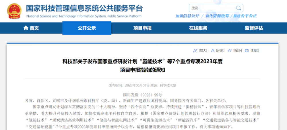 6月(yue)9日,科技(ji)(ji)部發布(bu)關于國家重點(dian)研發計(ji)劃“氫(qing)能(neng)技(ji)(ji)術(shu)(shu)”等7個重點(dian)專項(xiang)2023年(nian)度項(xiang)目(mu)(mu)申(shen)報指南的通知。其(qi)中,《“氫(qing)能(neng)技(ji)(ji)術(shu)(shu)”重點(dian)專項(xiang)2023年(nian)度項(xiang)目(mu)(mu)申(shen)報指南》總體目(mu)(mu)標是:以推動能(neng)源(yuan)革命(ming)、建設能(neng)源(yuan)強國等重大(da)需求為(wei)牽引,系統布(bu)局氫(qing)能(neng)綠色制取、安全致密儲輸和(he)高效利用技(ji)(ji)術(shu)(shu),貫通基礎前瞻(zhan)、共性關鍵、工程應用和(he)評估規范環節,到2025年(nian)實現我國氫(qing)能(neng)技(ji)(ji)術(shu)(shu)研發水平進入國際(ji)先進行列。 根據(ju)《國(guo)家重點研發計劃管理暫行辦法》和組(zu)織管理相關(guan)要求,將“氫能技術(shu)(shu)”“煤炭清潔高效利用技術(shu)(shu)”“儲能與(yu)(yu)智能電(dian)網技術(shu)(shu)”“可再生能源(yuan)技術(shu)(shu)”“新能源(yuan)汽(qi)車(che)”“交(jiao)通(tong)載運裝備(bei)與(yu)(yu)智能交(jiao)通(tong)技術(shu)(shu)”“交(jiao)通(tong)基礎(chu)設施”7個(ge)重點專(zhuan)項2023年(nian)度項目申(shen)報(bao)指南予以公布,請根據(ju)指南要求組(zu)織項目申(shen)報(bao)工作。 2023年(nian)度指南部署堅持問(wen)題導向(xiang)、分步實施、重點(dian)突(tu)出的原則,圍繞氫能(neng)綠色制(zhi)取與(yu)規模轉存體系(xi)、氫能(neng)安全存儲(chu)與(yu)快速輸配(pei)體系(xi)及氫能(neng)便捷改質與(yu)高效動力系(xi)統3個(ge)(ge)技術方向(xiang),擬(ni)啟動19項(xiang)任務、安排(pai)國(guo)撥經(jing)費(fei)(fei)3.4億元。其中,擬(ni)部署3個(ge)(ge)青年(nian)科學家項(xiang)目(mu)(mu),擬(ni)安排(pai)國(guo)撥經(jing)費(fei)(fei)1500萬元,每個(ge)(ge)項(xiang)目(mu)(mu)不超過500萬元。應用示范類項(xiang)目(mu)(mu)要求由企業牽頭(tou)申報(bao)。企業牽頭(tou)申報(bao)項(xiang)目(mu)(mu)配(pei)套經(jing)費(fei)(fei)與(yu)國(guo)撥經(jing)費(fei)(fei)比(bi)例不低于(yu)2:1。 氫能綠色制取與規模轉存體系 1.1十兆瓦級堿性一質(zhi)子交換膜混合(he)制氫系統(tong)關(guan)鍵(jian)技術(shu)與示范(共性關(guan)鍵(jian)技術(shu)類) 1.2陰(yin)離子交換膜(mo)電解水(shui)制氫(qing)電解堆技術(shu)(共性(xing)關鍵技術(shu)類) 1.3熱化學(xue)循環直接分解水制氫(qing)前沿(yan)技術(青(qing)年科(ke)學(xue)家項(xiang)目) 1.4光解水制氫(qing)前沿技術(青年科學家項目) 1.5直(zhi)接加(jia)注(zhu)型高壓質子交換膜(mo)電解(jie)制氫電解(jie)堆(dui)技術(shu)(青年科學家(jia)項目) 1.6直(zhi)接電(dian)解(jie)海水制氫電(dian)解(jie)堆及系(xi)統關(guan)鍵技(ji)術(共性關(guan)鍵技(ji)術類) 1.7天然氣(qi)直接裂解制氫聯產高附(fu)加值碳材料技術(共性關鍵技術類(lei)) 氫能安全存儲與快速輸配體系 2.1液氫(qing)儲供加用技(ji)術(shu)研究與(yu)交通樞(shu)紐(niu)示范(應用示范類) 2.2車載IV型儲氫瓶(ping)批量制造一致性保障技(ji)術(shu)(共性關鍵技(ji)術(shu)類) 2.3高密度、大容量和(he)快速響應固態儲(chu)氫裝置技術(共性關鍵技術類) 2.4基(ji)于(yu)地質條件的大(da)規模儲氫關鍵技術及試(shi)驗驗證(共性關鍵技術類) 氫能便捷改質與高效動力 3.1用戶側燃(ran)料電池微網集成與主動(dong)支撐電網關(guan)鍵(jian)技術(shu)(共(gong)性關(guan)鍵(jian)技術(shu)類) 3.2煤(mei)摻氫/氨清潔高效燃燒關鍵(jian)技(ji)術(shu)(共(gong)性關鍵(jian)技(ji)術(shu)類) 3.3質(zhi)子交換膜燃料電池電堆單元伏安性能(neng)設計仿真軟(ruan)件研發(共性關鍵技術(shu)類) 3.4單套兆(zhao)瓦級質子(zi)交換膜(mo)燃料(liao)電池熱(re)電聯供(gong)系統設計與(yu)集(ji)成(共性(xing)關鍵(jian)技術類) 3.5燃料電(dian)(dian)池與渦輪混合循(xun)環發電(dian)(dian)系統(tong)技(ji)(ji)術(共性關(guan)鍵(jian)技(ji)(ji)術類) 3.6跨溫區質子交換膜燃(ran)料電池界面過程(cheng)與材料基礎(chu)(chu)技術(基礎(chu)(chu)研究類) 3.7高溫質子交換膜燃(ran)料電池電堆關鍵技術(基礎研(yan)究類) 3.8高精(jing)度電堆組裝(zhuang)(zhuang)及成(cheng)套批量制(zhi)造(zao)裝(zhuang)(zhuang)備技術(shu)(應(ying)用示范類) 原文如下: 各省(sheng)、自治區、直(zhi)轄市(shi)(shi)及(ji)計(ji)劃單列市(shi)(shi)科技廳(委(wei)、局),新(xin)疆生產(chan)建(jian)設兵團科技局,國務院各有關部門,各有關單位: 國家重(zhong)點研發(fa)計(ji)劃深(shen)入貫徹落實黨的二十(shi)大精神,堅(jian)持(chi)“四個面(mian)向”總要求,持(chi)續推進(jin)“揭榜掛帥”、青年科學家項(xiang)目等科技(ji)(ji)管理(li)改革舉(ju)措,著力提(ti)升(sheng)科研投入績(ji)效,加快實現(xian)高水平科技(ji)(ji)自(zi)立自(zi)強。根(gen)據(ju)《國家重(zhong)點研發(fa)計(ji)劃管理(li)暫行辦法》和(he)組織管理(li)相(xiang)關要求,現(xian)將“氫能(neng)(neng)技(ji)(ji)術(shu)(shu)”“煤炭清(qing)潔(jie)高效利用技(ji)(ji)術(shu)(shu)”“儲能(neng)(neng)與(yu)智能(neng)(neng)電網技(ji)(ji)術(shu)(shu)”“可再生能(neng)(neng)源(yuan)技(ji)(ji)術(shu)(shu)”“新能(neng)(neng)源(yuan)汽(qi)車”“交(jiao)通(tong)載運裝備與(yu)智能(neng)(neng)交(jiao)通(tong)技(ji)(ji)術(shu)(shu)”“交(jiao)通(tong)基礎設施(shi)”7個重(zhong)點專項(xiang)2023年度項(xiang)目申報(bao)指南予以(yi)公布,請根(gen)據(ju)指南要求組織項(xiang)目申報(bao)工(gong)作。有關事(shi)項(xiang)通(tong)知(zhi)如下。 一、項目組織申報工作流