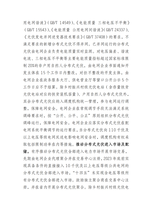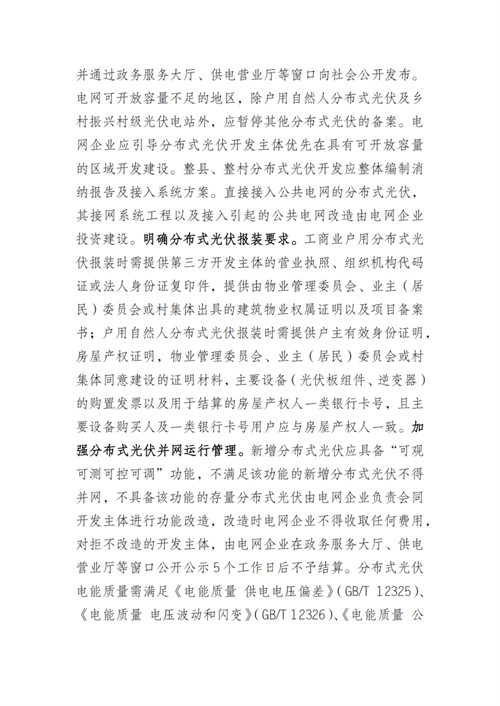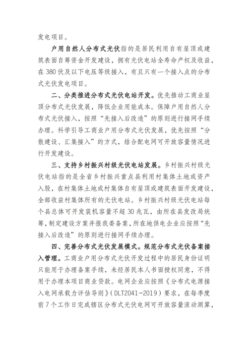 近日,湖南省發改委印發《關于進一步規范全省分布式光伏開發建設的通知》,明確指出企業租用農戶屋頂的戶用項目,按照工商業管理,采用“分散建設、匯集接入”方式建設。 文件明確分布式光伏發電分三類:即工商業屋頂分布式光伏、工商業戶用分布式光伏、戶用自然人分布式光伏。其中,戶用自然人分布式光伏:居民利用自有屋頂或建筑表面自籌資金開發建設,擁有光伏電站全壽命產權及收益,在 380伏及以下電壓等級接入,有且只有一個接入點的分布式光伏發電項目。 工商業戶用分布式光伏:第三方租用居民自有屋頂或建筑表面,通過出租設備等方式共建開發的分布式光伏發電項目。工商業戶用分布式光伏:居民身份證明只能用于辦理備案手續,未經居民本人書面授權同意,不得用于辦理本項目商業貸款。報裝時需提供第三方開發主體的營業執照、組織機構代碼證或法人身份證復印件,提供由物業管理委員會、業主(居民)委員會或村集體出具的建筑物業權屬證明以及項目備案書。 文件強調,除鄉村振興村級光伏電站(含存量扶貧光伏電站對應的扶貧裝機容量)、戶用自然人分布式光伏外,其余分布式光伏應納入調度機構統一管理,參與電網運行調整,保障電網安全。電網企業在常規調節手段無法滿足系統調峰要求時,按“公開、公平、公正”原則組織分布式光伏調峰運行,保障電網安全。 明確推動分布式光伏進入市場及配儲。有序推動分布式光伏全部進入電力市場開展市場交易,先期由電網企業代理聚合并在交易中心注冊,2023年底前實現具備條件的直接接入10千伏及以上電壓等級公共電網的分布式光伏全部進入市場,“十四五”末實現全電壓等級所有分布式光伏全部進入市場。 除鄉村振興村級光伏電站(含存量扶貧光伏電站對應的扶貧裝機容量)、戶用自然人分布式光伏外,其他分布式光伏(含存量)應配置不低于集中式光伏電站配儲比例的儲能,參照代理購電結算模式,通過湖南電力交易中心儲能容量市場進行結算,現階段結算價格按當期儲能容量市場交易均價出清。 此外,電網企業應在每季度前7個工作日完成轄區分布式光伏電網可開放容量滾動測算,并通過政務服務大廳、供電營業廳等窗口向社會公開發布。戶用自然人分布式光伏、鄉村振興村級光伏電站:所在地供電企業應按照“先接入后改造”的原則進行接網手續辦理工商業戶用分布式光伏:優先按照“分散建設、匯集接入”的方式,結合配電網可開放容量情況進行開發建設。電網可開放容量不足的地區,除戶用自然人分布式光伏及鄉村振興村級光伏電站外,應暫停其他分布式光伏的備案。 原文見下: