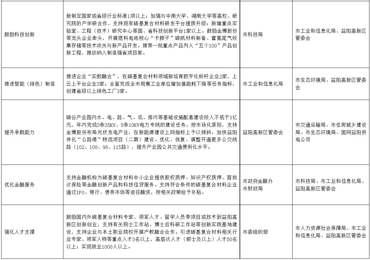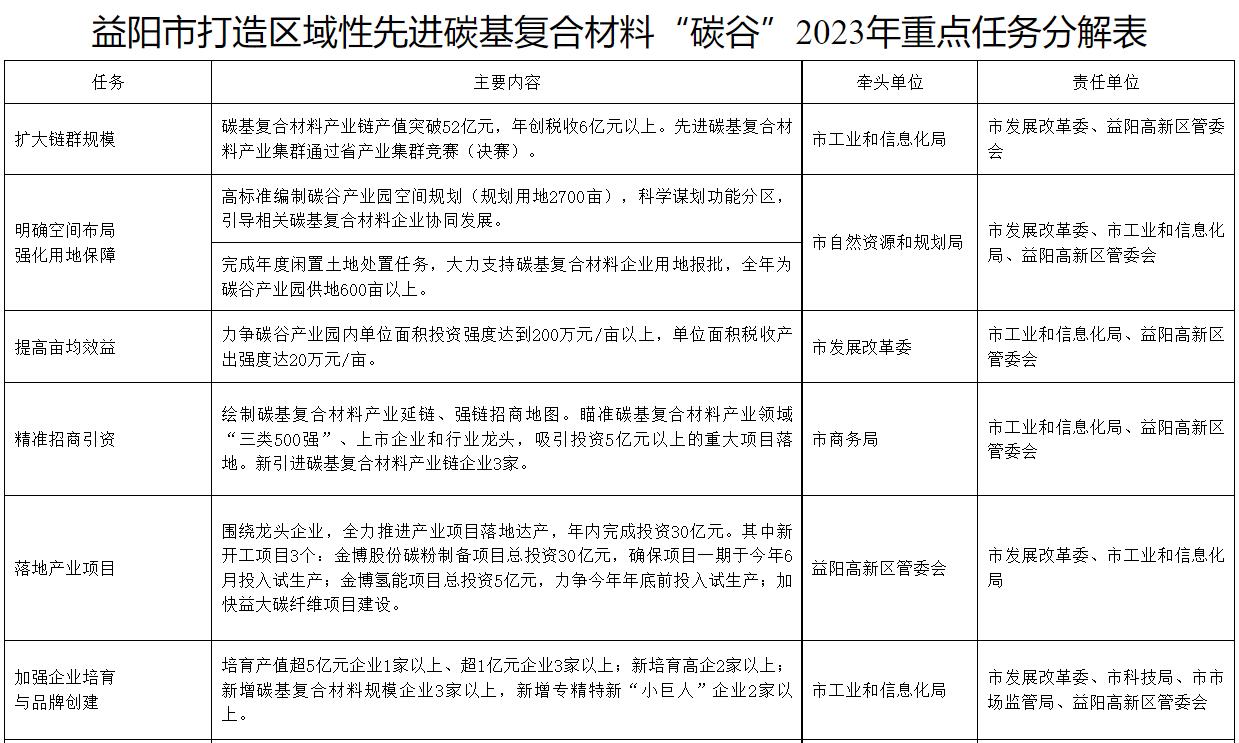 5月23日(ri),湖(hu)南省益陽市人民政(zheng)府印(yin)發《益陽市打(da)造區域性先進碳(tan)基復合材(cai)料“碳(tan)谷”三(san)年行動(dong)方(fang)案(2023-2025年)》,《方(fang)案》明確將以益陽高新區為主體,以金博股(gu)份為龍頭,集(ji)聚一批技術(shu)先(xian)進、效益良好的碳基復合材料生產、應用和服(fu)務型(xing)企業,打造國內一流、省內領(ling)先(xian)的區域性先(xian)進碳基復合材料“碳谷”。 2023年計(ji)劃新引進碳基復合(he)材料產業(ye)鏈企業(ye)3家,產業(ye)鏈年產值突(tu)破52億元(yuan),年創稅收6億元(yuan)以(yi)上。 2024年(nian)計劃新引進碳基(ji)復合材料產(chan)業鏈企(qi)業4家(jia),產(chan)業鏈年(nian)產(chan)值突破65億元,年(nian)創(chuang)稅收9億元以上。 2025年計劃新(xin)引(yin)進碳基(ji)復合材料產業鏈企業5家(jia),產業鏈年產值(zhi)突破80億元,年創稅(shui)收12億元以上。 充分發揮(hui)金博(bo)(bo)股(gu)份(fen)(fen)的核心引領作用,全面落實(shi)碳(tan)(tan)(tan)(tan)谷產(chan)業園項目(mu)(mu)建設計(ji)劃(hua),完成投資不低于(yu)100億元。圍繞(rao)金博(bo)(bo)股(gu)份(fen)(fen)產(chan)能擴張、新產(chan)品研發生產(chan),如期推進金博(bo)(bo)股(gu)份(fen)(fen)碳(tan)(tan)(tan)(tan)粉制備、金博(bo)(bo)氫能、京舟股(gu)份(fen)(fen)碳(tan)(tan)(tan)(tan)納米(mi)管、益大碳(tan)(tan)(tan)(tan)纖(xian)維、金博(bo)(bo)碳(tan)(tan)(tan)(tan)/陶剎(cha)車材(cai)料、金硅(gui)科技硅(gui)碳(tan)(tan)(tan)(tan)負極等項目(mu)(mu)落地建設,確保金博(bo)(bo)股(gu)份(fen)(fen)先進碳(tan)(tan)(tan)(tan)基復合材(cai)料擴大產(chan)能。 方案全文如下: 益陽市打造區域性先進碳基復合材料“碳谷”三年行動方案(2023-2025年) 為(wei)夯實我市碳基產業(ye)(ye)基礎,引(yin)導產業(ye)(ye)鏈企業(ye)(ye)集(ji)聚,向(xiang)高質量(liang)、高性能、高附加值(zhi)方(fang)向(xiang)發展,加快(kuai)打造區域(yu)性先進(jin)碳基復合材料“碳谷”,制定本(ben)行動方(fang)案(an)。 一、基礎條件 2004年,黃伯云院(yuan)士團隊完(wan)(wan)成(cheng)(cheng)(cheng)的(de)(de)(de)(de)“高性能(neng)碳(tan)(tan)(tan)/碳(tan)(tan)(tan)航空制(zhi)(zhi)動材(cai)(cai)料(liao)(liao)(liao)的(de)(de)(de)(de)制(zhi)(zhi)備技(ji)(ji)術”榮獲“國(guo)(guo)家(jia)技(ji)(ji)術發(fa)(fa)(fa)明(ming)一等(deng)獎”,次年金(jin)(jin)博(bo)(bo)(bo)科(ke)(ke)技(ji)(ji)(現金(jin)(jin)博(bo)(bo)(bo)股(gu)(gu)(gu)(gu)份(fen)(fen)(fen))落戶(hu)益(yi)陽高新(xin)區(qu)(qu),開啟了碳(tan)(tan)(tan)基(ji)(ji)復(fu)合(he)(he)材(cai)(cai)料(liao)(liao)(liao)民(min)用探(tan)索之(zhi)路。目(mu)(mu)前,我市(shi)(shi)以益(yi)陽高新(xin)區(qu)(qu)為主體、以金(jin)(jin)博(bo)(bo)(bo)股(gu)(gu)(gu)(gu)份(fen)(fen)(fen)為龍頭的(de)(de)(de)(de)碳(tan)(tan)(tan)基(ji)(ji)復(fu)合(he)(he)材(cai)(cai)料(liao)(liao)(liao)產(chan)(chan)業(ye)(ye)(ye)(ye)(ye)已初具規(gui)(gui)模。一是(shi)產(chan)(chan)業(ye)(ye)(ye)(ye)(ye)發(fa)(fa)(fa)展恰逢其(qi)(qi)時。碳(tan)(tan)(tan)基(ji)(ji)復(fu)合(he)(he)材(cai)(cai)料(liao)(liao)(liao)是(shi)目(mu)(mu)前新(xin)材(cai)(cai)料(liao)(liao)(liao)產(chan)(chan)業(ye)(ye)(ye)(ye)(ye)中(zhong)最為活躍(yue)和迅猛發(fa)(fa)(fa)展的(de)(de)(de)(de)領(ling)域之(zhi)一。湖南(nan)省已制(zhi)(zhi)定(ding)出(chu)臺碳(tan)(tan)(tan)基(ji)(ji)材(cai)(cai)料(liao)(liao)(liao)產(chan)(chan)業(ye)(ye)(ye)(ye)(ye)鏈三(san)(san)年行動計劃,建(jian)(jian)(jian)設國(guo)(guo)內先(xian)進(jin)的(de)(de)(de)(de)碳(tan)(tan)(tan)基(ji)(ji)復(fu)合(he)(he)材(cai)(cai)料(liao)(liao)(liao)研(yan)發(fa)(fa)(fa)和成(cheng)(cheng)(cheng)果轉(zhuan)化(hua)(hua)基(ji)(ji)地(di),我市(shi)(shi)加快碳(tan)(tan)(tan)基(ji)(ji)復(fu)合(he)(he)材(cai)(cai)料(liao)(liao)(liao)產(chan)(chan)業(ye)(ye)(ye)(ye)(ye)發(fa)(fa)(fa)展處(chu)在難(nan)得的(de)(de)(de)(de)機(ji)遇期。二是(shi)產(chan)(chan)業(ye)(ye)(ye)(ye)(ye)集(ji)(ji)聚(ju)初具規(gui)(gui)模。2022年全市(shi)(shi)碳(tan)(tan)(tan)基(ji)(ji)復(fu)合(he)(he)材(cai)(cai)料(liao)(liao)(liao)產(chan)(chan)業(ye)(ye)(ye)(ye)(ye)完(wan)(wan)成(cheng)(cheng)(cheng)產(chan)(chan)值42億元(yuan),現有(you)(you)金(jin)(jin)博(bo)(bo)(bo)股(gu)(gu)(gu)(gu)份(fen)(fen)(fen)、華拓碳(tan)(tan)(tan)素等(deng)碳(tan)(tan)(tan)基(ji)(ji)復(fu)合(he)(he)材(cai)(cai)料(liao)(liao)(liao)產(chan)(chan)業(ye)(ye)(ye)(ye)(ye)鏈企(qi)業(ye)(ye)(ye)(ye)(ye)20家(jia),其(qi)(qi)中(zhong)本土上(shang)市(shi)(shi)企(qi)業(ye)(ye)(ye)(ye)(ye)1家(jia)。“先(xian)進(jin)碳(tan)(tan)(tan)基(ji)(ji)復(fu)合(he)(he)材(cai)(cai)料(liao)(liao)(liao)產(chan)(chan)業(ye)(ye)(ye)(ye)(ye)集(ji)(ji)群(qun)”入選省級(ji)先(xian)進(jin)制(zhi)(zhi)造業(ye)(ye)(ye)(ye)(ye)產(chan)(chan)業(ye)(ye)(ye)(ye)(ye)集(ji)(ji)群(qun)培育名單(dan)。由金(jin)(jin)博(bo)(bo)(bo)股(gu)(gu)(gu)(gu)份(fen)(fen)(fen)主導建(jian)(jian)(jian)設的(de)(de)(de)(de)碳(tan)(tan)(tan)谷產(chan)(chan)業(ye)(ye)(ye)(ye)(ye)園,規(gui)(gui)劃用地(di)2700畝,已供地(di)超過1200畝,總(zong)投(tou)(tou)(tou)資(zi)約200億元(yuan),已列為省、市(shi)(shi)、區(qu)(qu)重點產(chan)(chan)業(ye)(ye)(ye)(ye)(ye)項目(mu)(mu)。三(san)(san)是(shi)產(chan)(chan)品技(ji)(ji)術優勢(shi)明(ming)顯。金(jin)(jin)博(bo)(bo)(bo)股(gu)(gu)(gu)(gu)份(fen)(fen)(fen)是(shi)國(guo)(guo)內領(ling)先(xian)的(de)(de)(de)(de)先(xian)進(jin)碳(tan)(tan)(tan)基(ji)(ji)復(fu)合(he)(he)材(cai)(cai)料(liao)(liao)(liao)制(zhi)(zhi)造企(qi)業(ye)(ye)(ye)(ye)(ye)。全市(shi)(shi)碳(tan)(tan)(tan)基(ji)(ji)復(fu)合(he)(he)材(cai)(ca