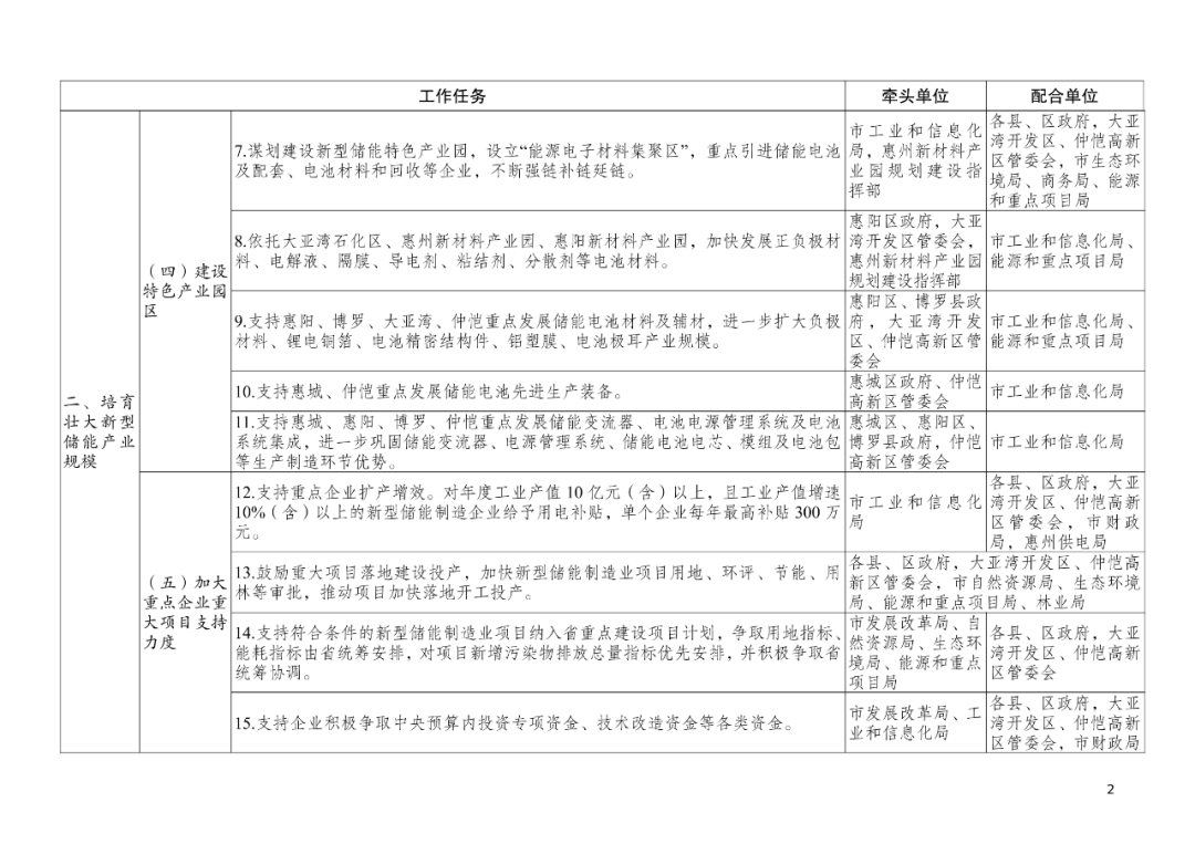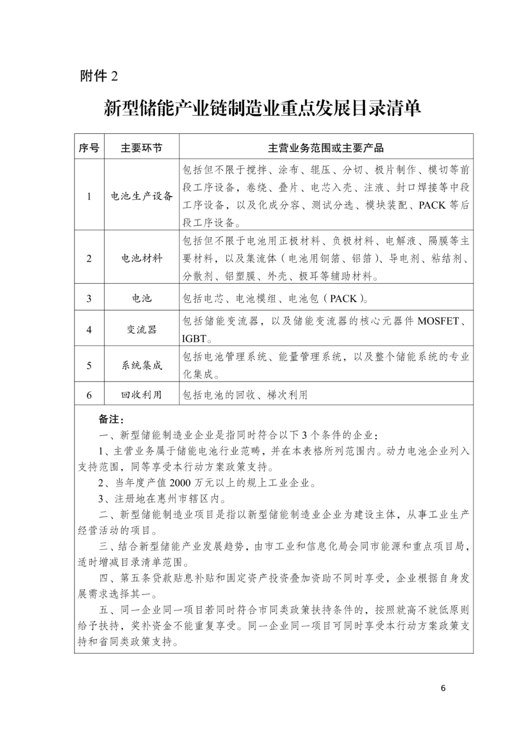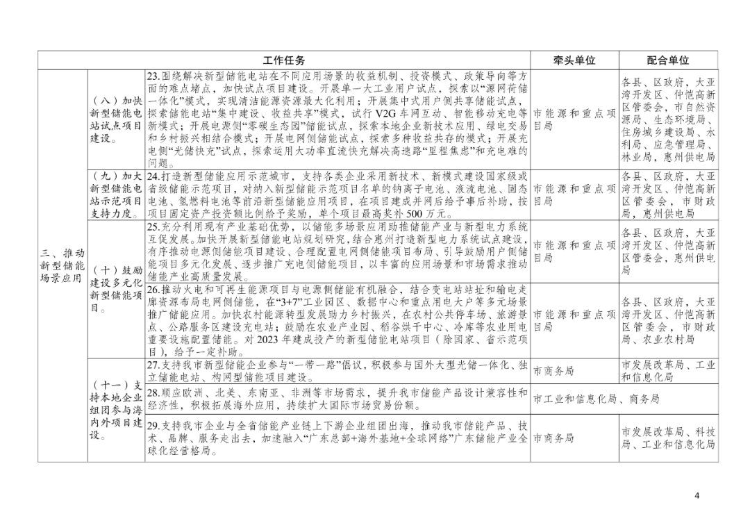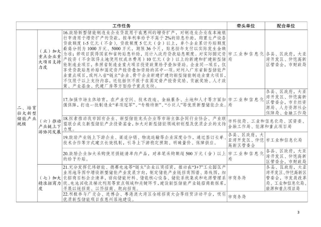 7月7日,廣東惠州市人民政府發布《推動新型儲能產業高質量發展行動方案》,明確到新型儲能裝機2025年力爭達到3GW、2027年力爭達6GW,而且對儲能項目和儲能制造業將給予補貼,文件有效期3年。 《行動方案》提出目標,到2025年,儲能電池產能力爭達到110GWh,新型儲能裝機力爭達到300萬千瓦。到2027年,儲能電池產能力爭達到160GWh,新型儲能裝機力爭達到600萬千瓦。 《行動方案》提出,對納入新型儲能示范項目名單的鈉離子電池、液流電池、固態電池、氫燃料電池等前沿新型儲能應用項目,建成并網后給予事后補助,按項目固定資產投資額比例給予獎勵,單個項目最高獎補500萬元。 文件鼓勵建設多元化新型儲能項目。推動火電和可再生能源項目與電源側儲能有機融合,結合變電站站址和輸電走廊資源布局電網側儲能,在“3+7”工業園區、數據中心和重點用電大戶等多元場景推廣儲能應用。鼓勵在農業產業園、稻谷烘干中心、冷庫等農業用電重要設施配置儲能。對2023年建成投產的新型儲能電站項目給予一定補助。 《行動方案》還提出加大重點企業重大項目支持力度。對年產值10億元以上,且工業產值增速10%以上的新型儲能制造企業給予用電補貼,單個企業每年最高補貼300萬元。對制造業企業在本地銀行申請用于增資擴產的貸款,按年利率給予不高于2%的貼息補助,購置生產設備貸款額度1-5億元、貸款額度5億元以上,單個企業累計補貼額度最高分別為1000萬元、5000萬元,期限36個月。對實際固定資產投資10億元以上的新建和擴建新型儲能制造業項目,參照省制造業重大項目投資政策給予疊加資助。 政策原文及解讀如下: 惠州市人民政府辦公室關于印發 《惠州市推動新型儲能產業高質量發展行動方案》的通知 惠府辦〔2023〕20號 各縣、區人民政府,市政府各工作部門: 《惠州市推動新型儲能產業高質量發展行動方案》業經市人民政府同意,現印發給你們,請認真貫徹實施。實施過程中遇到的問題,請徑向市發展改革局、工業和信息化局、能源和重點項目局反映。 惠州市人民政府辦公室 2023年7月4日 惠州市推動新型儲能產業高質量發展行動方案 為推動惠州市新型儲能產業高質量發展,根據省政府辦公廳印發的《廣東省推動新型儲能產業高質量發展的指導意見》(粵府辦〔2023〕4號)、省制造強省建設領導小組辦公室印發的《關于加快推動新型儲能產品高質量發展的若干措施》(惠制造強市辦〔2023〕8號)等文件精神,結合我市實際,制定本行動方案。 一、發展目標 新型儲能研發能力不斷增強,產業鏈關鍵材料、核心設備制造產業規模持續擴大,電池回收及梯次利用體系基本完善,推動產業鏈供應鏈協同創新發展。積極搶占新型儲能產業制高點,打造儲能電池產業集聚區,努力把惠州打造成為國內新型儲能產業發展高地和粵港澳大灣區新型儲能應用示范城市,通過試點示范拓展應用場景,把新型儲能打造成為產業發展新引擎。到2025年,新型儲能產業集群產值力爭達到1800億元,全市儲能電池總產能力爭達到110GWh,全市新型儲能裝機規模力爭達到300萬千瓦。到2027年,新型儲能產業集群產值力爭達到3500億元,全市儲能電池總產能力爭達到160GWh,全市新型儲能裝機規模力爭達到600萬千瓦。 二、提升新型儲能研發創新能力 (一)完善研發創新機制。依托東江實驗室組建惠州市新型儲能技術創新聯盟,積極承擔攻關省級以上新型儲能領域項目,并在太陽能硅片精密切割、鋰電池隔膜材料、基于核孔膜的多孔復合集流體、熱光伏電池、鹽湖提鋰、風電超導風機等領域開展應用基礎研究。在東江實驗室科研經費中設立新型儲能科研專項,對創新聯盟成員開展的新型儲能項目、建立研發平臺、技術成果轉化等給予支持,對我市企業或科研單位承擔國家和省級新型儲能科技重大項目且獲得經費支持的,市級財政按一定支持比例予以配套。 (二)突破關鍵核心技術。圍繞鋰電池生產設備、鋰離子電池、鈉離子電池、能源電子信息、全過程安全技術、智慧調控、氫儲能及儲能前瞻技術等重點領域和關鍵環節,持續組織“揭榜掛帥”市級科技計劃項目,設立“新型儲能”專題,加大資金支持力度,支持企業開展關鍵核心技術攻關。支持我市企業、高校和科研院所在新型儲能領域開展聯合攻關,突破新型儲能領域技術封鎖和核心技術“卡脖子”問題。 (三)鼓勵企業開展技術創新。落實企業研發費用加計扣除優惠政策,鼓勵我市儲能電池制造企業在鈉離子電池、固態電池、液流電池和氫燃料電池等新領域加大研發投入力度,前瞻布局新一代儲能技術及裝備。支持企業創建制造業創新中心、企業技術中心、工程技術研究中心、工程研究中心等產業創新載體,提升新型儲能領域技術研發、中試孵化、技術應用推廣等能力。 三、培育壯大新型儲能產業規模 (四)建設特色產業園區。聯動廣深莞打造珠江口東岸新型儲能電池產業、電池材料生產、電池生產、儲能系統及裝備生產、電池綜合利用等集聚區。謀劃建設新型儲能特色產業園,設立“能源電子材料集聚區”,重點引進儲能電池及配套、電池材料和回收等企業,不斷強鏈補鏈延鏈。依托大亞灣石化區、惠州新材料產業園、惠陽新材料產業園,加快發展正負極材料、電解液、隔膜、導電劑、粘結劑、分散劑等電池材料。支持惠陽、博羅、大亞灣、