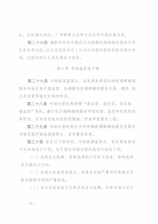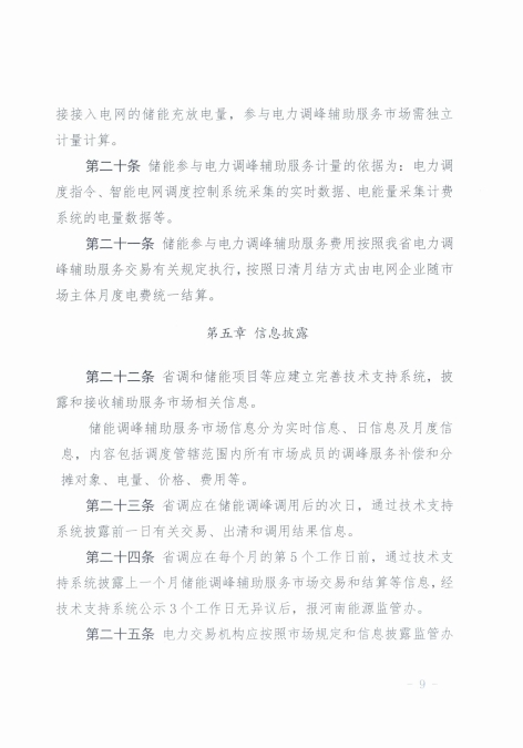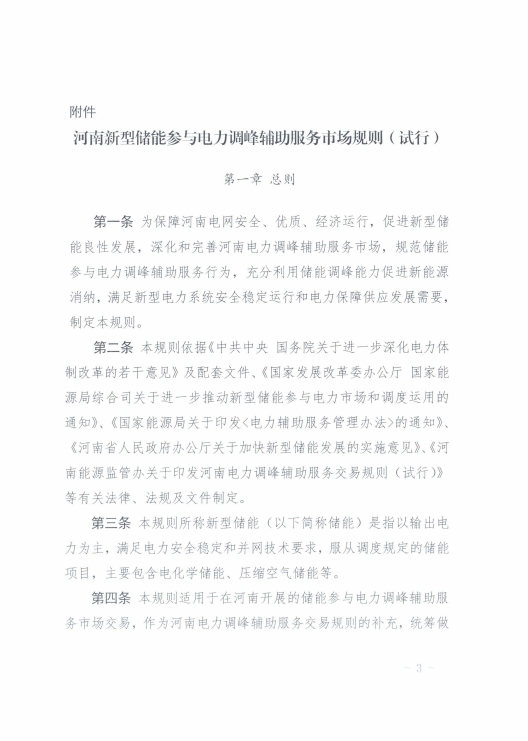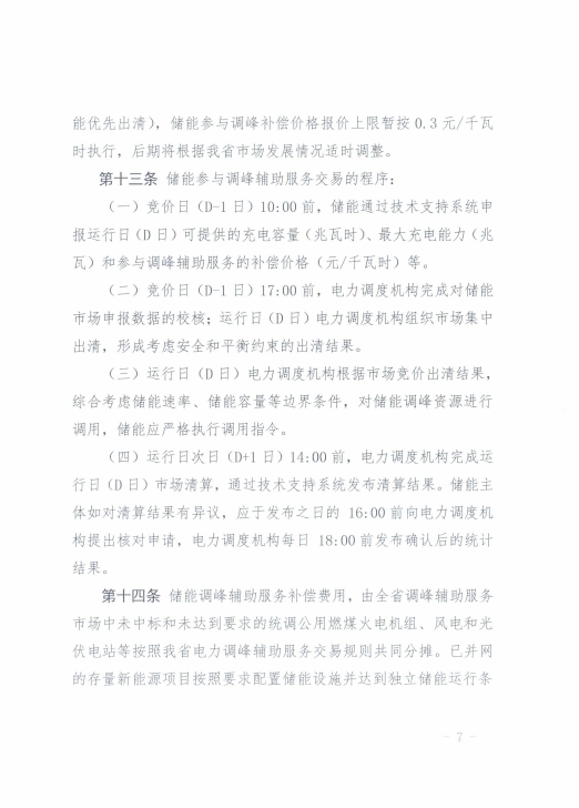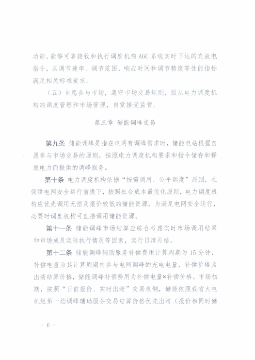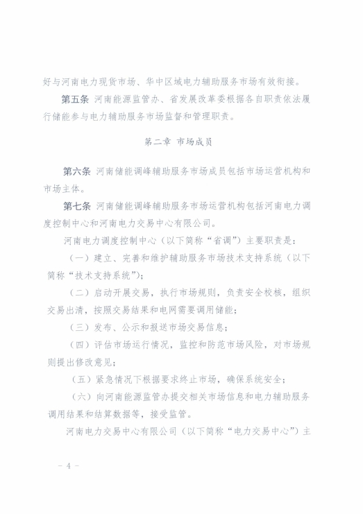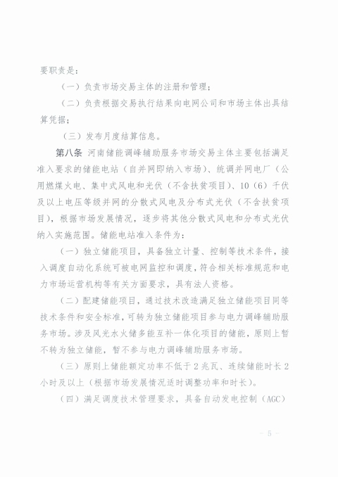 7月18日,河(he)南(nan)(nan)能源監管辦印發《河(he)南(nan)(nan)新型(xing)儲能參與電(dian)力調峰輔(fu)助(zhu)服務(wu)市(shi)場規則(試行)》。 《規則》提出,對準入(ru)要(yao)求(qiu)的儲(chu)能(neng)電(dian)站(zhan)(自并網(wang)即納入(ru)市場)、統調并網(wang)電(dian)廠(公用燃煤火電(dian)、集中式(shi)風(feng)電(dian)和(he)(he)光(guang)伏(fu)(fu)(不含扶貧項目(mu))、10(6)千伏(fu)(fu)及以(yi)上電(dian)壓(ya)等級并網(wang)的分散式(shi)風(feng)電(dian)及分布式(shi)光(guang)伏(fu)(fu)(不含扶貧項目(mu)),根據(ju)市場發展情況(kuang),逐步(bu)將其他分散式(shi)風(feng)電(dian)和(he)(he)分布式(shi)光(guang)伏(fu)(fu)納入(ru)實施范圍(wei)。儲(chu)能(neng)電(dian)站(zhan)準入(ru)條(tiao)件為: (一)獨(du)(du)立儲能項目,具備(bei)獨(du)(du)立計量、控制(zhi)等技術條件,接入調度自動化系統可被電(dian)網監控和(he)調度,符(fu)合(he)相關標準規(gui)范和(he)電(dian)力市場運營機(ji)構等有關方面要求,具有法人資格(ge)。 (二(er))配(pei)建儲(chu)能(neng)(neng)項(xiang)目(mu)(mu),通過技(ji)術改(gai)造滿足獨立儲(chu)能(neng)(neng)項(xiang)目(mu)(mu)同等技(ji)術條件和(he)安全(quan)標準,可轉(zhuan)為獨立儲(chu)能(neng)(neng)項(xiang)目(mu)(mu)參與電(dian)力調峰(feng)輔助服(fu)務(wu)市(shi)場(chang)。涉及風光(guang)水(shui)火儲(chu)多能(neng)(neng)互補一體化項(xiang)目(mu)(mu)的儲(chu)能(neng)(neng),原(yuan)則上暫不轉(zhuan)為獨立儲(chu)能(neng)(neng),暫不參與電(dian)力調峰(feng)輔助服(fu)務(wu)市(shi)場(chang)。 (三)原則上(shang)儲能額定功率(lv)不低于(yu)2兆瓦、連(lian)續儲能時(shi)長(chang)2小時(shi)及(ji)以上(shang)(根據市場(chang)發(fa)展情況適時(shi)調整功率(lv)和時(shi)長(chang))。 (四) 滿(man)足調(diao)度(du)技術管理要求, 具(ju)備自動發電控制(AGC)功(gong)能(neng)(neng), 能(neng)(neng)夠(gou)可靠接(jie)收(shou)和執(zhi)行調(diao)度(du)機構AGC系統實時下達的充放電指(zhi)(zhi)令,其調(diao)節速率、調(diao)節范圍、響應(ying)時間(jian)和調(diao)節精度(du)等性能(neng)(neng)指(zhi)(zhi)標(biao)(biao)滿(man)足相關標(biao)(biao)準要求。 儲能調峰(feng)(feng)輔(fu)助(zhu)(zhu)服務補償(chang)費(fei)用(yong),由全省調峰(feng)(feng)輔(fu)助(zhu)(zhu)服務市場(chang)中未(wei)中標和未(wei)達(da)到要求(qiu)(qiu)的(de)(de)(de)統調公用(yong)燃煤火電機組、風(feng)電和光伏電站等(deng)按(an)照(zhao)(zhao)我省電力(li)調峰(feng)(feng)輔(fu)助(zhu)(zhu)服務交(jiao)易規(gui)則(ze)共同分(fen)攤。已并網的(de)(de)(de)存量新能源項目按(an)照(zhao)(zhao)要求(qiu)(qiu)配(pei)置(zhi)儲能設施并達(da)到獨立儲能運行(xing)條件(jian)要求(qiu)(qiu)的(de)(de)(de),參(can)與(yu)輔(fu)助(zhu)(zhu)服務分(fen)攤時給予一定減免。按(an)照(zhao)(zhao)國家提(ti)出的(de)(de)(de)“誰(shui)提(ti)供、誰(shui)獲利,誰(shui)受益、誰(shui)承擔(dan)”原(yuan)則(ze),逐步將電力(li)用(yong)戶等(deng)納入合理分(fen)攤范圍,成通過系統運行(xing)費(fei)進行(xing)合理疏導(dao)。 原文如下: