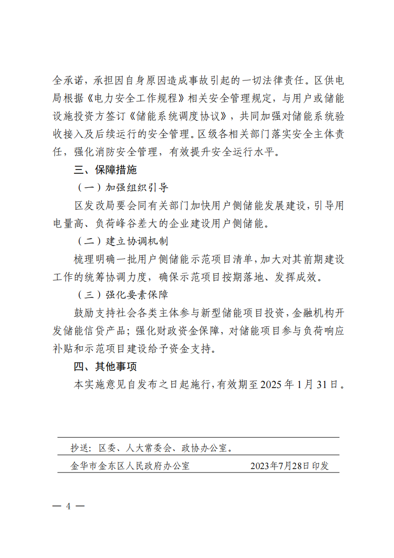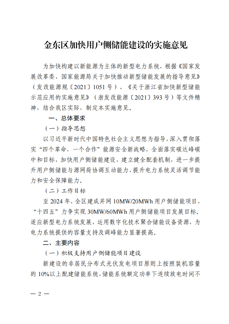 8月2日(ri),浙(zhe)江金(jin)華金(jin)東區(qu)人(ren)民(min)政府(fu)發(fa)布《金(jin)東區(qu)加快(kuai)用(yong)戶(hu)側(ce)儲(chu)能(neng)建設(she)的實(shi)施意見(jian)》。至2024年(nian),金(jin)東區(qu)建成并網10MW/20MWh用(yong)戶(hu)側(ce)儲(chu)能(neng)項(xiang)目(mu),“十四五”力爭實(shi)現(xian)30MW/60MWh用(yong)戶(hu)側(ce)儲(chu)能(neng)項(xiang)目(mu)發(fa)展目(mu)標。 《意見》提到,新建設的非居民分布式光伏(fu)發電(dian)項目原則上按照裝機容量的10%以上(shang)配建儲能(neng)系統,儲能系統額定功率下連續放電時間不(bu)低于2小時(shi)。 同時,還提到,用戶側儲能項目應接入金華全域虛擬電廠平臺,積極參與電力需求響應和輔助服務。按(an)負荷(he)響(xiang)應期(qi)間峰段(duan)放電量0.25元/千瓦時給予補貼(tie),負荷響應期為7、8、12、1月份。 原文如下: 金(jin)華(hua)市(shi)金(jin)東(dong)區人民政府辦(ban)公室關于(yu)印(yin)發(fa)《金(jin)東(dong)區加(jia)快用戶(hu)側儲能建設的(de)實施意(yi)見(jian)》的(de)通知 各(ge)鄉鎮(zhen)(街道(dao))、區直屬(shu)各(ge)部門: 為推動我區新型(xing)儲能快速發(fa)展,提升電力系(xi)統(tong)靈活調節能力和安全保障能力,現(xian)將《金東區加快用(yong)戶側儲能建設(she)的(de)實(shi)施意見》印發(fa)給你們,請(qing)認真貫徹(che)落實(shi)。 金(jin)華市(shi)金(jin)東(dong)區(qu)人民政府辦(ban)公(gong)室 2023年7月28日(ri) 金(jin)東區加快(kuai)用戶側儲能建設的實施意(yi)見 為(wei)加(jia)快(kuai)構建以新(xin)能(neng)(neng)(neng)源為(wei)主(zhu)體的(de)新(xin)型電力(li)系統(tong),根據《國家發展改革委、國家能(neng)(neng)(neng)源局關于加(jia)快(kuai)推動新(xin)型儲能(neng)(neng)(neng)發展的(de)指導意(yi)見(jian)》(發改能(neng)(neng)(neng)源規(gui)〔2021〕1051號(hao))、《關于浙江省加(jia)快(kuai)新(xin)型儲能(neng)(neng)(neng)示范應用的(de)實施(shi)意(yi)見(jian)》(浙發改能(neng)(neng)(neng)源〔2021〕393號(hao))等文件精(jing)神,結合我區實際,制定本實施(shi)意(yi)見(jian)。 一、總體要求 (一)指導思想 以習(xi)近平新(xin)(xin)時(shi)代中國特色社(she)會(hui)主(zhu)義思想為指(zhi)導,深入(ru)貫徹(che)落實(shi)“四個革命,一個合作”能(neng)源安全(quan)(quan)新(xin)(xin)戰略,全(quan)(quan)面落實(shi)碳(tan)達峰(feng)碳(tan)中和(he)(he)目標(biao),加快用(yong)戶側儲能(neng)建設,建立健全(quan)(quan)配套機制(zhi),進一步提升用(yong)戶側儲能(neng)與源網荷(he)協調互動能(neng)力(li),提升電力(li)系統靈活調節能(neng)力(li)和(he)(he)安全(quan)(quan)保障(zhang)能(neng)力(li)。 (二)工作目標 至2024年,全(quan)區建成并網10MW/20MWh用(yong)戶(hu)側儲(chu)能項目,“十四五”力(li)爭實現30MW/60MWh用(yong)戶(hu)側儲(chu)能項目發(fa)展目標。適應新型電力(li)系統(tong)發(fa)展,運用(yong)數字(zi)化技術聚合儲(chu)能設備資源,為電力(li)系統(tong)提供(gong)的容量支持及調峰能力(li)顯著提高。 二、主要內容 (一)積極支(zhi)持用(yong)戶(hu)側儲能項(xiang)目(mu)建設(she) 新建(jian)設的(de)非居民分布式(shi)光伏(fu)(fu)(fu)發電(dian)(dian)項(xiang)目原則上按照(zhao)裝(zhuang)機(ji)容量的(de)10%以上配建(jian)儲(chu)(chu)能(neng)(neng)系統,儲(chu)(chu)能(neng)(neng)系統額定功率(lv)下連續(xu)放(fang)電(dian)(dian)時(shi)間不低于2小(xiao)時(shi),提高光伏(fu)(fu)(fu)發電(dian)(dian)就地消納能(neng)(neng)力(li)。光伏(fu)(fu)(fu)項(xiang)目配建(jian)的(de)儲(chu)(chu)能(neng)(neng)系統可自(zi)建(jian)或采用(yong)儲(chu)(chu)能(neng)(neng)配額置換交易模(mo)式(shi)。鼓勵(li)企業用(yong)戶或綜(zong)合(he)能(neng)(neng)源服務商根據(ju)負(fu)荷特性建(jian)設儲(chu)(chu)能(neng)(neng)設施,充分利用(yong)目錄(lu)分時(shi)電(dian)(dian)價機(ji)制,主動削峰(feng)填(tian)谷,優化區域電(dian)(dian)網負(fu)荷需(xu)求。 (二)優(you)化(hua)用戶側儲能項目并網(wang)服務 區(qu)供(gong)(gong)電(dian)(dian)局持(chi)續加大配電(dian)(dian)網投資力度(du),對用(yong)戶(hu)側(ce)儲能項目接入的電(dian)(dian)網側(ce)電(dian)(dian)力配套設施,延伸(shen)投資界面(mian)到客戶(hu)紅線。用(yong)戶(hu)側(ce)儲能新裝、增(zeng)容項目,應(ying)按(an)相關(guan)規定(ding)完成(cheng)項目備案后向區(qu)供(gong)(gong)電(dian)(dian)局辦理(li)并(bing)(bing)網申(shen)請手續,經區(qu)供(gong)(gong)電(dian)(dian)局及相關(guan)部門驗收合格后方可(ke)并(bing)(bing)網。區(qu)供(gong)(gong)電(dian)(dian)局要(yao)按(an)照積(ji)極服務(wu)、簡潔高效原(yuan)則(ze),進一步優化內部流程,加快業務(wu)辦理(li)速度(du),優先為用(yong)戶(hu)側(ce)儲能項目提供(gong)(gong)電(dian)(dian)網接入服務(wu)。 (三)鼓勵(li)用戶側儲能參與虛(xu)擬電廠(chang)負荷調節 積(ji)極運用(yong)數字(zi)化技術(shu)對(dui)分布式(shi)儲(chu)(chu)能設施開展平臺(tai)聚(ju)合(he),用(yong)戶側儲(chu)(chu)能項(xiang)目(mu)應(ying)接入金華全域虛擬電(dian)廠平臺(tai),積(ji)極參與電(dian)力(li)需求響(xiang)應(ying)和輔助服務,充分發揮靈活(huo)、可調性(xing)儲(chu)(chu)能資(zi)源在新型(xing)電(dian)力(li)系(xi)統中(zhong)的平衡作用(yong)。對(dui)參與金華全域虛擬電(dian)廠負(fu)荷(he)調控的儲(chu)(chu)能項(xiang)目(mu),按負(fu)荷(he)響(xiang)應(ying)期(qi)間峰段放電(dian)量(liang)0.25元/千瓦時給予補(bu)貼(tie),負(fu)荷(he)響(xiang)應(ying)期(qi)為7、8、12、1月份。補(bu)貼(tie)期(qi)自發文之日(ri)起至