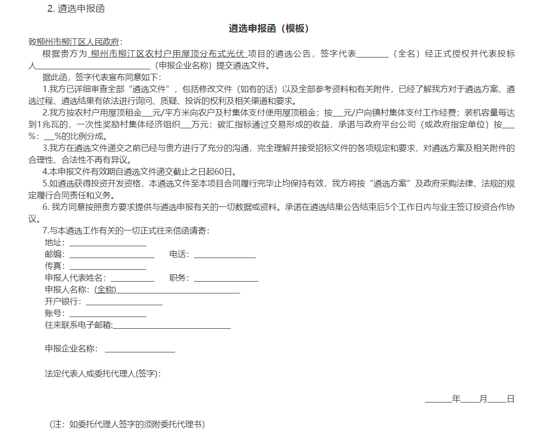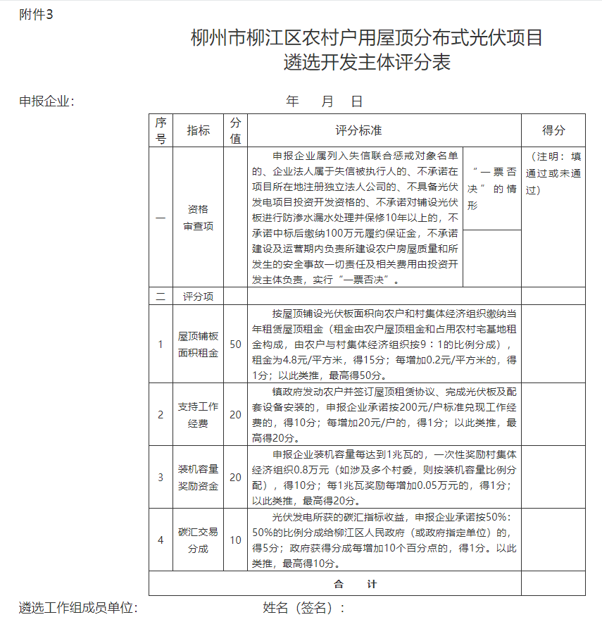 8月10日,廣西柳州市柳江區發布《柳江區農村戶用屋頂分布式光伏項目投資開發主體遴選公告》,在全國范圍內擇優遴選柳州市柳江區農村戶用屋頂分布式光伏項目投資開發主體2家,項目建設期2年、運營期20年。運營期滿后,如具備開發主體無租金拖欠、無矛盾糾紛、無拖欠企業稅費、屋頂光伏設施無安全隱患等情形的,經協調同意后可延續運營期5年。 評分細則中,屋頂鋪板面積租金指標(分值50分);工作經費指標(分值20分);裝機容量獎勵資金指標(分值20分);碳匯交易分成指標(分值10分)。 以下為原文: 為貫徹落實黨中央、國務院關于鄉村振興、碳達峰碳中和的重大決策部署,落實“千家萬戶沐光行動”,加快推進能源綠色轉型,促進村集體經濟持續發展,結合柳江實際,依據柳江區人民政府部署要求,為充分體現市場公平競爭原則,現面向社會公開遴選確定柳州市柳江區農村戶用屋頂分布式光伏項目投資開發主體。現將有關事項公告如下: 一、遴選內容 在全國范圍內擇優遴選柳州市柳江區農村戶用屋頂分布式光伏項目投資開發主體2家(其中,第1名負責拉堡、進德、百朋、穿山4個鎮區域的開發建設,第2名負責成團、三都、里高、土博4個鎮區域的開發建設)。項目建設期2年、運營期20年。運營期滿后,如具備開發主體無租金拖欠、無矛盾糾紛、無拖欠企業稅費、屋頂光伏設施無安全隱患等情形的,經協調同意后可延續運營期5年。 二、遴選規則 在區人民政府的領導下,由區委組織部、區發展改革局、住建局、農業農村局、鄉村振興局、自然資源局、財政局、工信局、稅務局、柳江供電局、投資促進中心、應急局、城管執法局、投資集團、各鎮政府等單位對申報投資農村戶用屋頂分布式光伏項目的企業(簡稱“申報企業”)采用綜合評分法進行遴選。遴選評分所得分值由高到低排序名次,擇優遴選排位前2名為投資開發主體(若申報企業只有1家,則通過投資資格審查后,報區政府審核同意確認為柳州市柳江區農村戶用屋頂分布式光伏項目投資開發主體)。 三、遴選評分細則 對申報企業的綜合評分,主要從屋頂鋪板面積租金、工作經費、裝機容量獎勵、碳匯交易指標分成等指標進行評分。綜合評分總分100分,具體遴選指標及分值如下: (一)屋頂鋪板面積租金指標(分值50分) 每年1月底前(其中2023年為10月31日前)按屋頂鋪設光伏板面積向農戶和村集體經濟組織繳納當年租賃屋頂租金(租金由農戶屋頂租金和占用農村宅基地租金構成,由農戶與村集體經濟組織按9︰1的比例分成),租金為4.8元/平方米,得15分;每增加0.2元/平方米的,得1分;以此類推,最高得50分。 (二)工作經費指標(分值20分) 鎮政府發動農戶并簽訂屋頂租賃協議、完成光伏板及配套設備安裝的,申報企業承諾按200元/戶標準兌現工作經費的,得10分;每增加20元/戶的,得1分;以此類推,最高得20分。 (三)裝機容量獎勵資金指標(分值20分) 申報企業裝機容量每達到1兆瓦的,一次性獎勵村集體經濟組織0.8萬元(如涉及多個村委,則按裝機容量比例分配),得10分;每1兆瓦獎勵每增加0.05萬元的,得1分;以此類推,最高得20分。 (四)碳匯交易分成指標(分值10分) 光伏發電所獲的碳匯指標收益,申報企業承諾按50%:50%的比例分成給柳江區人民政府(或政府指定單位)的,得5分;政府分成每增加10個百分點的,得1分。以此類推,最高得10分。 四、遴選公告及時間 經區人民政府同意,由區發展改革局在柳江區政府門戶網站發布本遴選公告。時間自2023年8月10日至2023年8月18日。 五、遴選材料報送 有意報名的申報企業,請于2023年8月21日上午9:00前攜帶企業營業執照原件、法人身份證原件(或攜帶委托書及受委托人身份證原件)、遴選文件報送至區發展改革局項目股(地址:柳江區拉堡鎮柳堡路340號,聯系人:鄒佳文,聯系電話:0772-7226199),逾期不予受理。具體遴選日期待定(晚于2023年8月21日上午9:00)。 六、遴選流程 (一)遴選工作組:由區人民政府分管領導牽頭組織區委組織部、區發展改革局、住建局、農業農村局、鄉村振興局、自然資源局、財政局、工信局、稅務局、柳江供電局、投資促進中心、應急局、城管執法局、區投資集團、各鎮人民政府各1名領導(或業務人員)組成遴選工作組,由區政府分管領導擔任工作組長(或由成員推薦工作組長1名),由組長主持開展遴選工作。 (二)遴選工作組負責遴選事務,并獨立履行下列職責: 1.對申報企業的投資開發資格進行審查; 2對申報企業進行遴選評分; 3.按綜合得分排序確定投資開發主體候選名單,并向區人民政府推薦入選投資開發主體名單。 七、遴選程序及方法 遴選工作組的評審程序分為資格審查、綜合評分、擬定投資開發主體。 (一)資格審查 遴選工作組根據申報企業提交的企業營業執照原件、法人身份證原件(或委托書和受委托人身份證原件)、遴選文件進行資格審查。重點審查申報企業是否符合投資開發主體資格,包括不屬列入失信聯合懲戒對象名單,企業法人不屬于失信被執行人,承諾在項目所在地注冊獨立法人公司,具備光伏發電項目投資開發資格的營業執照,承諾對鋪設光伏板進行防滲水漏水處理并保修10年以上的,承諾中標后繳納100萬元履約保證金,承諾建設及運營期內負責所建設農戶房屋質量和所發生的安全事故一切責任及相關費用由投資開發主體負責。以上條件同時具備的且在遴選文件中