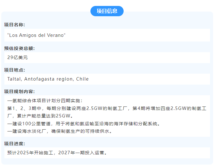 近日,全球(qiu)科技巨(ju)頭西(xi)門子與Verano Energy簽(qian)署諒解備忘錄(lu),雙方將(jiang)在智利開發(fa)“Los Amigos del Verano”綠(lv)氫生產綜合項(xiang)目(mu)。據悉,該綠(lv)氫項(xiang)目(mu)總投資(zi)約29億美元(yuan),項(xiang)目(mu)產能達到25GW。 Los Amigos del Verano綠氫(qing)綜合體項目建設地(di)點位于智利安托法加斯塔地(di)區(qu),計劃分為四(si)期進行建設。第一、第二和第三期各包括(kuo)2個(ge)制氫(qing)單(dan)元(yuan)(yuan),每個(ge)制氫(qing)單(dan)元(yuan)(yuan)產能為2.5GW;第四(si)期包括(kuo)4個(ge)制氫(qing)單(dan)元(yuan)(yuan),單(dan)個(ge)制氫(qing)單(dan)元(yuan)(yuan)產能為2.5GW,最終形(xing)成25GW的總(zong)產量。 該(gai)項目(mu)計劃(hua)于(yu)2025年開(kai)工(gong)建設,首期預(yu)計2027年投產(chan),2033年項目(mu)將全部投產(chan),項目(mu)建成后將成為當地可(ke)續能源發展進程(cheng)中的里(li)程(cheng)碑項目(mu)。 同時,西門(men)子和Verano Energy計劃建設輸氫管道將該(gai)項目(mu)生產的(de)氫氣(qi)輸送到沿(yan)海的(de)儲存站,管道跨度約100公里。此外,該(gai)項目(mu)還(huan)將整合海水(shui)淡化廠(chang),通過海水(shui)淡化為制氫過程提供所需水(shui)源。 上一篇: 大唐湖北公司:簽訂“風光氣氫儲”項目協議
