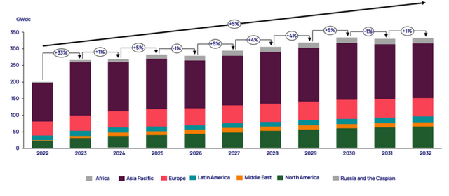 根據調研(yan)機構Wood Mackenzie公司日前(qian)進行的預計(ji),2023年(nian)全球新增的光伏(fu)系統裝(zhuang)機容量將達到(dao)(dao)(dao)270GW,如果最終數據得到(dao)(dao)(dao)證實(shi),其裝(zhuang)機容量與2022年(nian)(nian)相(xiang)比將大幅增(zeng)(zeng)長(chang)(chang)33%。然而該公司預計(ji),到(dao)(dao)(dao)2024年(nian)(nian)的增(zeng)(zeng)長(chang)(chang)率(lv)將降(jiang)到(dao)(dao)(dao)1%,到(dao)(dao)(dao)2025年(nian)(nian)將再(zai)次(ci)增(zeng)(zeng)長(chang)(chang)到(dao)(dao)(dao)5%,而到(dao)(dao)(dao)2026年(nian)(nian)可能會下降(jiang)到(dao)(dao)(dao)1%。 到2032年(nian)全(quan)球主要國家(jia)和地區安裝的光伏系(xi)統(tong)裝機容量 值得關注的(de)是,到2032年,包括中國在內的(de)亞太(tai)地區將(jiang)主導全球光(guang)伏市場。 Wood Mackenzie公司表示,中國光伏組(zu)件制造(zao)能力的顯著(zhu)提升正將全球(qiu)光(guang)伏市(shi)場推(tui)向前所(suo)未有的高度(du)。 該(gai)公司(si)表示:“中國(guo)光伏(fu)組件制(zhi)造業產(chan)能的大(da)規(gui)(gui)(gui)模擴張正將全球光伏(fu)系統安裝量推至創紀錄水平(ping)。光伏(fu)開發商正在(zai)利用多晶(jing)硅價格暴跌的機會,盡(jin)管增加(jia)了棄(qi)電(dian)風險,但仍在(zai)迅速擴大(da)公用事(shi)業規(gui)(gui)(gui)模光伏(fu)系統的開發規(gui)(gui)(gui)模。” 該報告指出,中國在全球光(guang)(guang)伏(fu)(fu)制造(zao)領域具有重大影(ying)響力,并預(yu)計中國可能從出口光(guang)(guang)伏(fu)(fu)組件轉(zhuan)向專(zhuan)注于行(xing)業上游的光(guang)(guang)伏(fu)(fu)電池和硅片(pian)。美國、歐洲和印(yin)度(du)對(dui)本土(tu)光(guang)(guang)伏(fu)(fu)組件制造(zao)業的政(zheng)策激勵在不(bu)久的將來不(bu)太(tai)可能顯著侵蝕中國的市場份(fen)額。