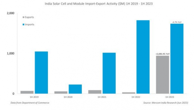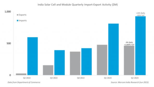 根據美國商務部日前發布的一份研究報告,印度在2023年第二季度(Q2)出口了4.638億美元(約合386億盧比)的光伏電池和光伏組件,同比增長了169%。 然而,在季度環比(QoQ)的基礎上,印度光伏電池和光伏組件的出口額從2023年第一季度的4.788億美元(約合399億盧比)下降了3.1%。而光伏組件約占該國光伏產品出口總額的98%。 在今年第一季度增長的基礎上,印度2023年上半年光伏產品出口額大幅增長2,696.4%,而去年出口額同期為3,370萬美元(約合28億盧比)。 圖1 印度2022年第一季度到2023年第一季度光伏電池和光伏組件季度進出口總額 在2023年第二季度,美國仍然是印度光伏產品的最大買家,占印度光伏產品出口總額的98.5%。 美國商務部于2022年12月澄清了反規避調查的范圍,允許進口在非東南亞國家組裝的光伏組件。這一澄清為印度光伏產品制造商提供了向美國出口組件的市場機會,導致最近幾個季度光伏產品出口額顯著上升。 2023年5月,美國總統拜登否決了美國參議院通過的兩黨決議,暫停對從柬埔寨、馬來西亞、泰國和越南進口的光伏組件征收關稅,直到2024年6月結束征收。 南非占印度今年第二季度出口總額的0.8%,而阿富汗、加拿大和阿聯酋各占0.1%。 圖2印度從2019年上半年到2023年上半年的光伏電池和光伏組件進出口總額 印度光伏電池和光伏組件的進口 研究表明,印度光伏電池和光伏組件進口同比增長55.1%,從5.97億美元(約合497億盧比)增長至9.266億美元(約合772億盧比)。 在季度環比中,印度的光伏產品進口額從8.12億美元(約合676億盧比)增長了14.1%。 光伏組件進口量環比增長50.1%,而光伏電池進口量下降4.7%。 在印度政府暫停制造商和組件批準清單法規之后,光伏組件進口量有所增加,暫時允許光伏開發商從國際市場采購光伏組件,直到2024年3月。 2023年第二季度,從中國進口的光伏電池和光伏組件總額占到42.3%,低于上一季度的60%。 其他對印度光伏進口貢獻巨大的國家包括越南、馬來西亞、泰國、香港和柬埔寨。 由于印度與越南和馬來西亞等國簽訂了自由貿易協定(FTA),因此從這些國家的進口比例有所上升。 2023年第二季度,越南和馬來西亞分別占印度光伏電池和光伏組件進口總量的19%和18.3%。 然而,在2023年上半年,印度光伏電池和光伏組件的進口量與前一年相比下降了4.7%,由于印度的光伏開發商和光伏組件制造商在2022年4月基本關稅(BCD)實施之前囤積光伏電池和光伏組件,因此2022年的進口量要高得多。 上一篇: 美商務部公布對中國太陽能板制造商征稅決定