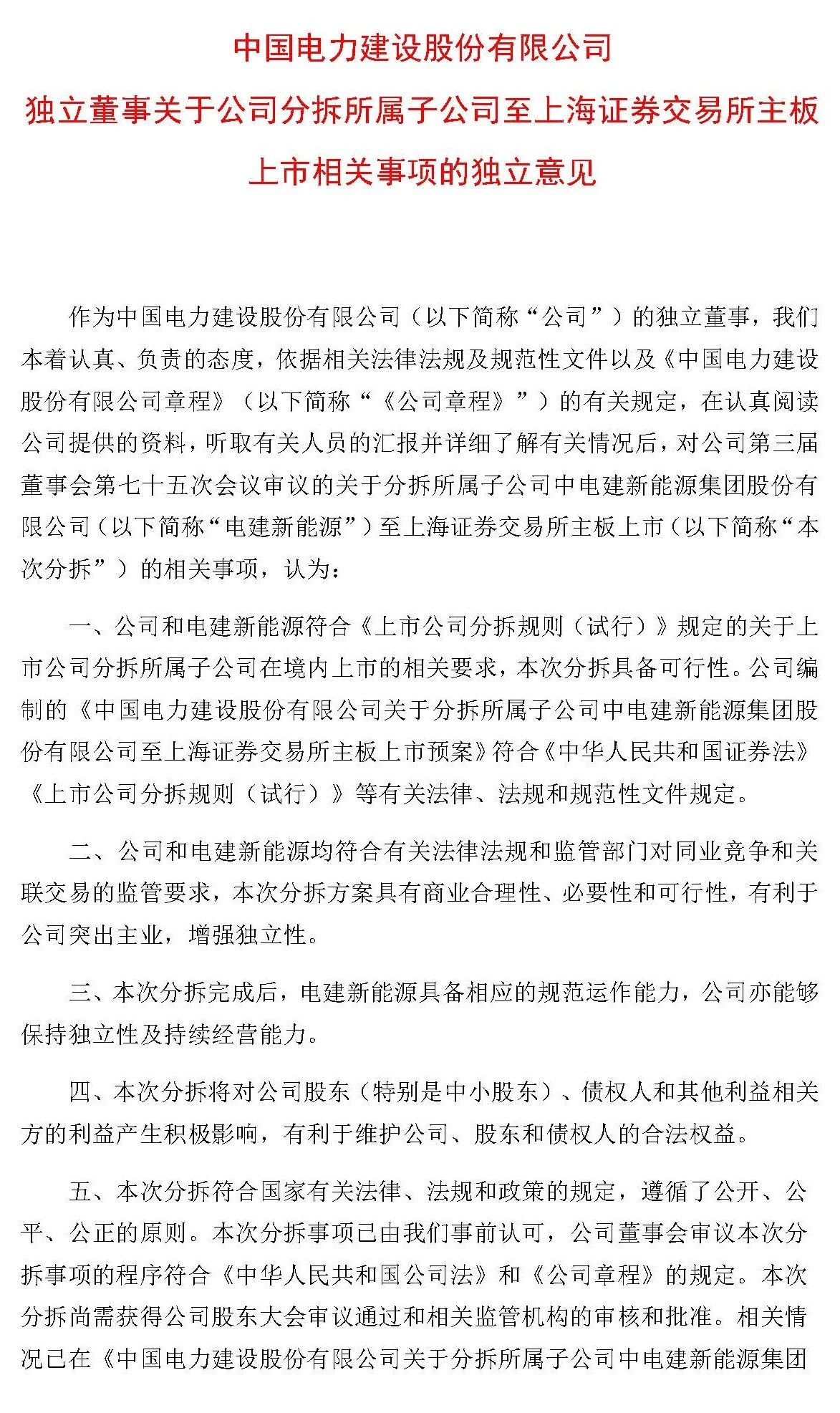 8月24日,中(zhong)(zhong)國(guo)電建發(fa)(fa)布(bu)公(gong)告(gao)稱,擬分拆所(suo)(suo)屬子(zi)公(gong)司(si)中(zhong)(zhong)電建新(xin)能(neng)源集團股份有限(xian)公(gong)司(si)(簡稱“電建新(xin)能(neng)源”)至上(shang)(shang)海證券交易所(suo)(suo)主(zhu)板上(shang)(shang)市。電建新(xin)能(neng)源將在獲取上(shang)(shang)交所(suo)(suo)批(pi)準及(ji)中(zhong)(zhong)國(guo)證監會同意(yi)注冊后擇機發(fa)(fa)行。 本次分拆完成后,中(zhong)國(guo)電(dian)建將(jiang)繼(ji)續(xu)立足大基建,聚焦“水、能(neng)、砂、城、數”核心(xin)主業(ye)(ye)(ye),集成投建營一體化,推進全(quan)球(qiu)化發(fa)展(zhan)(zhan),在工程領域為全(quan)球(qiu)客戶提供(gong)投融資(zi)、規(gui)劃(hua)設計、施工承包(bao)、裝備(bei)制造、管理(li)運(yun)營全(quan)產業(ye)(ye)(ye)鏈(lian)一體化集成服務(wu)(wu)(wu)、一攬子整(zheng)體解決方案;電(dian)建新能(neng)源將(jiang)堅持中(zhong)國(guo)電(dian)建旗下從事中(zhong)國(guo)境(jing)內風力(li)(li)發(fa)電(dian)、太(tai)陽(yang)能(neng)發(fa)電(dian)項目開(kai)發(fa)、投資(zi)、運(yun)營和管理(li)業(ye)(ye)(ye)務(wu)(wu)(wu)的唯(wei)一平臺業(ye)(ye)(ye)務(wu)(wu)(wu)定位不(bu)動(dong)搖(yao),借助資(zi)本市(shi)場(chang)力(li)(li)量迅(xun)速增強自身資(zi)本實力(li)(li),把握(wo)行業(ye)(ye)(ye)發(fa)展(zhan)(zhan)機(ji)遇,提高市(shi)場(chang)競爭力(li)(li),擴大業(ye)(ye)(ye)務(wu)(wu)(wu)布局,扎穩高質量發(fa)展(zhan)(zhan)根基,進而促使中(zhong)國(guo)電(dian)建未來整(zheng)體盈利水平顯(xian)著(zhu)提高。