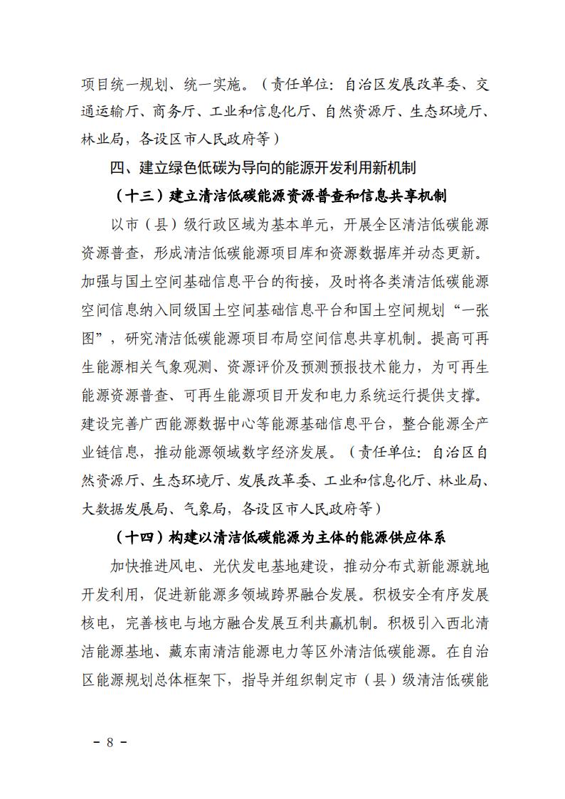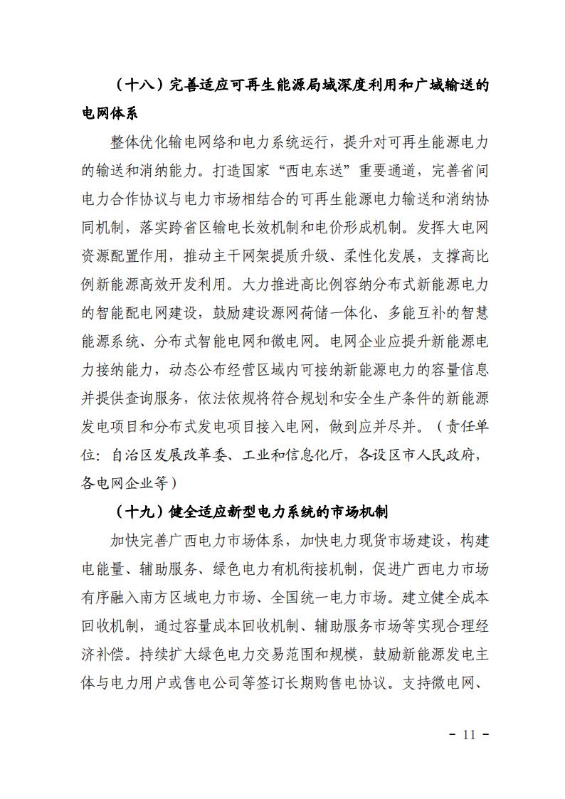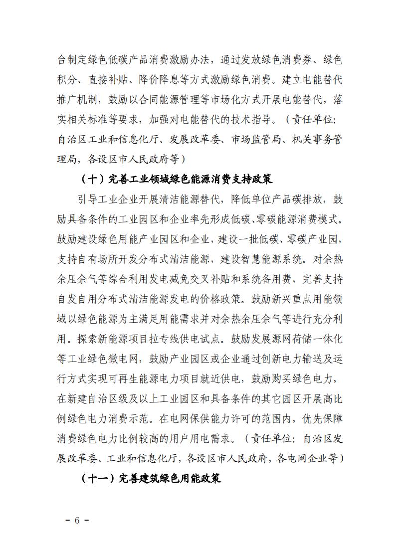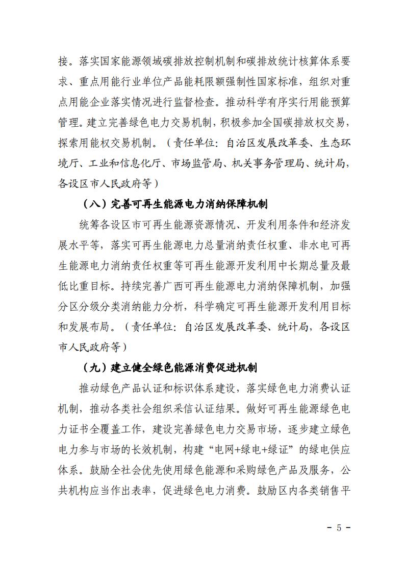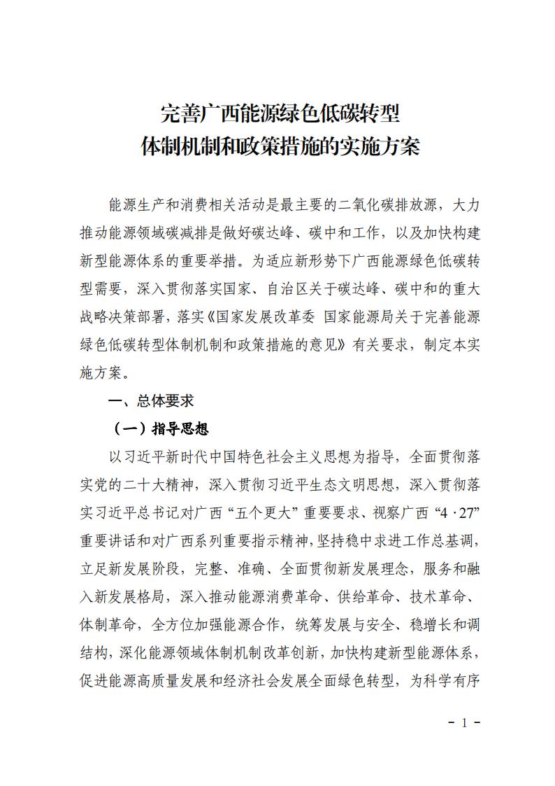 9月1日,廣西壯族自治區(qu)發(fa)展和(he)改革委(wei)員會發(fa)布關于印發(fa)《完善廣西能(neng)源(yuan)綠(lv)色低(di)碳轉(zhuan)型(xing)體制機(ji)制和(he)政策措施的(de)實施方案》(以(yi)下簡稱《方案》)的(de)通知(zhi)。 《方案(an)》指出,探索新能源(yuan)項目拉專(zhuan)線供電試點。鼓勵發展(zhan)源(yuan)網(wang)(wang)荷儲一體化等工(gong)業(ye)綠(lv)色微電網(wang)(wang),鼓勵產業園區或(huo)企業通(tong)過(guo)創新(xin)電力(li)輸(shu)送及運行方式實現可再生能源電力(li)項(xiang)目就近供電,鼓勵購買綠色(se)(se)電力(li),在(zai)新(xin)建自(zi)治區級及以(yi)上工業園區和具備條件的其它(ta)園區開展高比例(li)綠色(se)(se)電力(li)消費示范(fan)(fan)。在(zai)電網(wang)保供能力(li)許可的范(fan)(fan)圍(wei)內,優(you)先保障(zhang)消費綠色(se)(se)電力(li)比例(li)較高的用戶用電需求。 提高建(jian)(jian)(jian)筑(zhu)(zhu)終端電氣化水(shui)平,加快(kuai)建(jian)(jian)(jian)設(she)“光儲直柔”建(jian)(jian)(jian)筑(zhu)(zhu)、 微電網智(zhi)能(neng)建(jian)(jian)(jian)筑(zhu)(zhu)等。積極(ji)推廣使用超低能(neng)耗建(jian)(jian)(jian)筑(zhu)(zhu)和綠(lv)(lv)色(se)(se)建(jian)(jian)(jian)材(cai),推行低碳(tan)產(chan)(chan)品(pin)(pin)、綠(lv)(lv)色(se)(se)產(chan)(chan)品(pin)(pin)、綠(lv)(lv)色(se)(se)建(jian)(jian)(jian)材(cai)產(chan)(chan)品(pin)(pin)等相關(guan)認(ren)證(zheng),在政府采購(gou) 中(zhong)優(you)先采購(gou)列入品(pin)(pin)目(mu)清單(dan)并獲得綠(lv)(lv)色(se)(se)低碳(tan)產(chan)(chan)品(pin)(pin)認(ren)證(zheng)的相關(guan)產(chan)(chan)品(pin)(pin)。 開(kai)展(zhan)多(duo)能(neng)(neng)融合(he)交通供能(neng)(neng)場站建設, 推進新能(neng)(neng)源汽車(che)與(yu)電網能(neng)(neng)量互動試(shi)點,推動車(che)樁、船(chuan)岸(an)協同發展(zhan), 打造油氣氫電多(duo)元供能(neng)(neng)的綜合(he)供能(neng)(neng)服(fu)務(wu)站網絡(luo)。 原文如下: 廣西(xi)壯族自治區發展(zhan)和(he)改革委員會(hui)關于印發《完(wan)善廣西(xi)能源綠(lv)色低(di)碳(tan)轉(zhuan)型體制(zhi)機制(zhi)和(he)政(zheng)策措施(shi)的(de)實施(shi)方案》的(de)通知(zhi) 各(ge)(ge)設(she)區市(shi)人民政(zheng)府(fu),自治區人民政(zheng)府(fu)各(ge)(ge)組成(cheng)部門、各(ge)(ge)直屬機(ji)構,各(ge)(ge)有關單位,各(ge)(ge)電網企業: 經(jing)自治區人民政府同意,現(xian)將《完善廣(guang)西能(neng)源綠色低(di)碳轉型體制(zhi)機制(zhi)和政策措(cuo)施(shi)的實(shi)施(shi)方(fang)案》印發給你們(men),請認真組織實(shi)施(shi)。 廣西(xi)壯族(zu)自治區發展和改革委(wei)員會 2023年8月9日