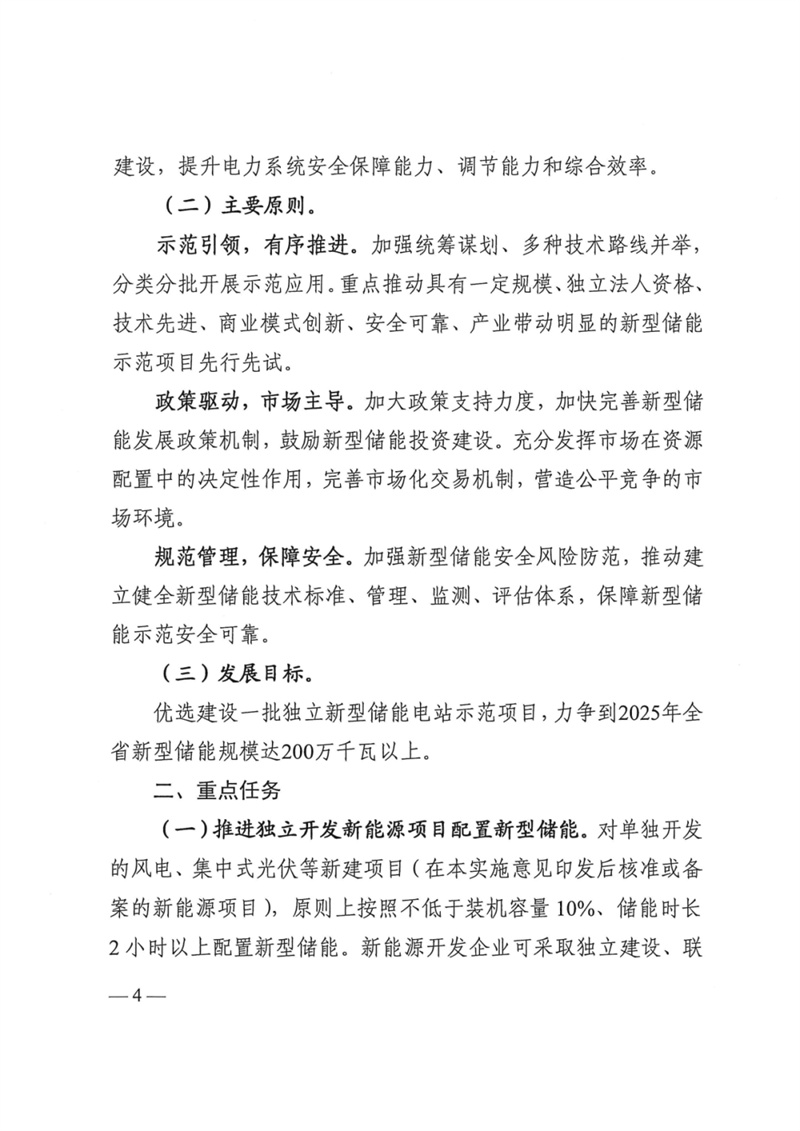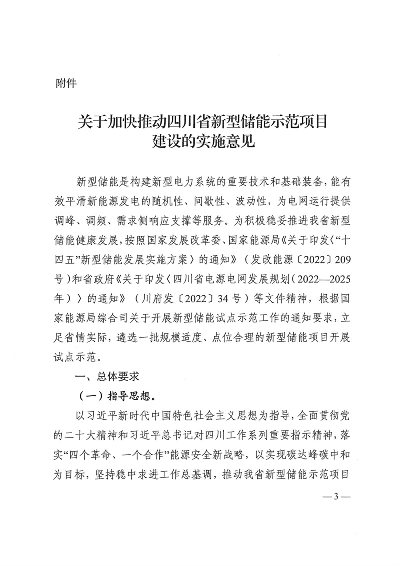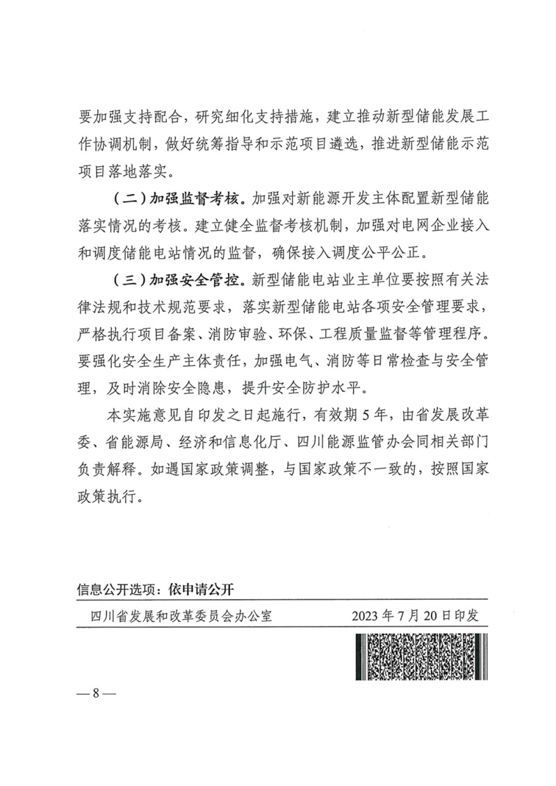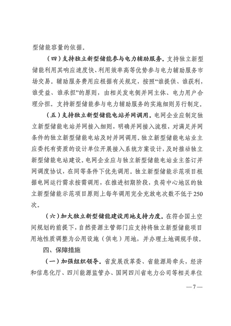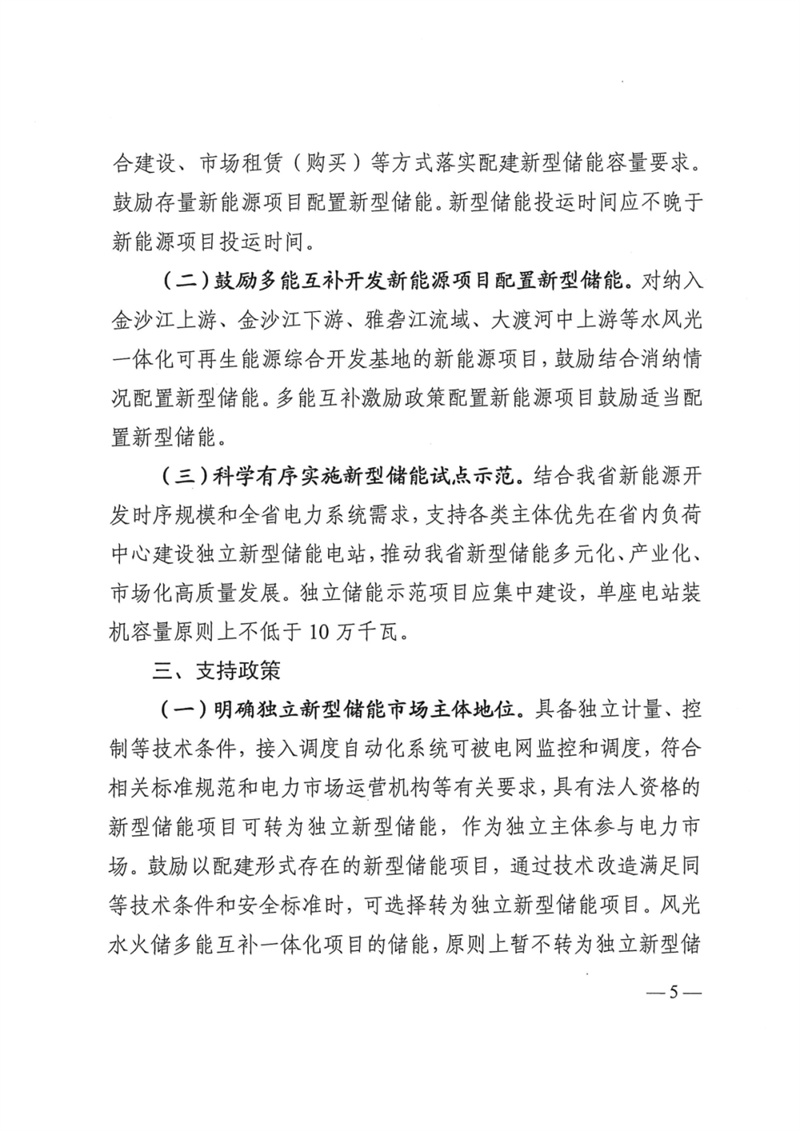 9月11日,四川省發改委、四川省能源局、四川省經濟和信息化廳、國家能源局四川監管辦公室聯合印發了《關于加快推動四川省新型儲能示范項目建設的實施意見》(以下簡稱《實施意見》),有效期5年。《實施意見》提出,優選建設一批獨立新型儲能電站示范項目,力爭到2025年全省新型儲能規模達200萬千瓦以上。 重點任務: 1.推進獨立開發新能源項目配置新型儲能。要求為不低于裝機容量10%,時長2小時以上。 2.鼓勵多能互補開發新能源項目配置新型儲能。對納入金沙江上游、金沙江下游、雅礱江流域、大渡河中上游等水風光一體化可再生能源綜合開發基地的新能源項目,鼓勵結合消納情況配置新型儲能。 3.有序推進儲能試點示范。支持各類主體優先再省內負荷中心建設獨立新型儲能電站,推動新型儲能多元化/產業化/市場化發展。獨立儲能示范項目應集中建設,單座電站裝機容量原則上不低于10萬千瓦。 支持政策: 1.明確獨立新型儲能市場主體地位。符合條件和標準的,具有法人資格的新型儲能項目可轉為獨立新型儲能,作為獨立主體參與電力市場。鼓勵以配建形式存在的新型儲能項目,可選擇轉為獨立新型儲能項目。風光水火儲多能互補一體化項目的儲能,原則上暫不轉為獨立新型儲能。 2.支持獨立新型儲能參與市場交易。進入電力現貨市場前,儲能電站作為獨立市場主體參與市場中長期交易。充電時,可作為電力市場用戶享受分時電價政策;放電時,參加火電市場化交易,價格由市場形成。 獨立新型儲能電站向電網送電的,其相應充電電量不承擔輸配電價和政府性基金及附加,充放電損耗電費由獨立新型儲能電站承擔。 進入電力現貨市場后,獨立新型儲能電站用電電價、上網電價按照現貨市場價格及規則結算。 3.建立獨立新型儲能容量共享租賃機制。建議參考區間為200-400元/千瓦年。鼓勵新能源開發企業和獨立儲能新型儲能項目業主單位簽訂長期租賃協議合同。 4.支持獨立新型儲能參與電力輔助服務。 5.支持獨立新型儲能電站并網調用。電網企業應與獨立新型儲能電站業主簽訂并網調度協議,同等條件下優先調用。原則上每年調用完全充放電次數不低于250次。 原文如下: