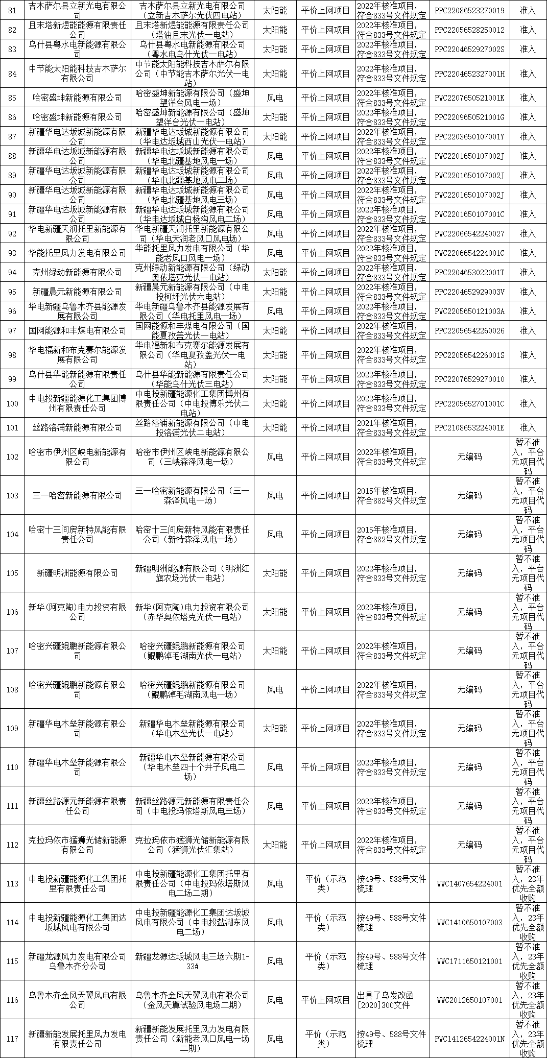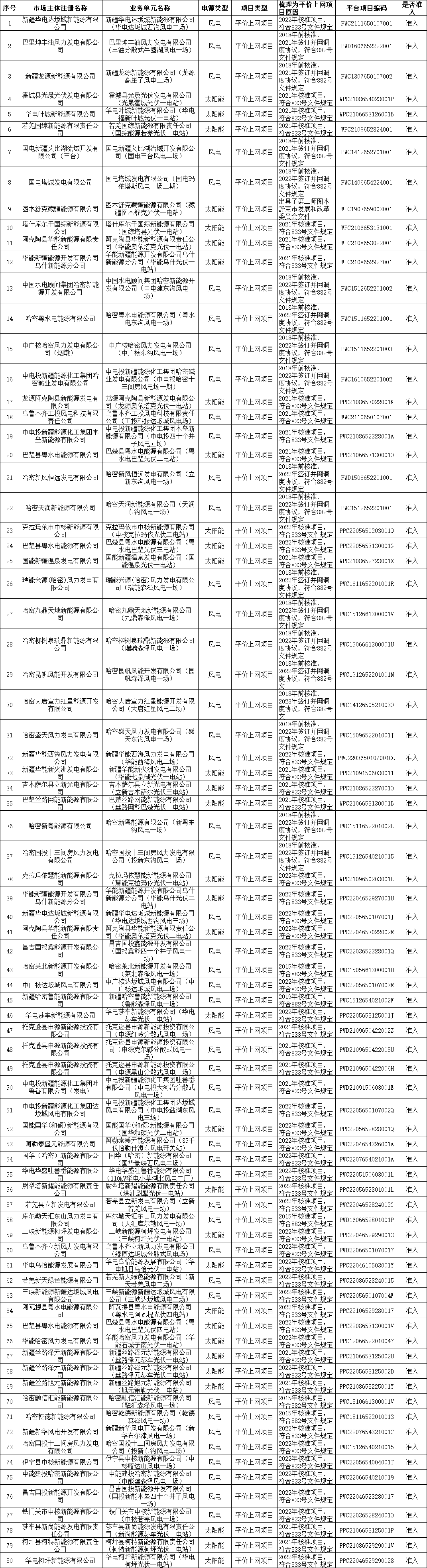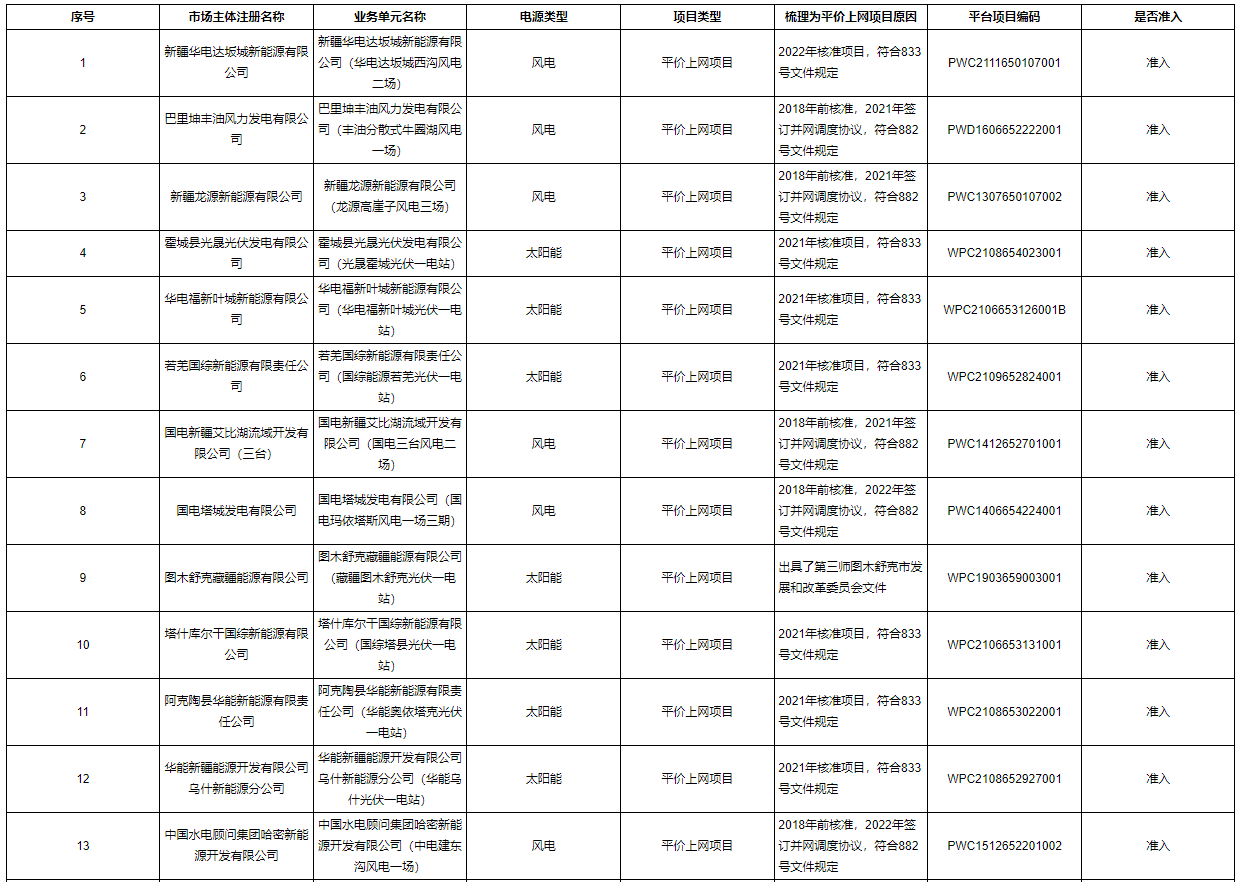 近日,新疆電力交易中心發布關于關于2023年9月第一批綠電交易發電企業準入名單的公告、2023年9月第二批綠電交易發電企業準入名單的公告,第一批綠電交易發電企業共110家。第二批綠電交易發電企業共117家。 詳情如下: 新疆電力交易中心有限公司關于2023年9月第一批綠電交易發電企業準入名單的公告 各發電企業: 新疆電力交易中心有限公司按照《自治區發展改革委關于組織開展新疆綠色電力交易相關事宜的復函》和《新疆綠色電力交易方案(試行)》相關要求梳理綠電交易準入名單。梳理標準為:“綠色電力交易的發電企業主要為未納入國家可再生能源電價附加補助政策范圍內的風電和光伏企業。企業應在國家可再生能源信息管理平臺完成注冊并取得項目代碼,且具備綠證發放資格。” 新疆電力交易中心有限公司按照《國家能源局關于公布風電平價上網示范項目的通知》(國能發新能〔2017〕49號)、《國家發展改革委辦公廳 國家能源局綜合司關于公布2020年風電、光伏發電平價上網項目的通知》(發改辦能源〔2020〕588號)、《國家發展改革委關于完善風電上網電價政策的通知》(發改價格〔2019〕882號)和《國家發改委關于2021年新能源上網電價政策有關事項的通知》(發改價格〔2021〕833號)梳理平價上網項目名單。國家可再生能源信息管理平臺項目代碼通過新疆電力交易平臺發電企業機組參數信息“項目代碼”字段抽取。綠電交易發電企業準入情況如下表。 新疆電力交易中心有限公司關于2023年9月第二批綠電交易發電企業準入名單的公告 各發電企業: 新疆電力交易中心有限公司按照《自治區發展改革委關于組織開展新疆綠色電力交易相關事宜的復函》和《新疆綠色電力交易方案(試行)》相關要求梳理綠電交易準入名單。梳理標準為:“綠色電力交易的發電企業主要為未納入國家可再生能源電價附加補助政策范圍內的風電和光伏企業。企業應在國家可再生能源信息管理平臺完成注冊并取得項目代碼,且具備綠證發放資格。” 新疆電力交易中心有限公司按照《國家能源局關于公布風電平價上網示范項目的通知》(國能發新能〔2017〕49號)、《國家發展改革委辦公廳 國家能源局綜合司關于公布2020年風電、光伏發電平價上網項目的通知》(發改辦能源〔2020〕588號)、《國家發展改革委關于完善風電上網電價政策的通知》(發改價格〔2019〕882號)和《國家發改委關于2021年新能源上網電價政策有關事項的通知》(發改價格〔2021〕833號)梳理平價上網項目名單。國家可再生能源信息管理平臺項目代碼通過新疆電力交易平臺發電企業機組參數信息“項目代碼”字段抽取。綠電交易發電企業準入情況如下表。 其他發電企業也可以在新疆電力交易平臺提交平價上網項目證明材料(參照發電企業重大信息變更流程),經過公示后納入綠電交易準入名單。 參照政策如下: 1.《國家發展改革委關于完善風電上網電價政策的通知》(發改價格〔2019〕882號):“2018年底之前核準的陸上風電項目,2020年底前仍未完成并網的,國家不再補貼;2019年1月1日至2020年底前核準的陸上風電項目,2021年底前仍未完成并網的,國家不再補貼。自2021年1月1日開展,新核準的陸上風電項目全面實現平價上網,國家不再補貼”。 2.《國家發改委關于2021年新能源上網電價政策有關事項的通知》(發改價格〔2021〕833號):“2021年起,對新備案集中式光伏電站、工商業分布式光伏項目和新核準陸上風電項目。中央財政不再補貼,實行平價上網。” 上述內容接收個人或組織提出的異議,異議可通過郵箱反饋或電話聯系。 聯系人:楊玉榮 0991-2926334 郵箱:xjdljyfk@163.com 新疆電力交易中心有限公司 2023年9月8日 上一篇: 華電重工擬投建20萬噸光伏支架項目