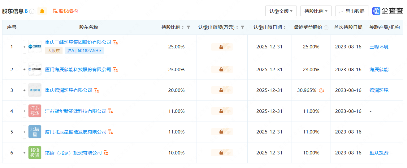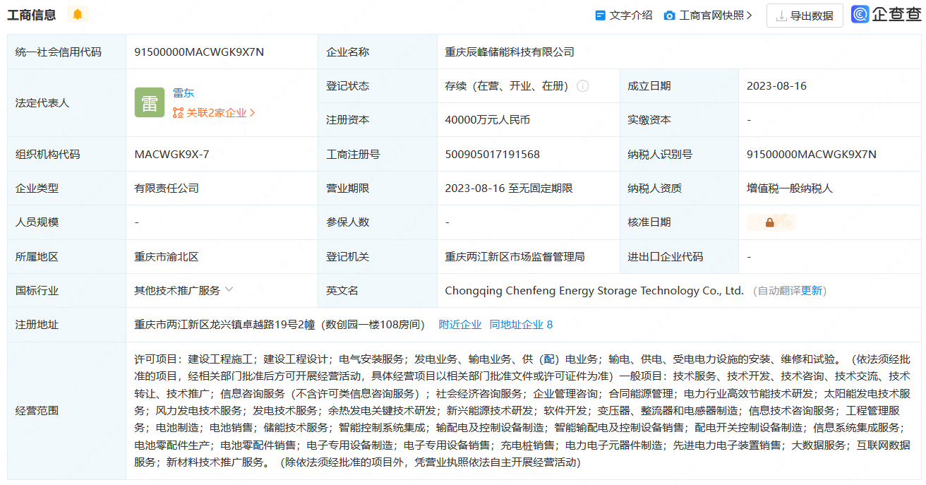 企(qi)查查顯示,近(jin)日,重慶辰(chen)峰儲能科技(ji)有限公司成立,注冊(ce)資本(ben)4億元人民幣,經(jing)營范圍(wei)包含(han):電(dian)池制造;儲能技(ji)術服(fu)務;充電(dian)樁(zhuang)銷售;電(dian)力電(dian)子元器件制造等(deng)。 據悉,該公(gong)司由三峰環境、海辰儲能等共同持股。