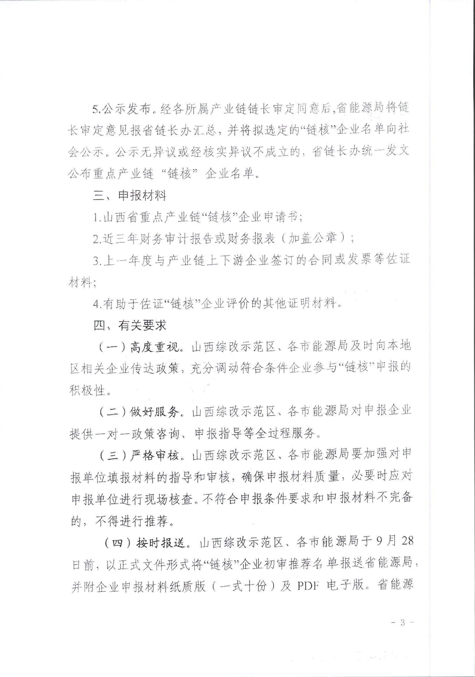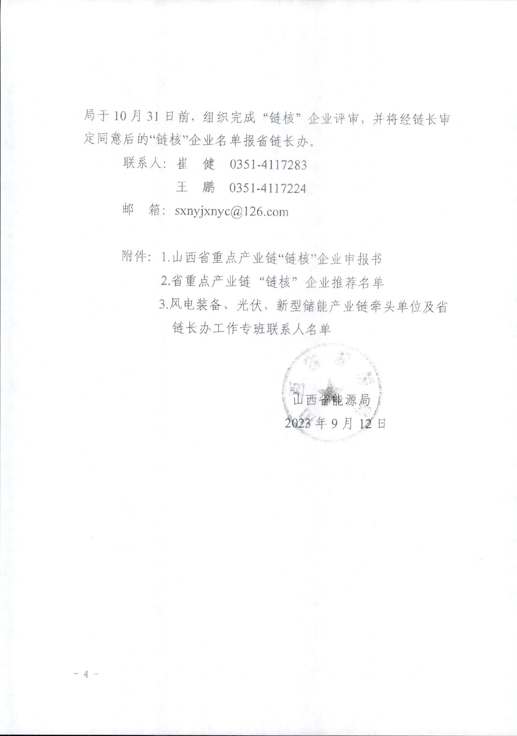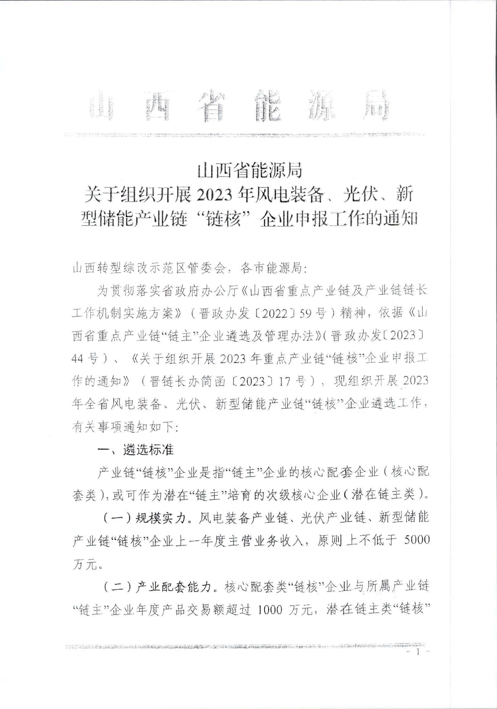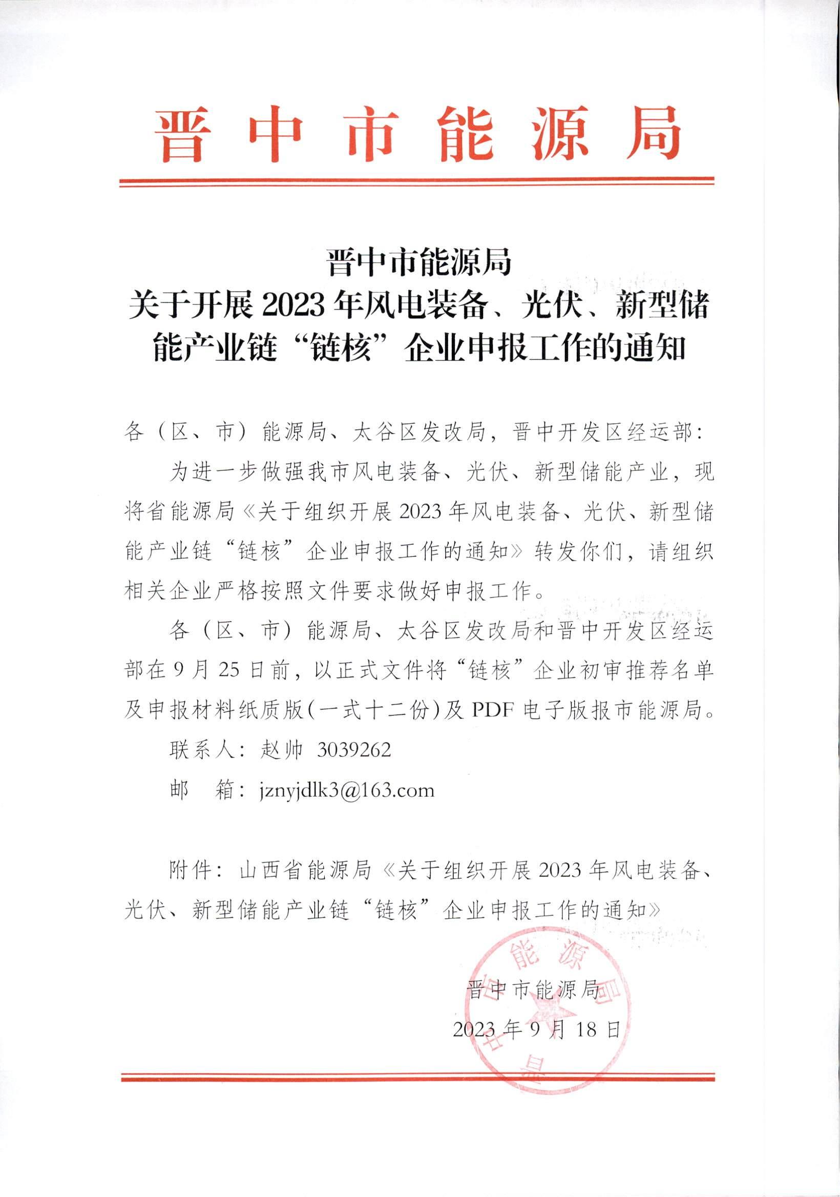 平遙(yao)縣能(neng)源(yuan)局發布《關于(yu)開展2023年(nian)(nian)風(feng)電(dian)裝備、光伏、新(xin)型儲能(neng)產業(ye)鏈(lian)(lian)(lian)“鏈(lian)(lian)(lian)核(he)”企(qi)業(ye)申報工作(zuo)的通知》。《通知》指出,遴(lin)選標準要求(qiu):山西省(sheng)風(feng)電(dian)裝備、光伏、新(xin)型儲能(neng)產業(ye)鏈(lian)(lian)(lian)“鏈(lian)(lian)(lian)核(he)”企(qi)業(ye)上一年(nian)(nian)度主營業(ye)務收入,原則上不低(di)于(yu)5000萬元(yuan)。 原文如下: 關(guan)于開展2023年風電裝備光伏新型儲(chu)能產業鏈(lian)鏈(lian)核企業申報工作(zuo)的通知 各企業: 現將(jiang)《省市能源局關于開展2023年風電裝備、光伏、新型儲能產業鏈(lian)“鏈(lian)核(he)”企(qi)業申報工作的(de)通知》公布(bu),如有符合條件(jian)項(xiang)目(mu),請根(gen)據(ju)省市文(wen)件(jian)要求,于9月(yue)22日(ri)前將(jiang)申報文(wen)件(jian)申報材料及PDF電子版報縣能源局。 聯 系 人(ren):李杰、李田才(cai) 聯系電話:5667366 郵 箱:pyxnyjbg@163.com