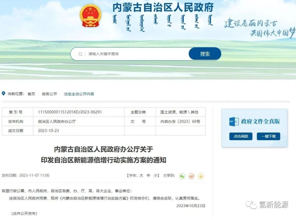 內蒙古新能源倍增行動:2030年新能源裝機300GW!綠氫產能50萬噸,制氫設備產能1000臺套!2023-11-09 16:02瀏覽數:980次
