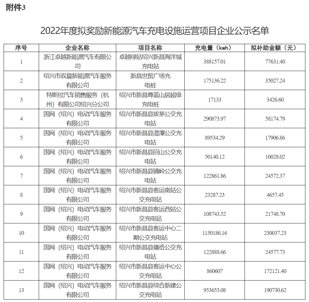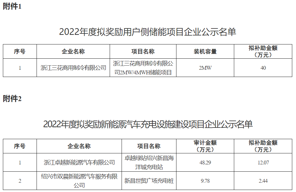 11月6日,浙江省紹興市(shi)新昌縣人民政府,公布了(le)2022年度用戶側儲(chu)能(neng)項目(mu)和新能(neng)源汽車充(chong)電設(she)施建設(she)、運營項目(mu)補貼金額,16個項目(mu)共補貼87萬多(duo)元。其中(zhong)用戶側儲(chu)能(neng)項目(mu)僅有一例,浙江三花(hua)商用(yong)制(zhi)冷有限公司2MW/4MWh儲能(neng)(neng)項(xiang)(xiang)目獲得了2022年(nian)用(yong)戶(hu)側儲能(neng)(neng)項(xiang)(xiang)目補貼40萬(wan)元。 關于2022年度用(yong)戶側儲能項目和 新能(neng)源汽車(che)充(chong)電(dian)設施建設、運(yun)營項目補(bu)貼金額的公示 根據《關(guan)于印發新(xin)昌縣(xian)2022年(nian)(nian)(nian)度(du)非戶用(yong)分布式(shi)光伏項(xiang)(xiang)目(mu)及(ji)用(yong)戶側儲(chu)能(neng)項(xiang)(xiang)目(mu)獎補實施(shi)細則的通(tong)知》(新(xin)發改能(neng)源〔2023〕61號)、《關(guan)于開展(zhan)2022年(nian)(nian)(nian)度(du)新(xin)昌縣(xian)新(xin)能(neng)源汽車充(chong)電(dian)(dian)(dian)設施(shi)建設及(ji)充(chong)電(dian)(dian)(dian)設施(shi)運(yun)(yun)營獎勵資金申報(bao)(bao)工作的通(tong)知》等文件精(jing)神,縣(xian)發改局(ju)對(dui)上報(bao)(bao)的用(yong)戶側儲(chu)能(neng)項(xiang)(xiang)目(mu)和(he)新(xin)能(neng)源汽車充(chong)電(dian)(dian)(dian)設施(shi)建設、運(yun)(yun)營項(xiang)(xiang)目(mu)的補貼(tie)資料進行了審查和(he)核對(dui),現將對(dui)符合(he)要求企業和(he)項(xiang)(xiang)目(mu)的相關(guan)信息及(ji)擬補助金額予以(yi)(yi)公示。公示期限為2023年(nian)(nian)(nian)11月6日—2023年(nian)(nian)(nian)11月12日。在(zai)公示期限內(nei),如(ru)有異議(yi),請以(yi)(yi)書面形式(shi)反饋給縣(xian)發改局(ju)能(neng)源科,聯系電(dian)(dian)(dian)話:86019958。 附件(jian):1.2022年度擬獎勵(li)用戶側儲能(neng)項目企(qi)業公示名單 2.2022年度擬獎勵新能源汽車充電設施建設項目企業公(gong)示(shi)名單 3.2022年(nian)度擬獎勵新(xin)能源汽車充電設施運營(ying)項(xiang)目企業公(gong)示名單 新昌縣(xian)發展和改革局 2023年11月(yue)6日(ri)