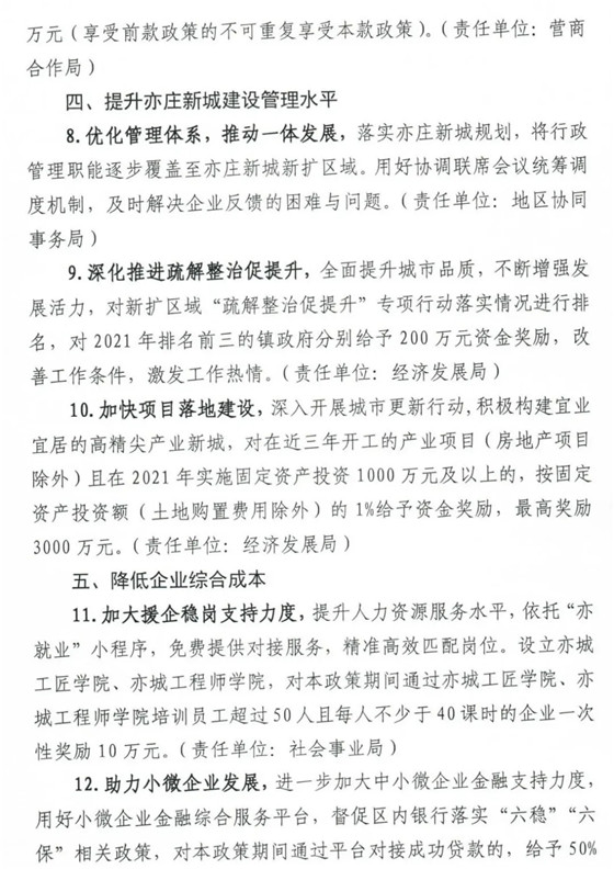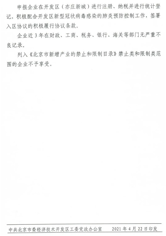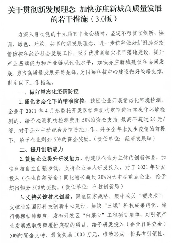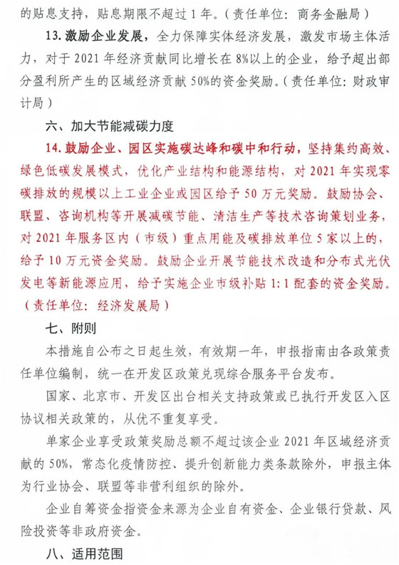 4月28日,北京經濟技術開發區管理委員會印發《關于貫徹新發展理念加快亦莊新城高質量發展的若干措施(3.0版)》(以下簡稱《措施》),《措施》明確指出,鼓勵企業、園區實施碳達峰和碳中和行動,堅持集約高效、綠色低碳發展模式,優化產業結構和能源結構,對2021年實現零碳排放的規模以上工業企業或園區給予50萬元獎勵。鼓勵協會、聯盟、咨詢機構等開展減碳節能、清潔生產等技術咨詢策劃業務,對2021年服務區內(市級)重點用能及碳排放單位5家以上的,給予10萬元資金獎勵。鼓勵企業開展節能技術改造和分布式光伏發電等新能源應用,給予實施企業市級補貼1:1配套的資金獎勵。 《措施》自公布之日起生效,有效期一年,申報指南由各政策責任單位編制,統一在北京經開區政策兌現綜合服務平臺發布。國家、北京市、北京經開區出臺相關支持政策或已執行北京經開區入區協議相關政策的,從優不重復享受。單家企業享受政策獎勵總額不超過該企業2021年區域經濟貢獻的50%,常態化疫情防控、提升創新能力類條款除外,申報主體為行業協會、聯盟等非營利組織的除外。