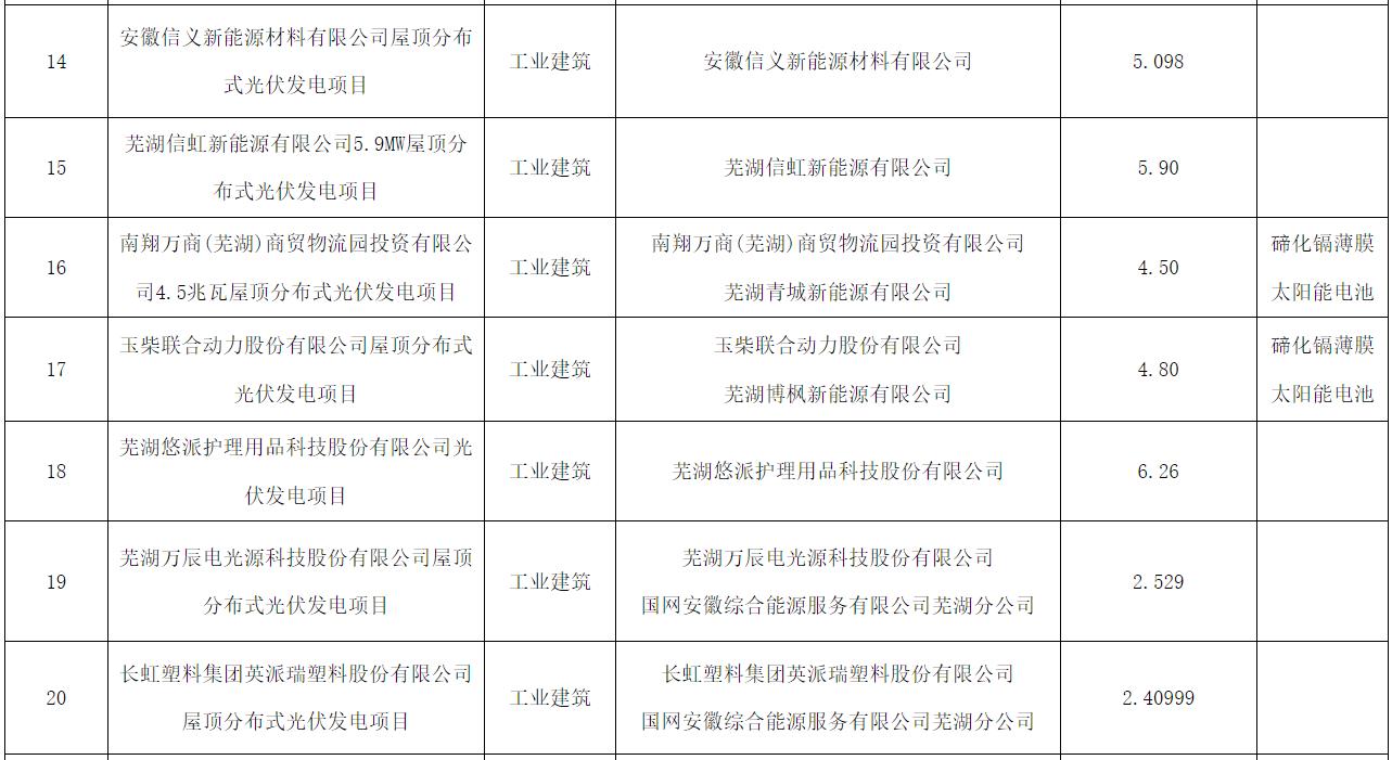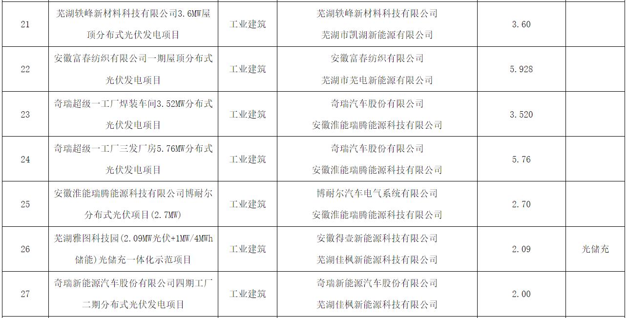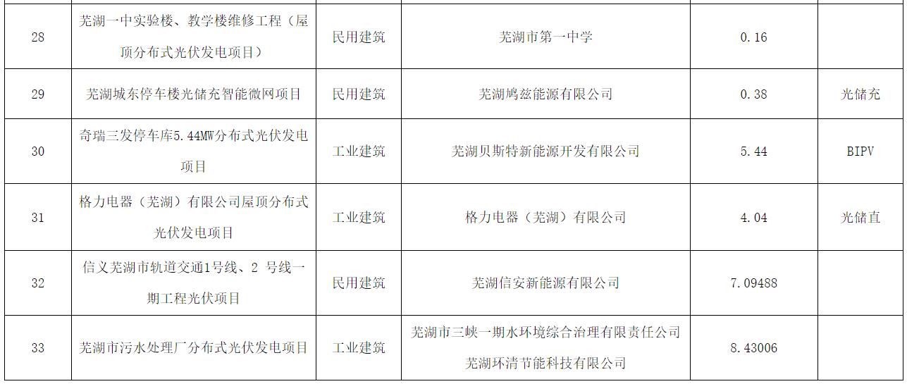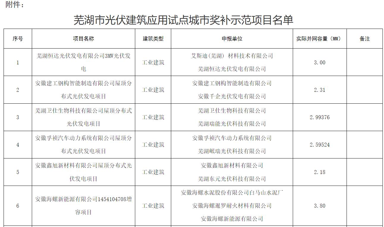 近日,蕪湖(hu)市光伏(fu)建(jian)筑應用試(shi)點(dian)城市(shi)獎(jiang)補(bu)示范項目(mu)公(gong)示結束,安徽省蕪湖市(shi)住建(jian)局(ju)于12月4日(ri)公(gong)布(bu)蕪湖市(shi)光伏(fu)建(jian)筑應用試(shi)點(dian)城市(shi)獎(jiang)補(bu)示范項目(mu)最(zui)終名單,共包(bao)含33個光伏(fu)項目(mu),實際(ji)并(bing)網總容量(liang)130.38893MW。 詳情如下: 各縣市區(qu)住建(jian)局(住交局),江北集(ji)中區(qu)規建(jian)部、經(jing)開區(qu)規建(jian)局、三山經(jing)開區(qu)城(cheng)建(jian)局,各有關單位(wei): 為(wei)貫徹落實(shi)《蕪(wu)湖(hu)市(shi)人民政府關于加(jia)快光(guang)伏(fu)發電推廣應用的(de)(de)實(shi)施意見(jian)(jian)》(蕪(wu)政秘〔2022〕16號)等文件(jian)精神,推進我(wo)市(shi)省級(ji)光(guang)伏(fu)建筑(zhu)應用試點城(cheng)市(shi)示(shi)范工作(zuo),按照《蕪(wu)湖(hu)市(shi)光(guang)伏(fu)建筑(zhu)應用試點城(cheng)市(shi)專項資金管理辦法(fa)》等有關規定(ding),在(zai)項目(mu)廣泛征集(ji)的(de)(de)基礎上(shang),經專家評審、實(shi)地驗收和網上(shang)公示(shi),確定(ding)蕪(wu)湖(hu)城(cheng)東停車樓(lou)光(guang)儲充智能微網項目(mu)等33個項目(mu)列入蕪(wu)湖(hu)市(shi)光(guang)伏(fu)建筑(zhu)應用試點城(cheng)市(shi)獎補示(shi)范項目(mu)(詳見(jian)(jian)附(fu)件(jian)),現予以公布。 各縣市區、開發(fa)區住建部門要進一步落(luo)實(shi)《蕪(wu)湖市人民(min)政(zheng)府關(guan)于(yu)加快光伏發(fa)電(dian)推廣(guang)應用(yong)(yong)的(de)實(shi)施意見(jian)》(蕪(wu)政(zheng)秘〔2022〕16號)等文件(jian)精神,充分發(fa)揮獎補示范項目的(de)示范引領(ling)作(zuo)用(yong)(yong),加快建設(she)領(ling)域光伏發(fa)電(dian)推廣(guang)應用(yong)(yong),助力城鄉建設(she)領(ling)域碳達(da)峰碳中和。 附(fu)件:蕪湖市光伏建(jian)筑應用試點城市獎(jiang)補(bu)示范項目名(ming)單 蕪湖市住房和城鄉(xiang)建設局 2023年12月(yue)4日